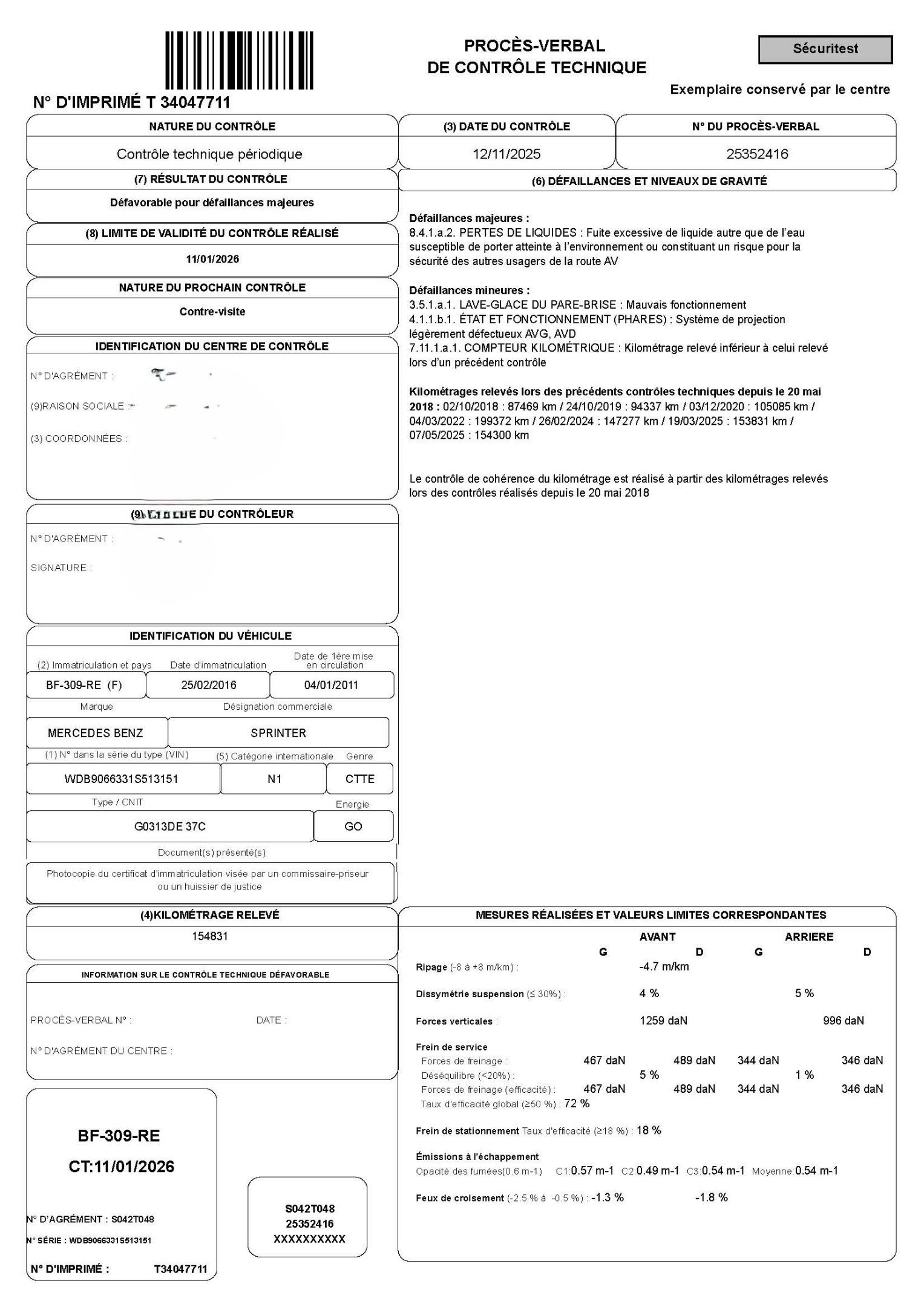 MERCEDES SPRINTER II 906.633 313CDI37 2.2 D Fourgon moyen tôlé 3.2T 129 cv - Type : CTTE - Body : FOURGON - Energy : GO - Color : BLANC - Kilometrage compteur : 154831 - 1ere M.E.C: 04/01/2011 - Power: 7 - VAT recoverable - Copy of registration document / the odometer reading shows an inconsistency: on 04/03/2022: 199372 kms; on 26/02/2024: 142277 kms -> either an error when the odometer was read or a change of engine (?)
