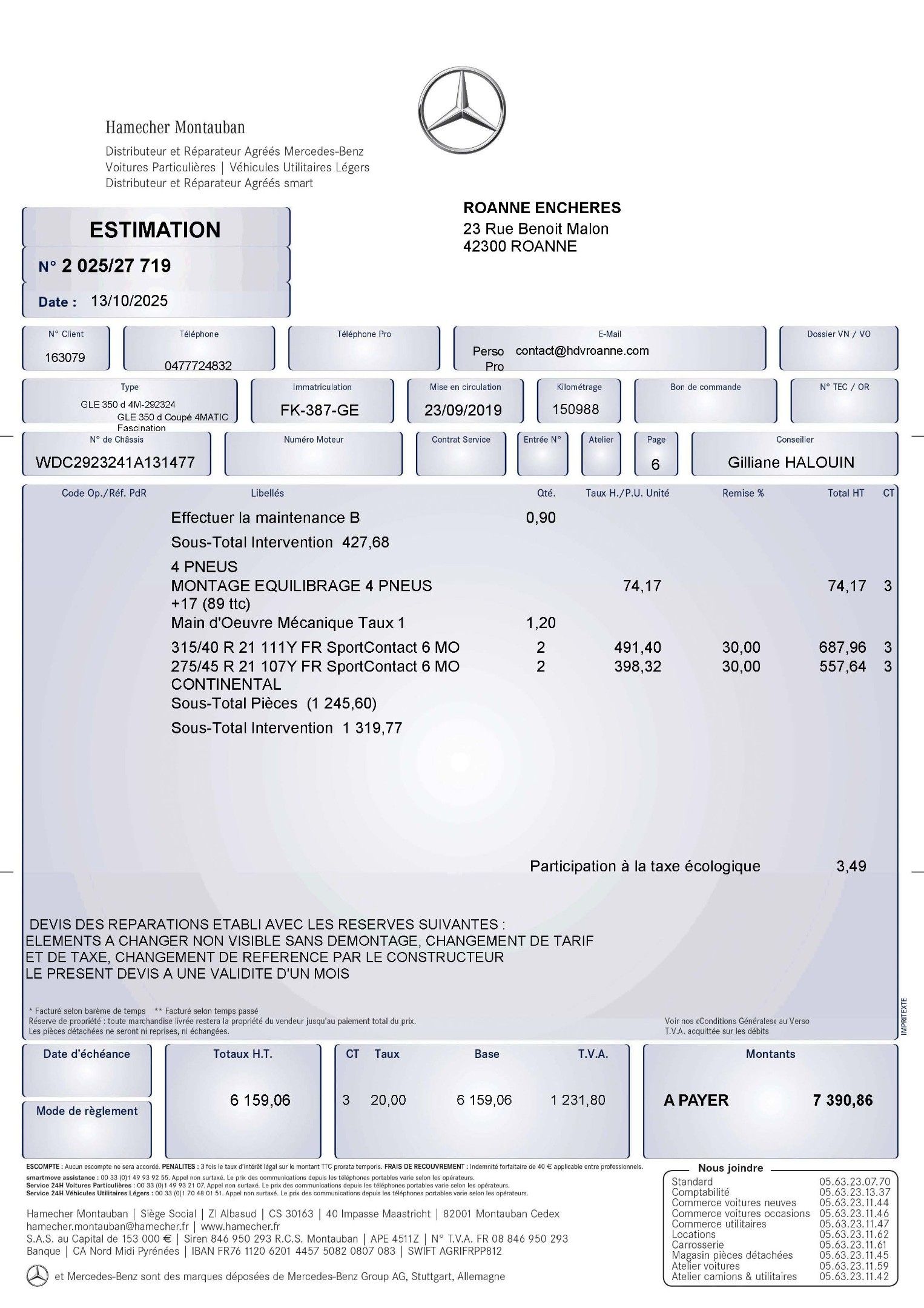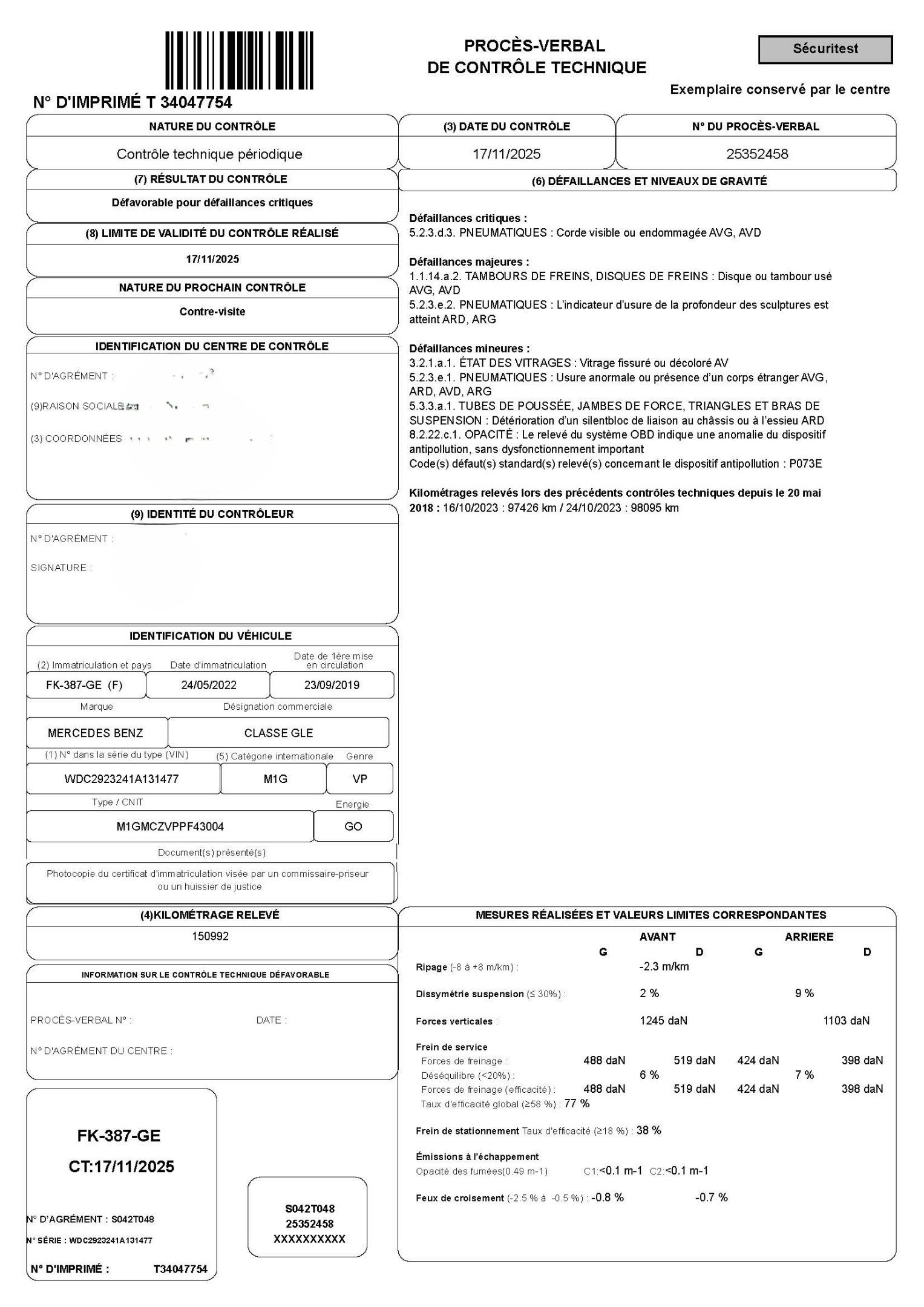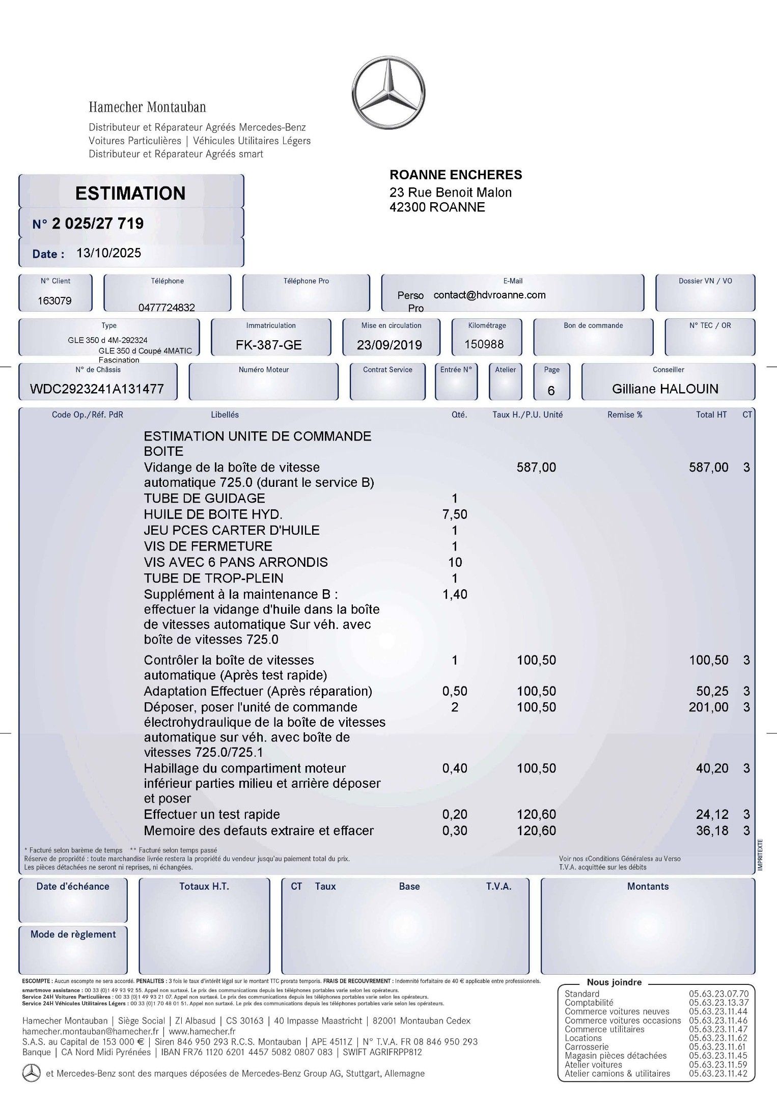 MERCEDES CLASSE GLE SPORTLINE 4MATIC 9G-TRONIC - Type: PC - Body: BREAK - Energy: GO - Colour: BLACK - Odometer reading: 150989 - 1ere M.E.C: 23/09/2019 - Power: 17 - VAT recoverable - Mine type: M1GMCZVPPF43004 - Remarks: UNDER CONSIDERATION: gearbox and regulator failure: see repair estimate in the photos