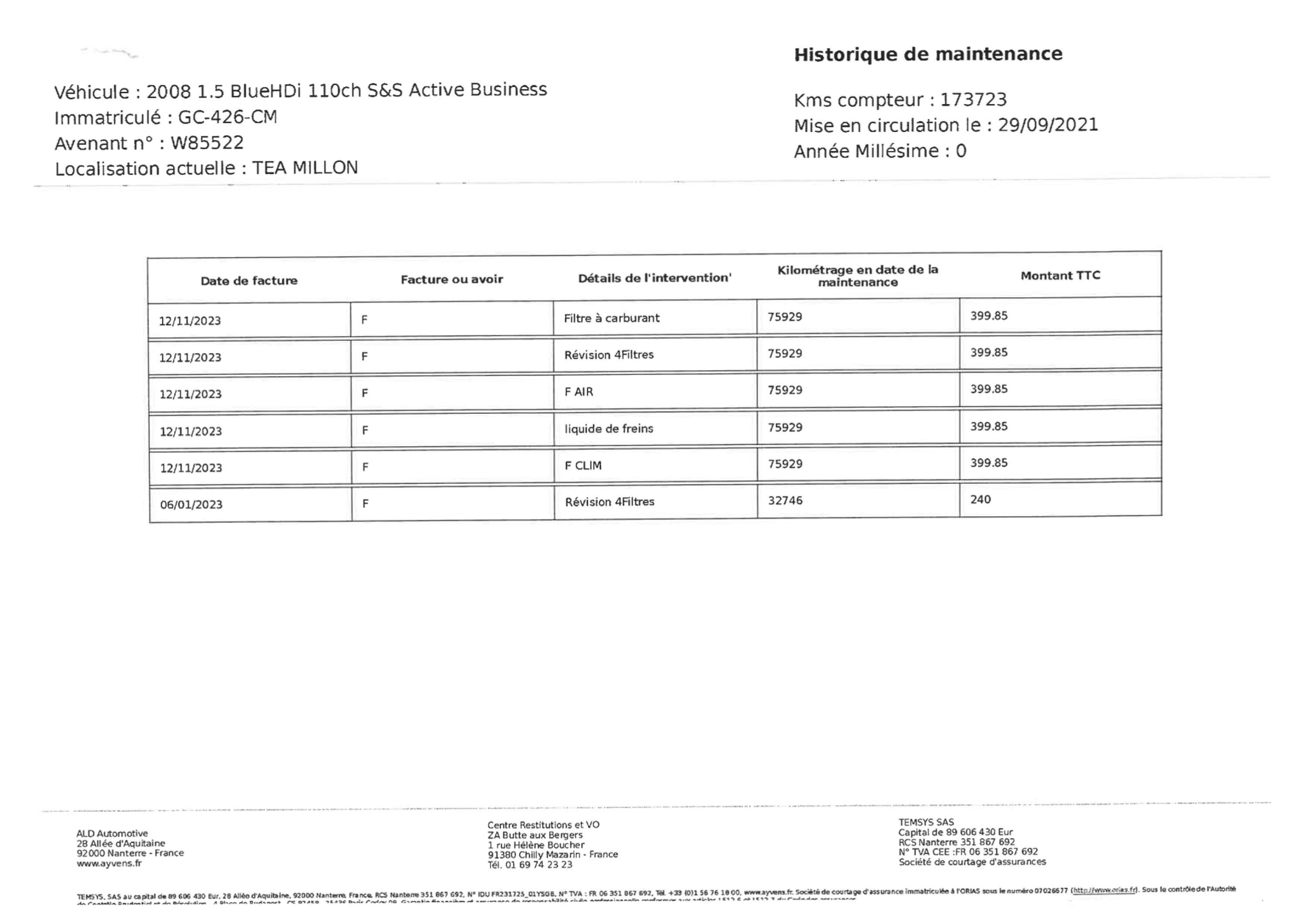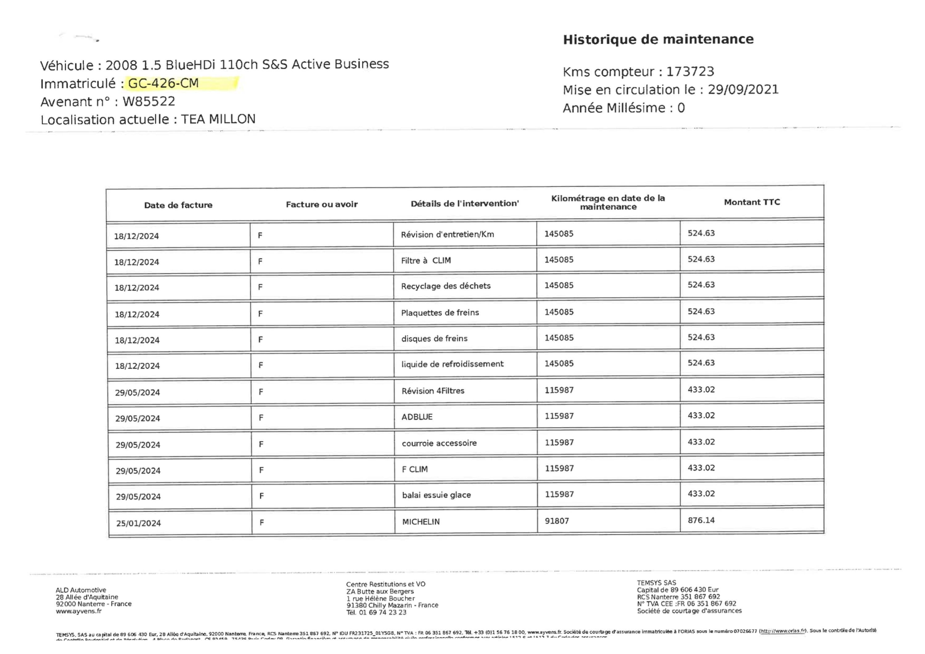 MAINTENANCE CHART - Equipment : ALUMINIUM RIMS / CRUISE CONTROL / AIR CONDITIONING / GPS