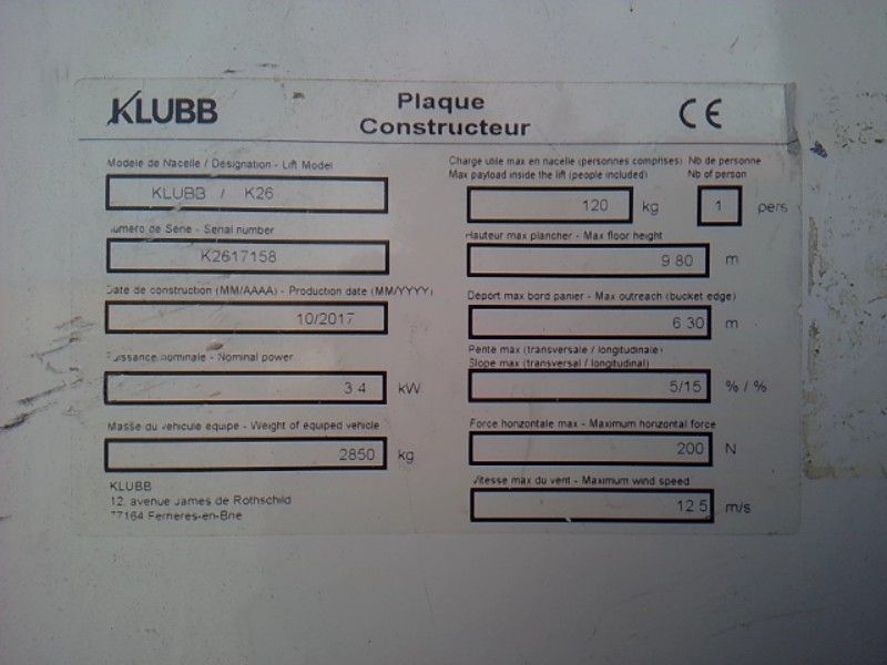 VASP RENAULT MASTER NACELLE SUR VL 12M 1783H - Dmec: 21/11/2017-48797Kms-8CV-Bodywork: WORKS-Energy: GO-Color: WHITE-Recoverable VAT-Equipments: 12M/1783H/NACELLE KLUBB K26/LA NACELLE FONCTIONNE/1 PORTE LAT/2 PORTES/3 PLACES/ABS/ATELIER INTERIEUR/ATTACHE REMORQUE/AUTO RADIO/BLUETOOTH/BOITE 6/CLIMATISATION MANUELLE/CAMERA DE RECUL/ESP/CLOSMET CENTRALISEE/INTERIEUR BOIS//REGUL ET LIMITEUR/RETROVISEURS ELECTRIQUES/ROUE SECOURS/VITRES ELECTRIQUES/AVE VGP/NON FONCTIONNEMENT DE LA SERRURE DU PORTILLON/GLISSEMENT DES VERINS SOUS CHARGE/HORS TOLERANCE/-CARTE GRISE DISPONIBLE