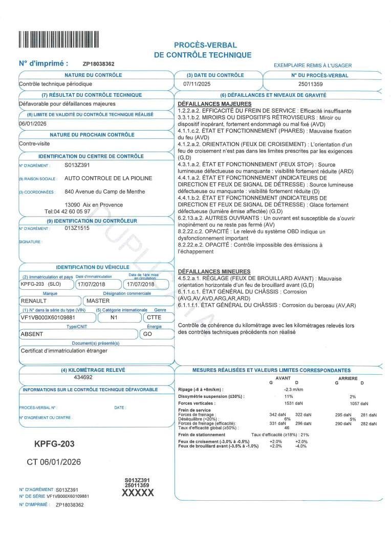 MASTER DCI PLATEAU RIDELLES BACHE EQUIPE COUCHETTE RENAULT - Couleur : BLANC - Kilometrage compteur : 434689 - 1ere M.E.C : 17/07/2018 - CG ETRANGERE - AVEC COC