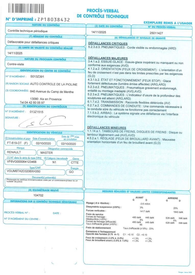 MASTER DCI 160 CAISSE MESSAGERIE AVEC HAYON RENAULT - Type : CTTE - Body : FOURGON - Energy : GO - Color : BLANC - Kilometrage compteur : 104699 - 1ere M.E.C : 02/10/2020 - Puissance : 8 - Tva récupérable - Places : 3 - AUTORADIO : MANQUE LE CODE body length : 4.30m body width : 2.15m body height : 2.20m - Equipment : AIR CONDITIONING / 6-SPEED GEARBOX / ON-BOARD COMPUTER / ELECTRIC MIRRORS / ELECTRIC WINDOWS / CRUISE CONTROL / FOG LAMPS / CENTRAL LOCKING / REGULATED AIR CONDITIONING / AIR BAGS / POWER STEERING