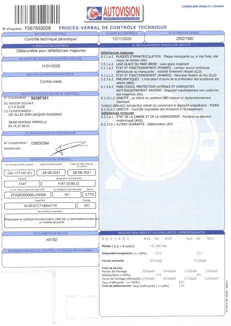 FIAT DOBLO CARGO FT 1.3 MULTIJET 95 PACK - Type: CTTE - Body: FOURGON - Energy: GO - Colour: WHITE - Odometer reading: 45191 - 1ere M.E.C: 28/06/2021 - Power: 4 - Vat recoverable - Mine type: N10FATCT186W170 - Seats: 3 - Remarks: Driver's front window not working, bonnet damaged + no front number plate. - Equipment : REVERSING RADAR / GPS / SIDE DOOR / USB / CHARGES: 14.28% + 100€ PROVISION / AIR CONDITIONING / BLUETOOTH
