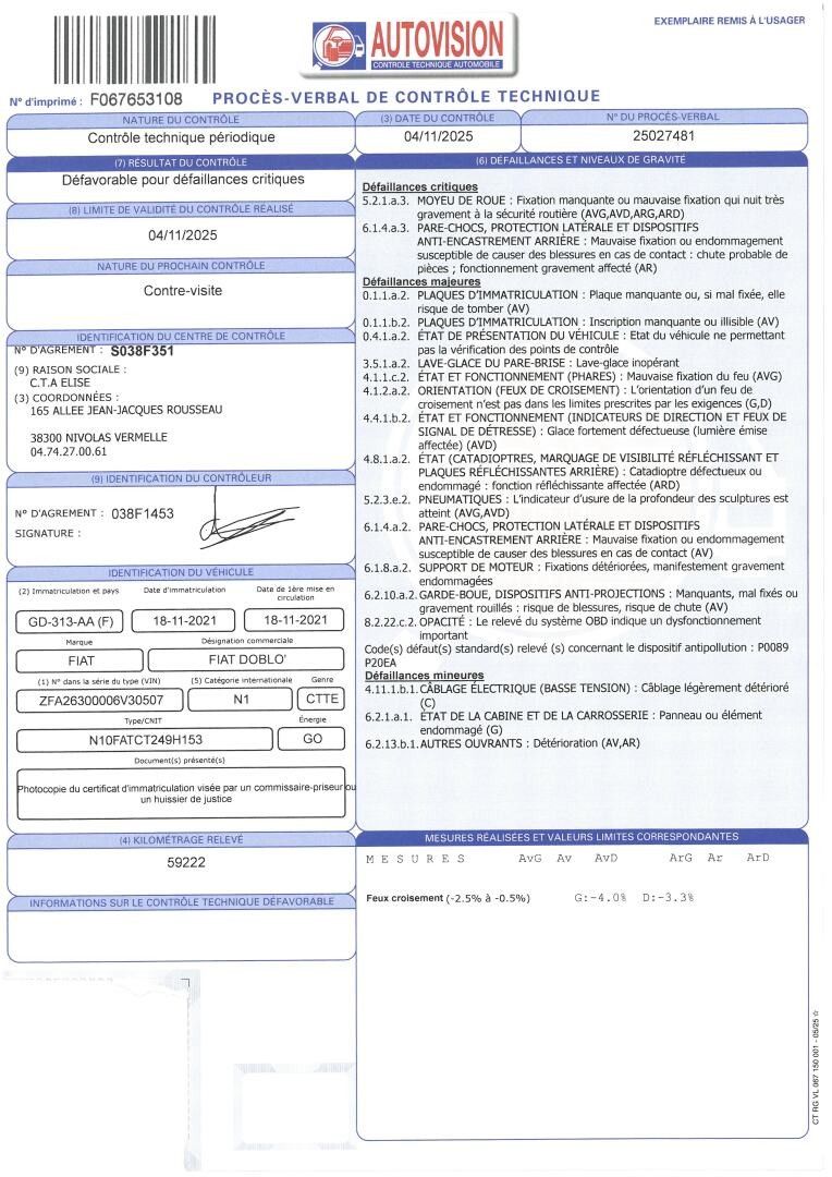 FIAT DOBLO - Type : CTTE - Body : FOURGON - Energy : GO - Color : BLANC - Mileage : 59219 - 1ere M.E.C : 18/11/2021 - Power : 4 - Tva récupérable - Type mines : N10FATCT249H153 - Seats : 3 - Remarks : Bterie à remplacer,Vendu sans carte grise, avec une fiche d'identification - Equipements : AIR CONDITIONING / REVERSING RADAR / BLUETOOTH / GPS / USB / COSTS : 14.28% + 100€ AVAILABLE / SIDE DOOR