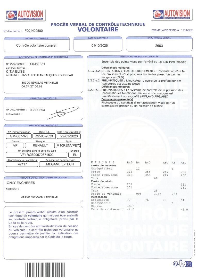 RENAULT Megane E-Tech EV60 220 ch super charge Techno - Genre : VP - Car body : CI - Energie : EL - Couleur : BLANC - Kilometrage compteur : 42115 - 1ere M.E.C : 22/03/2023 - Puissance : 4 - Tva récupérable - Type mines : M10RENVPE72G411 - Seats : 5 - Equipements : RADAR DE RECUL / BLUETOOTH / CLIM / GPS / USB / CAMERA DE RECUL / FRAIS : 14.28% + 100€ MISE A DISPOSITION