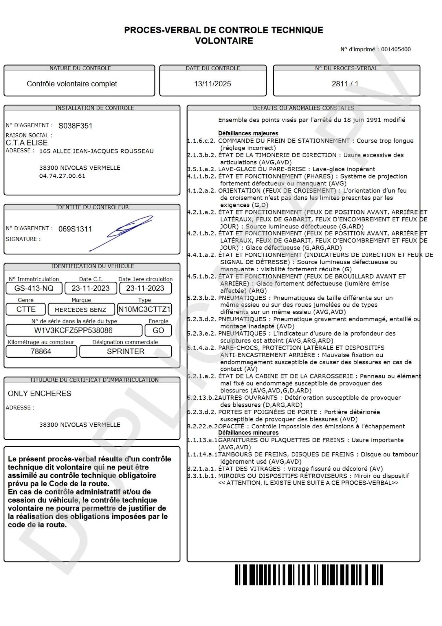 MERCEDES BENZ SPRINTER - Type : CTTE - Body : FOURGON - Energy : GO - Colour : BLANC - Kilometrage compteur : 78864 - 1ere M.E.C : 23/11/2023 - Puissance : 7 - Tva récupérable - Type mines : N10MC3CTTZ1S247 - Places : 3 - Equipements : PORTE LATERALE / RADAR DE RECUL / USB / CLIM / BLUETOOTH / FRAIS : 14.28%