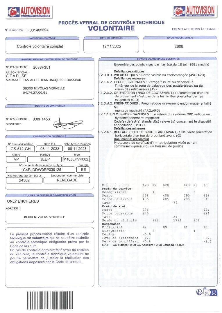JEEP JEEP RENEGADE - Type: PC - Body: BREAK - Energy: EE - Colour: DARK GREY - Odometer reading: 24361 - 1ere M.E.C: 08/11/2023 - Power: 7 - Recoverable VAT - Mine type: M10JEPVP002J850 - Seats: 5 - Remarks : Engine warning light - Equipment : USB / REVERSING CAMERA / AIR CONDITIONING / CHARGES: 14.28% + €100 DISPOSAL / BLUETOOTH