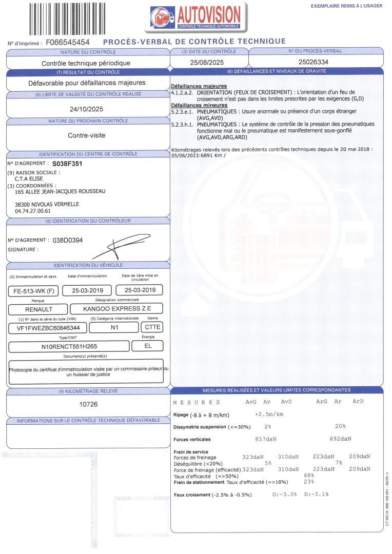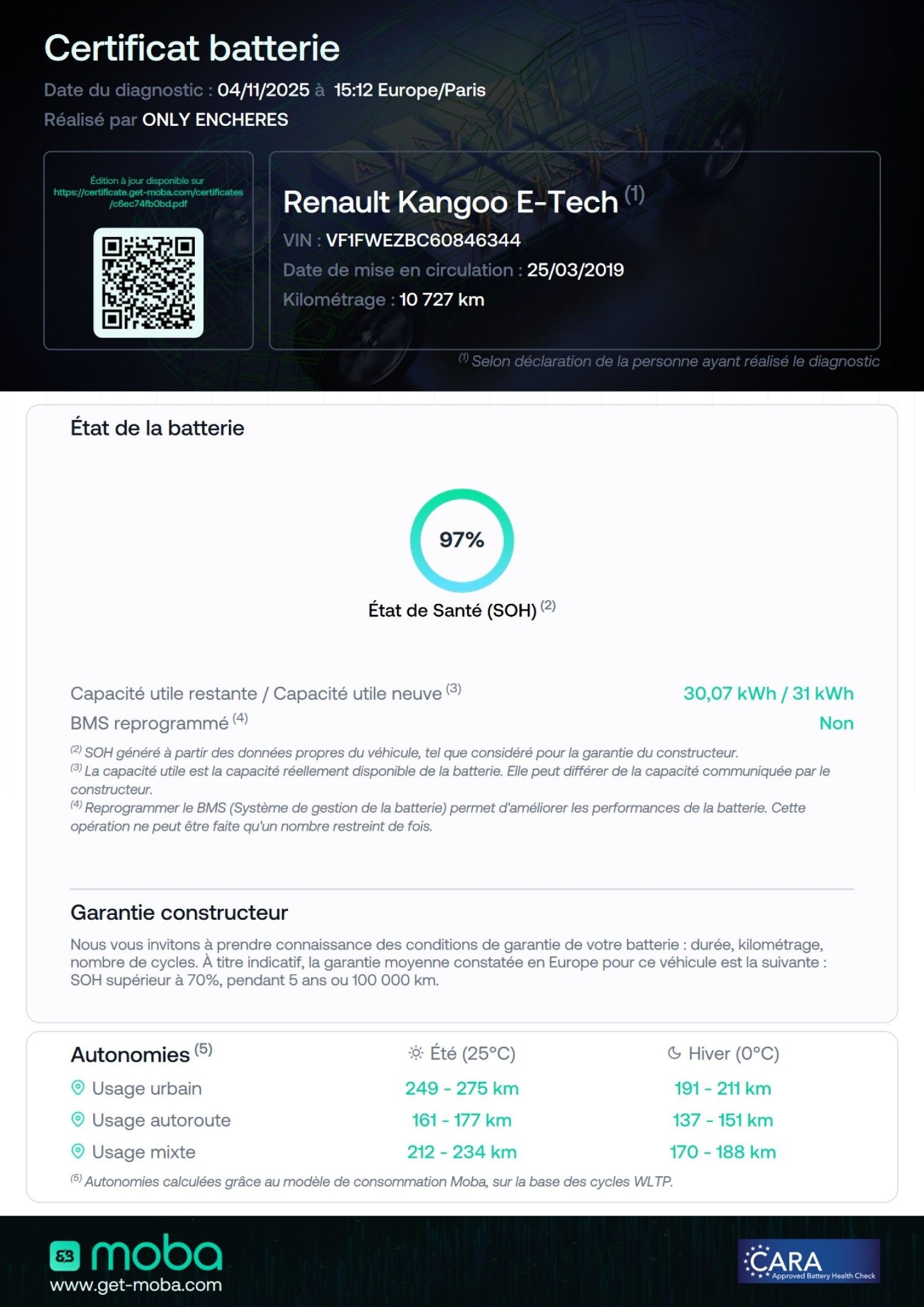 RENAULT KANGOO Z.E. 33 GRAND CONFORT ACHAT INTEGRAL - Type : CTTE - Body : FOURGON - Energy : EL - Color : BLANC - Mileage : 10725 - 1ere M.E.C : 25/03/2019 - Power : 7 - Tva récupérable - Type mines : N10RENCT551H265 - Seats : 2 - Observations : Hail vehicle.
