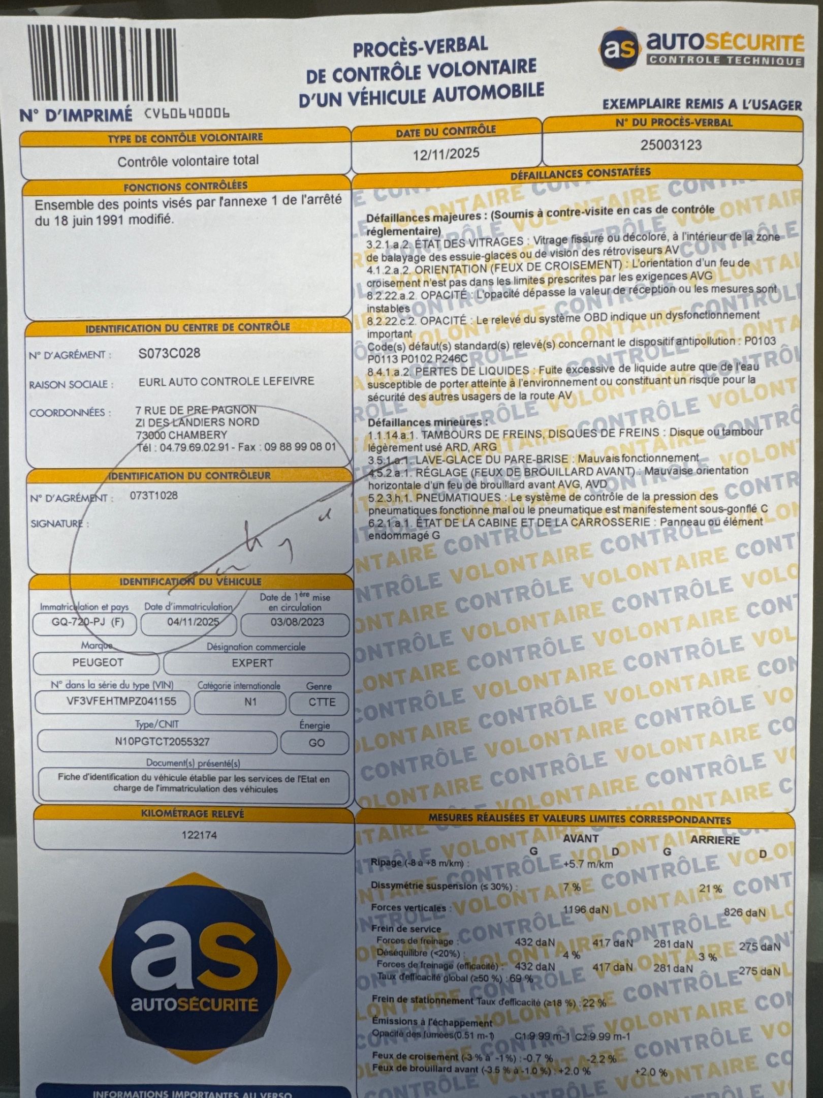 CTTE PEUGEOT EXPERT N° GQ-720-PJ du 03/08/2023 - 07cv GO - 122 174 kms - tva récupérable - 2 clés - A DESIGLER