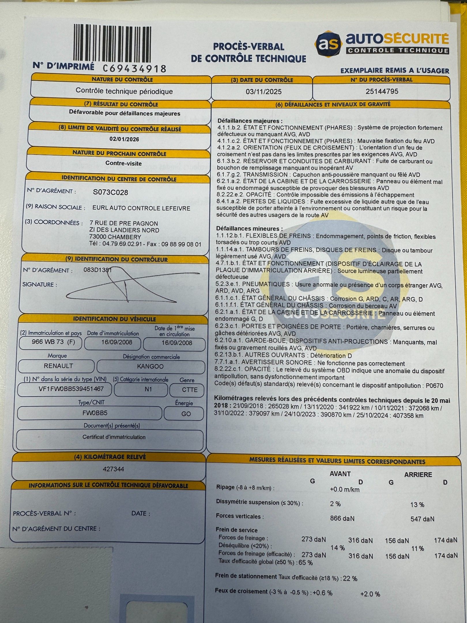 CTTE RENAULT KANGOO N° 966 WB 73 du 16/09/2008 - 06cv GO - 427 344 kms - tva non récupérable - 2 clés - CG