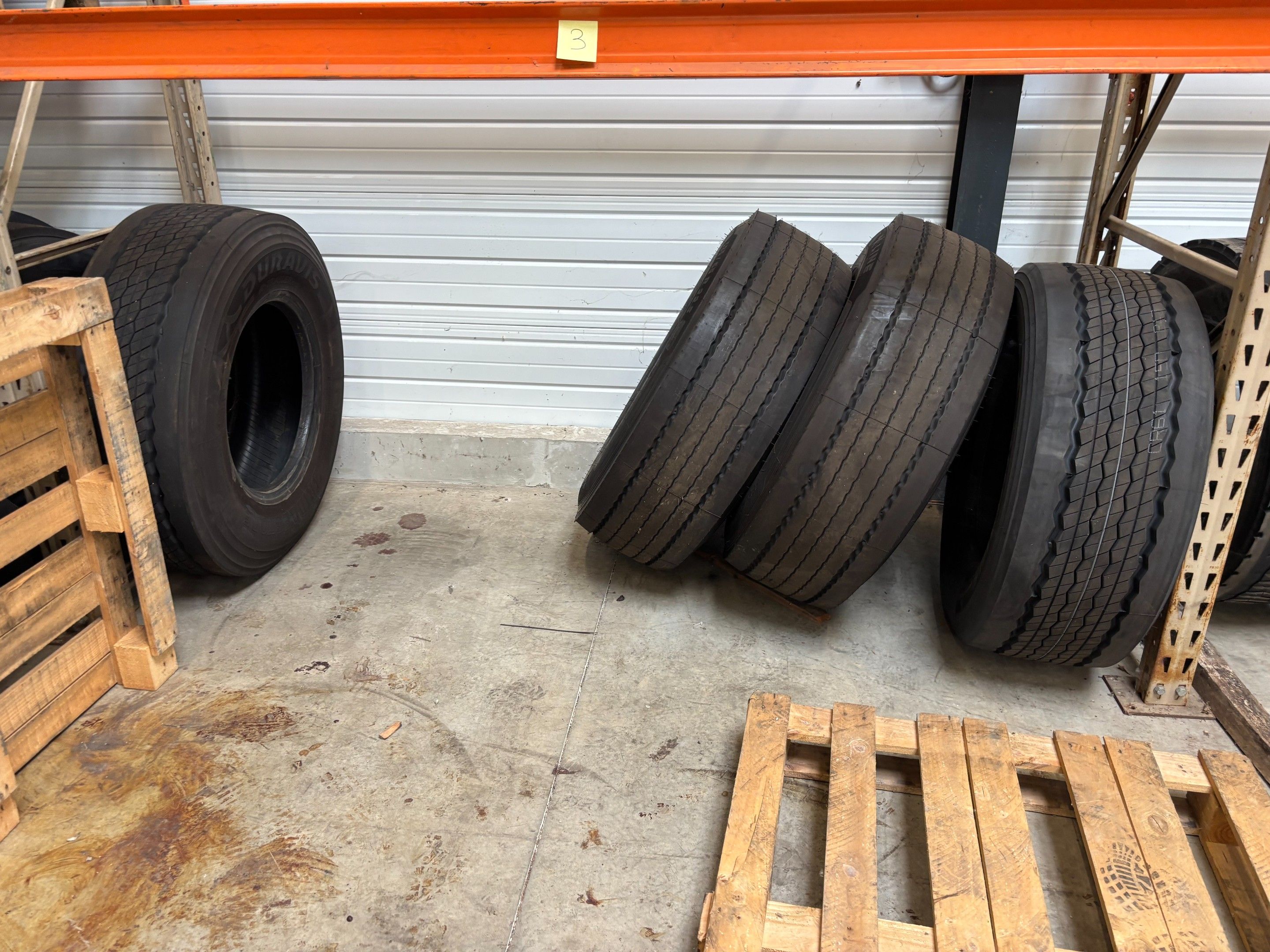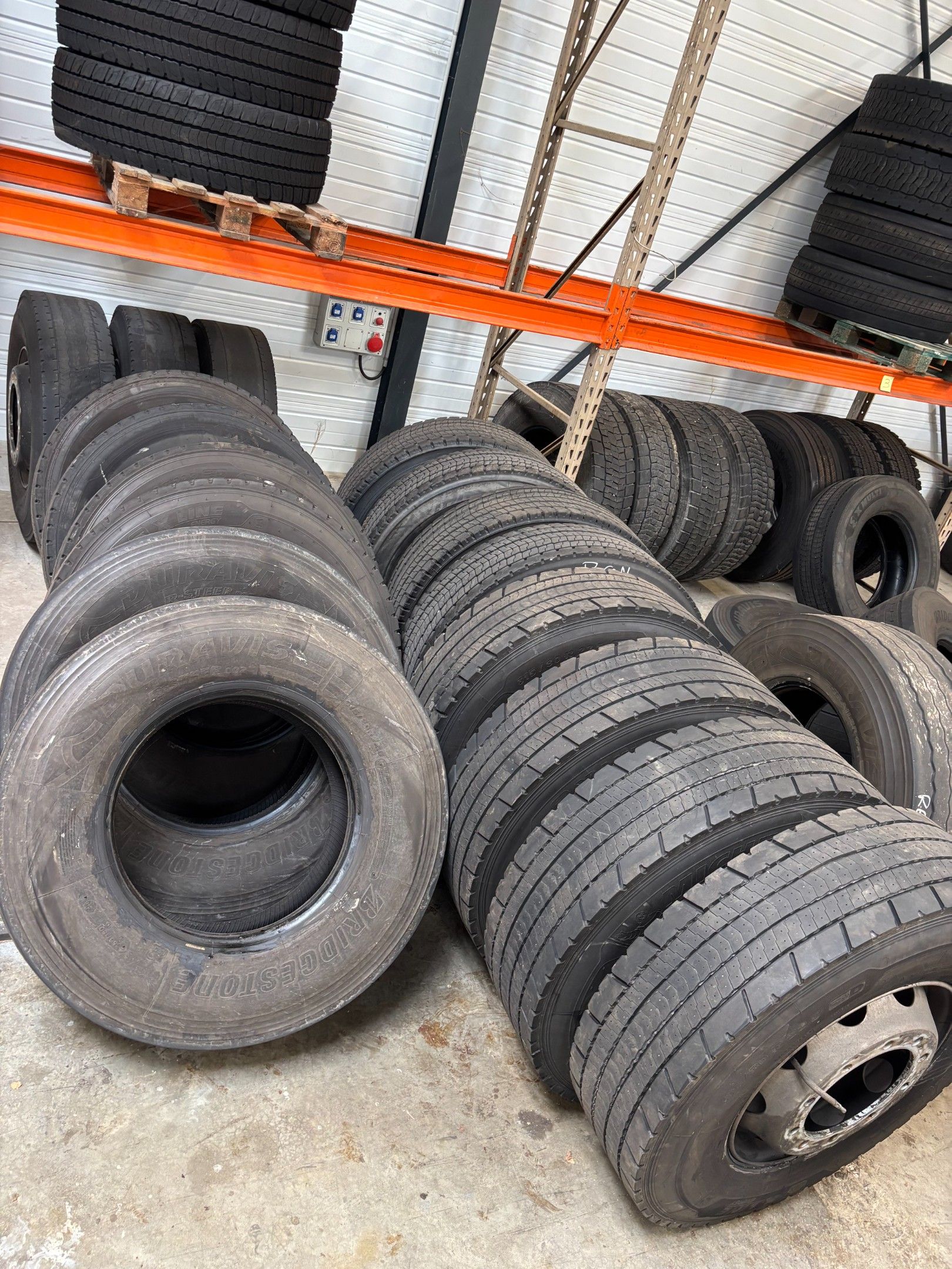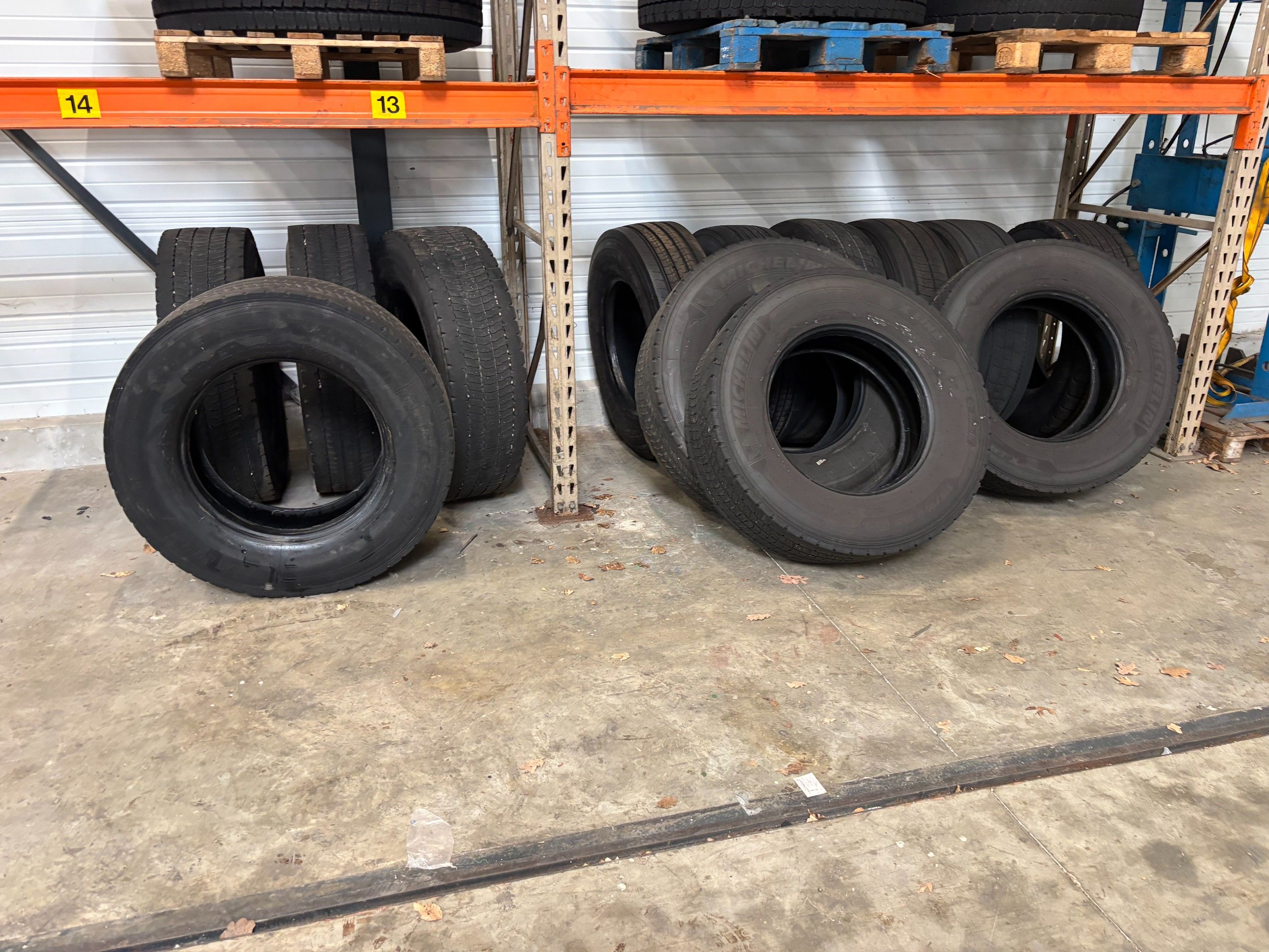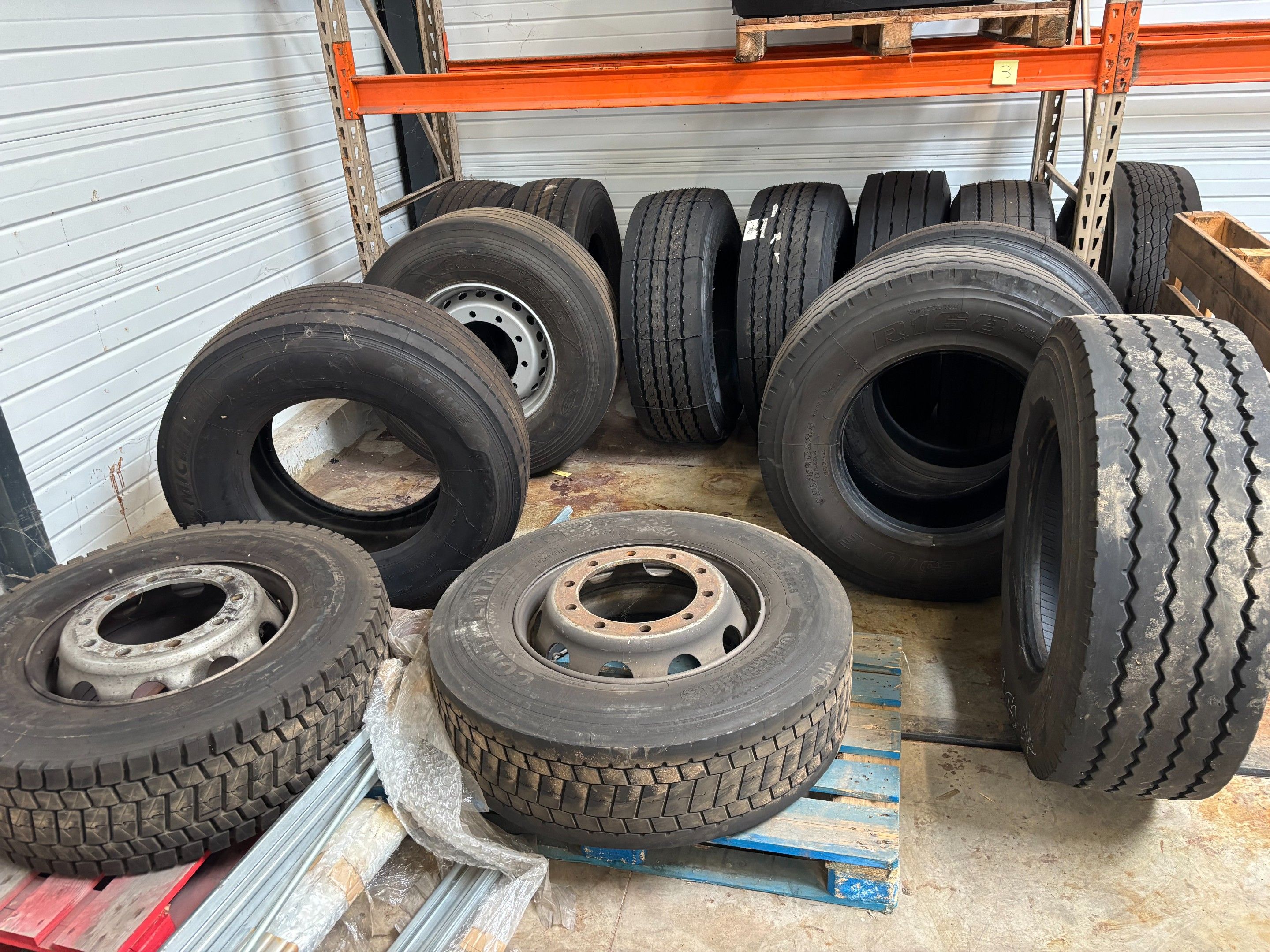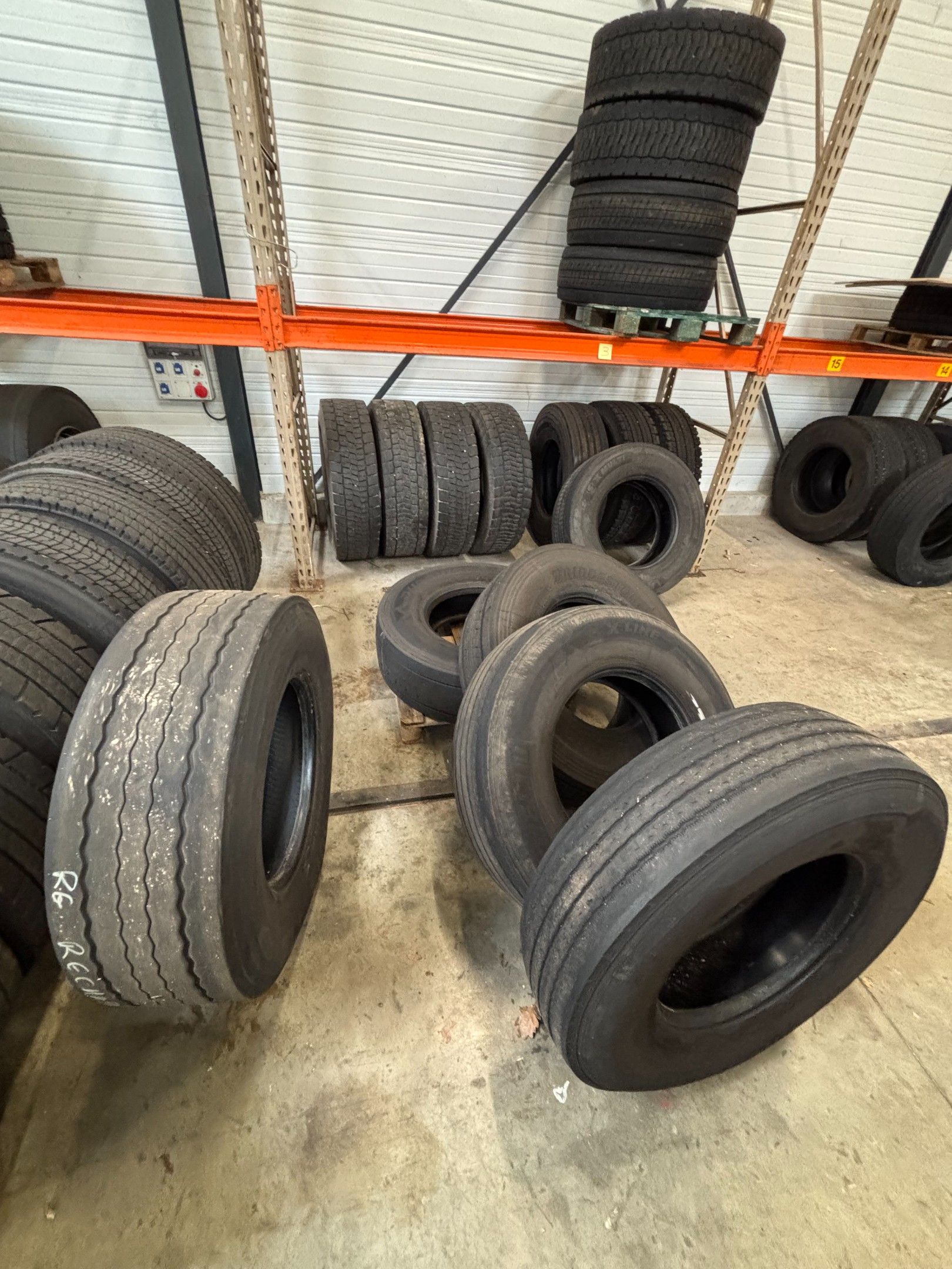 Lot of approximately 96 used road tractor tyres including 9 315/80 tyres on rims, 1 385 trailer tyre on rims, 2 315/70 tyres on rims, 4 new tyres on pallet, SOLD WITHOUT RACKS, Display on Wednesday 19/11/2025 from 10am to 11am at 38280 JANNEYRIAS, Collection on Thursday 27/11/2025 from 8am to 6pm at 38280 JANNEYRIAS (following Judicial Liquidation, Mandataire Judiciaire SELARL ALLIANCE MJ, according to sale order dated 05/08/2025)