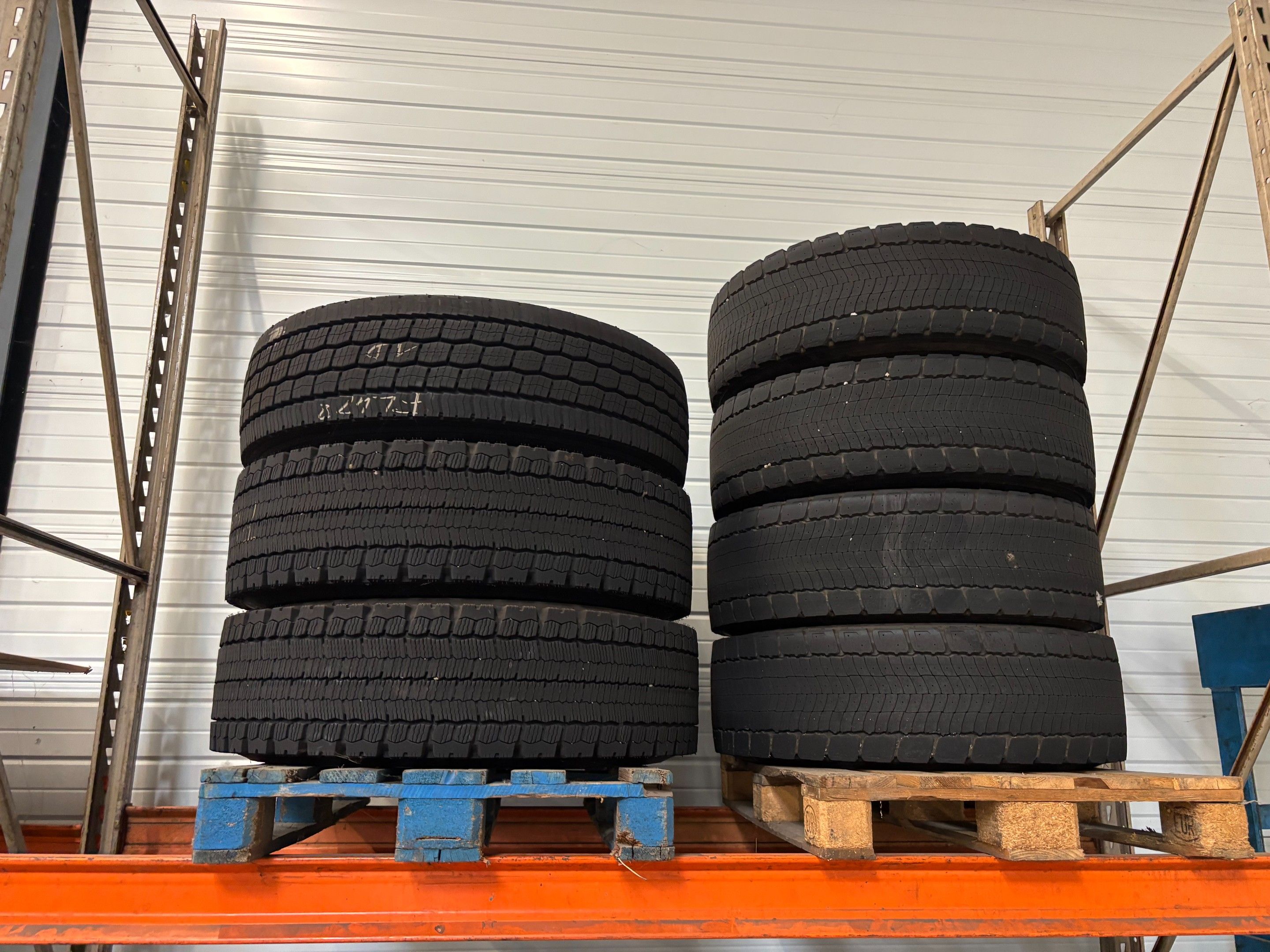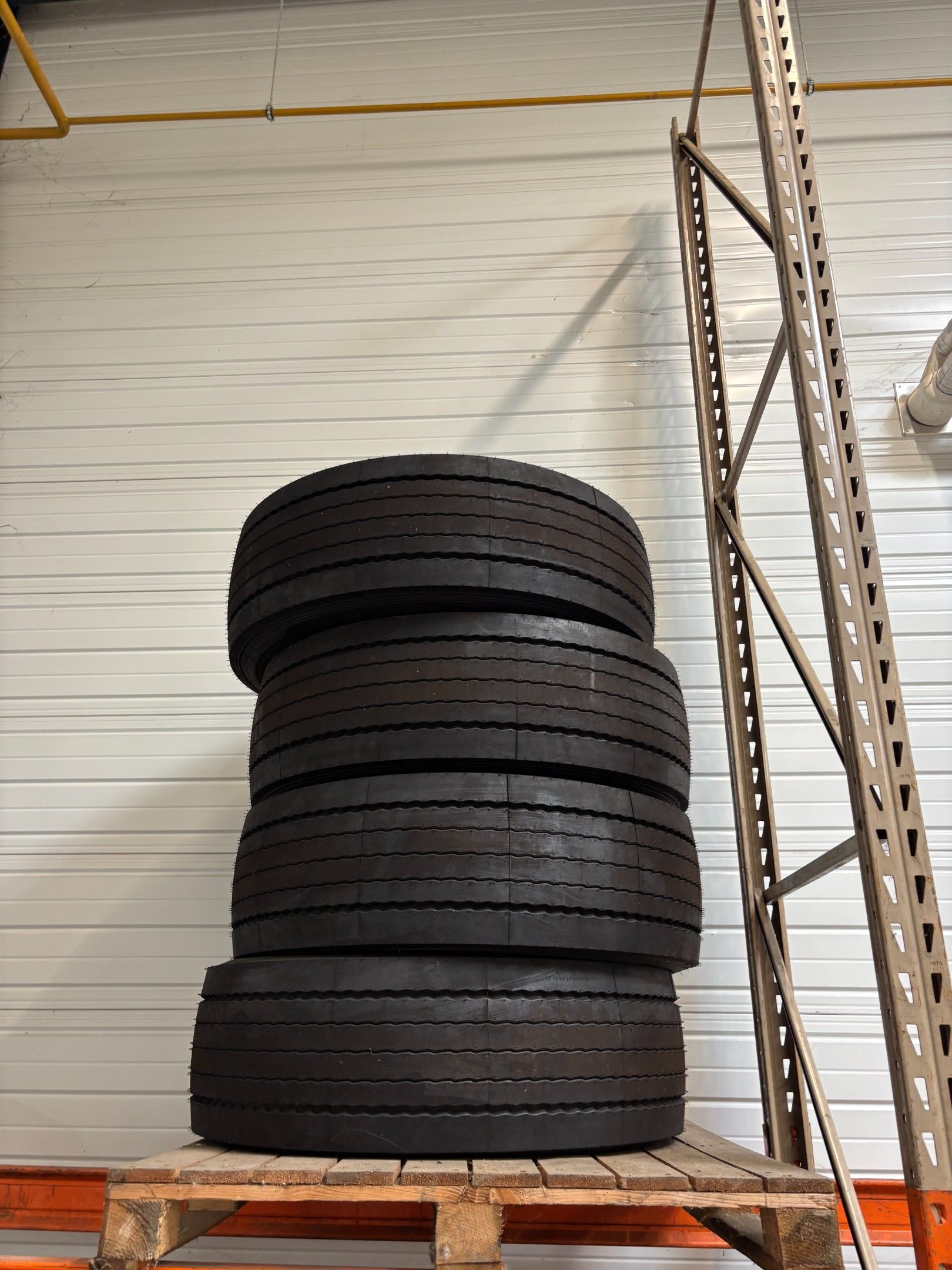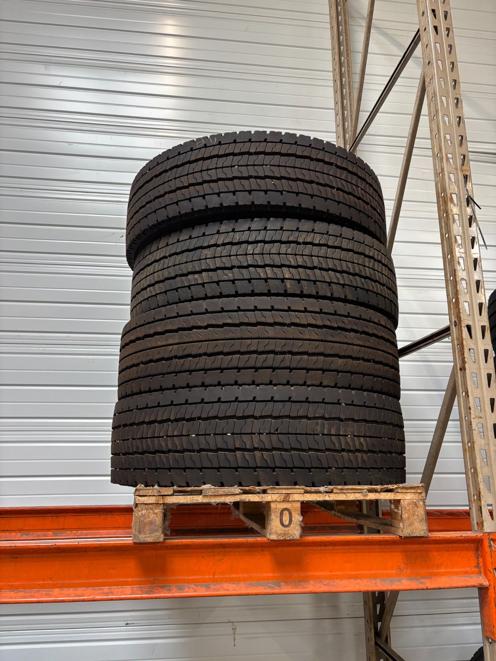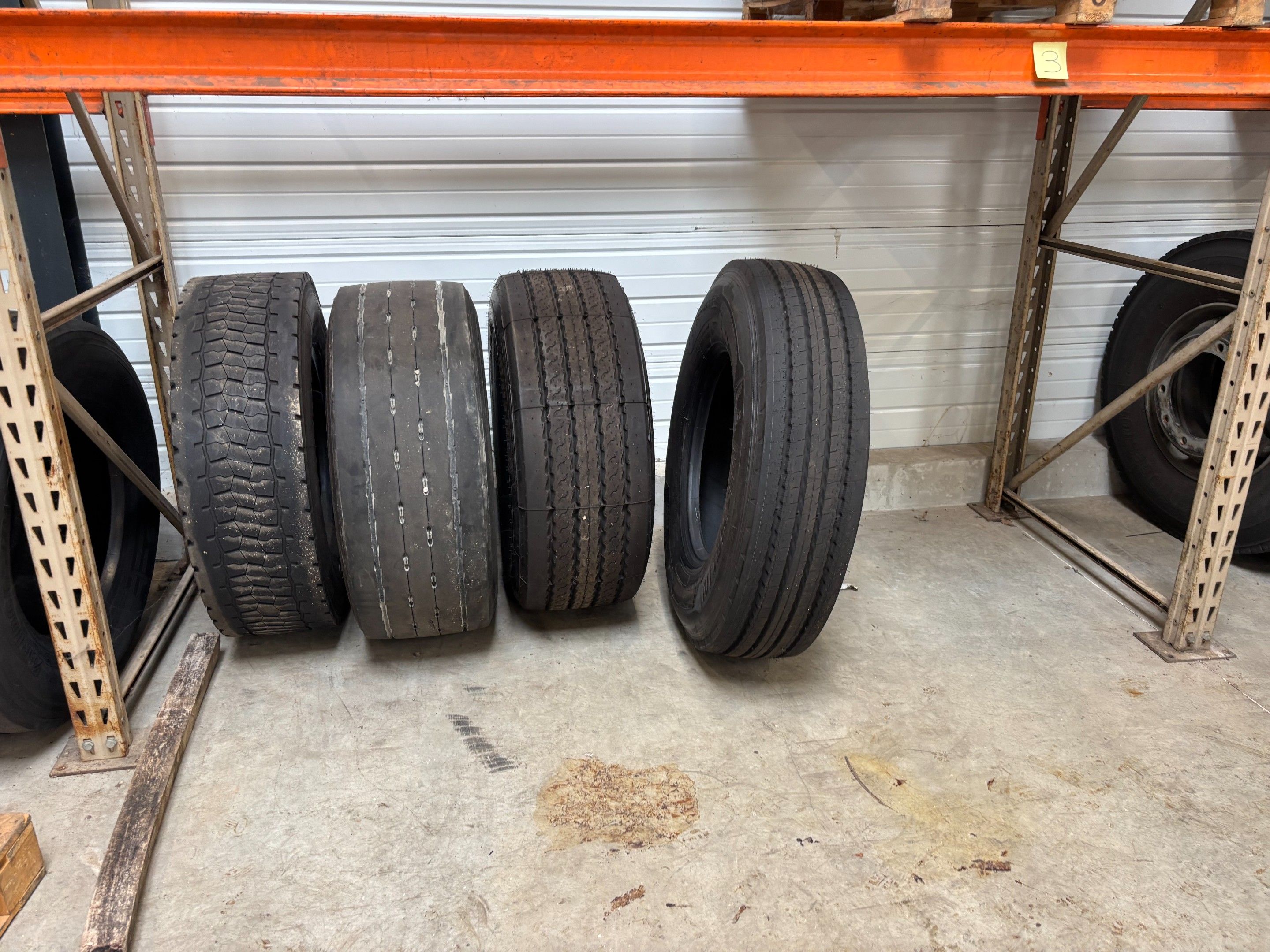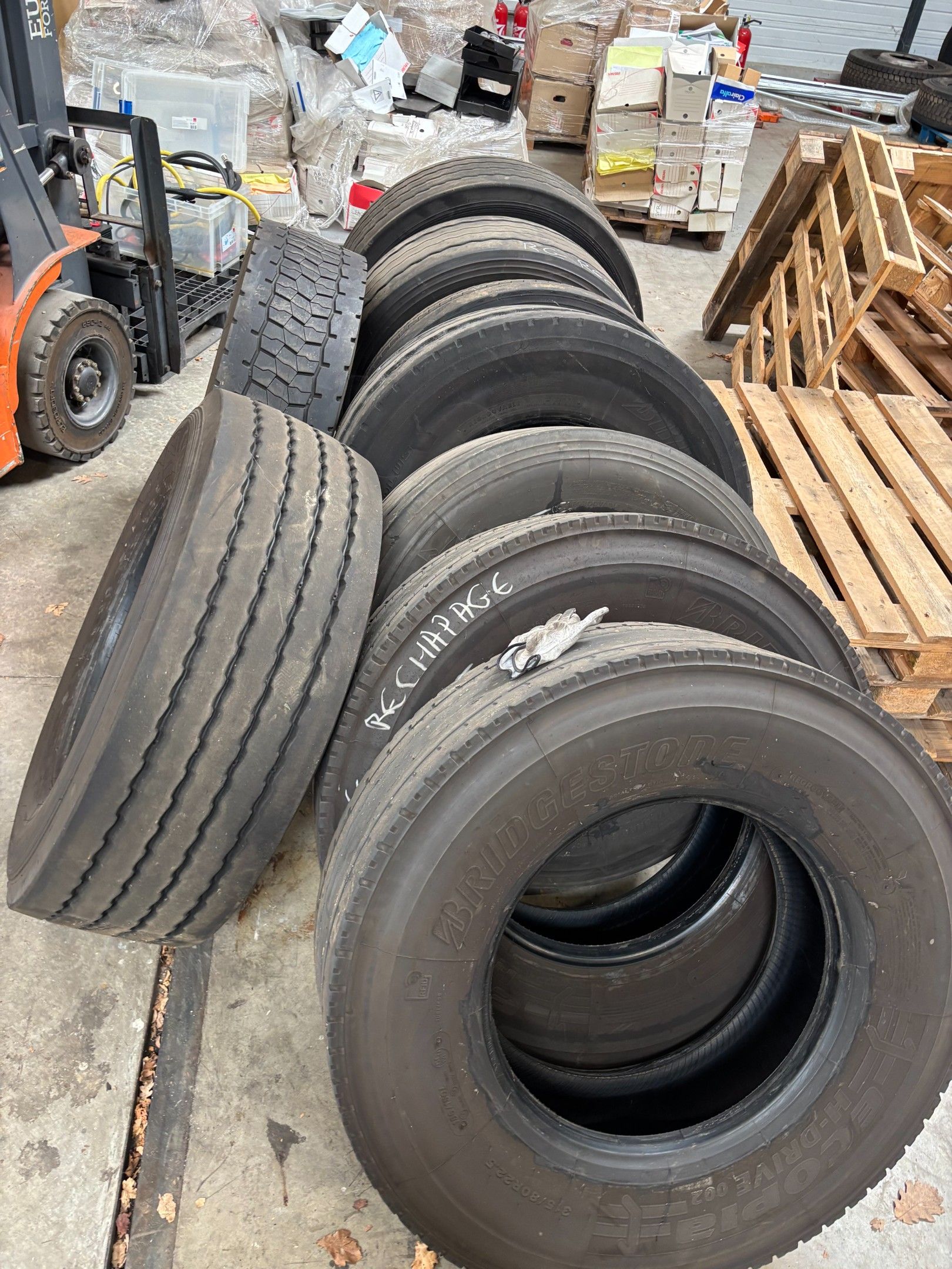 Lot of approximately 96 used road tractor tyres including 9 315/80 tyres on rims, 1 385 trailer tyre on rims, 2 315/70 tyres on rims, 4 new tyres on pallet, SOLD WITHOUT RACKS, Display on Wednesday 19/11/2025 from 10am to 11am at 38280 JANNEYRIAS, Collection on Thursday 27/11/2025 from 8am to 6pm at 38280 JANNEYRIAS (following Judicial Liquidation, Mandataire Judiciaire SELARL ALLIANCE MJ, according to sale order dated 05/08/2025)