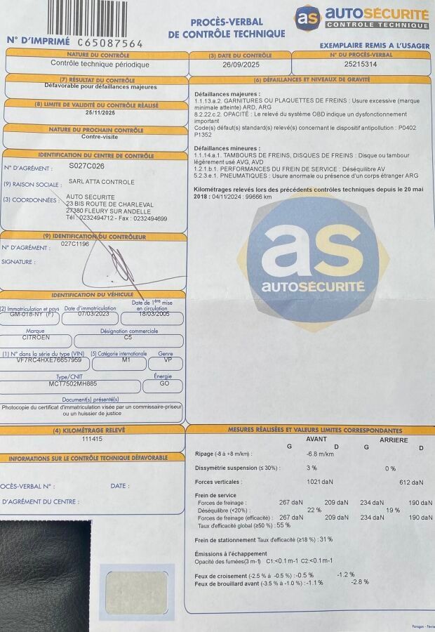CITROEN C5 - Type: PC - Body: CI - Energy: GO - Odometer reading: 111415 - 1st MOT: 18/03/2005 - Power: 8 - Remarks: VEHICLE SOLD AS IS WITH MAJOR DEFAULTS AS OF 26/09/2025 - ALTERNATIVE PROBLEM - REMINDER: We remind you that the exhibitions are offered to assess the condition of the lots presented, according to your degree of requirement. Failure to attend or to request additional information BEFORE THE SALE (condition, photos, etc.) constitutes tacit acceptance of the condition of the vehicles without any possible claim. NO CLAIM OR CANCELLATION OF THE SALE WILL BE POSSIBLE AFTER THE ANNOUNCEMENT OF THE HAMMER PRICE.