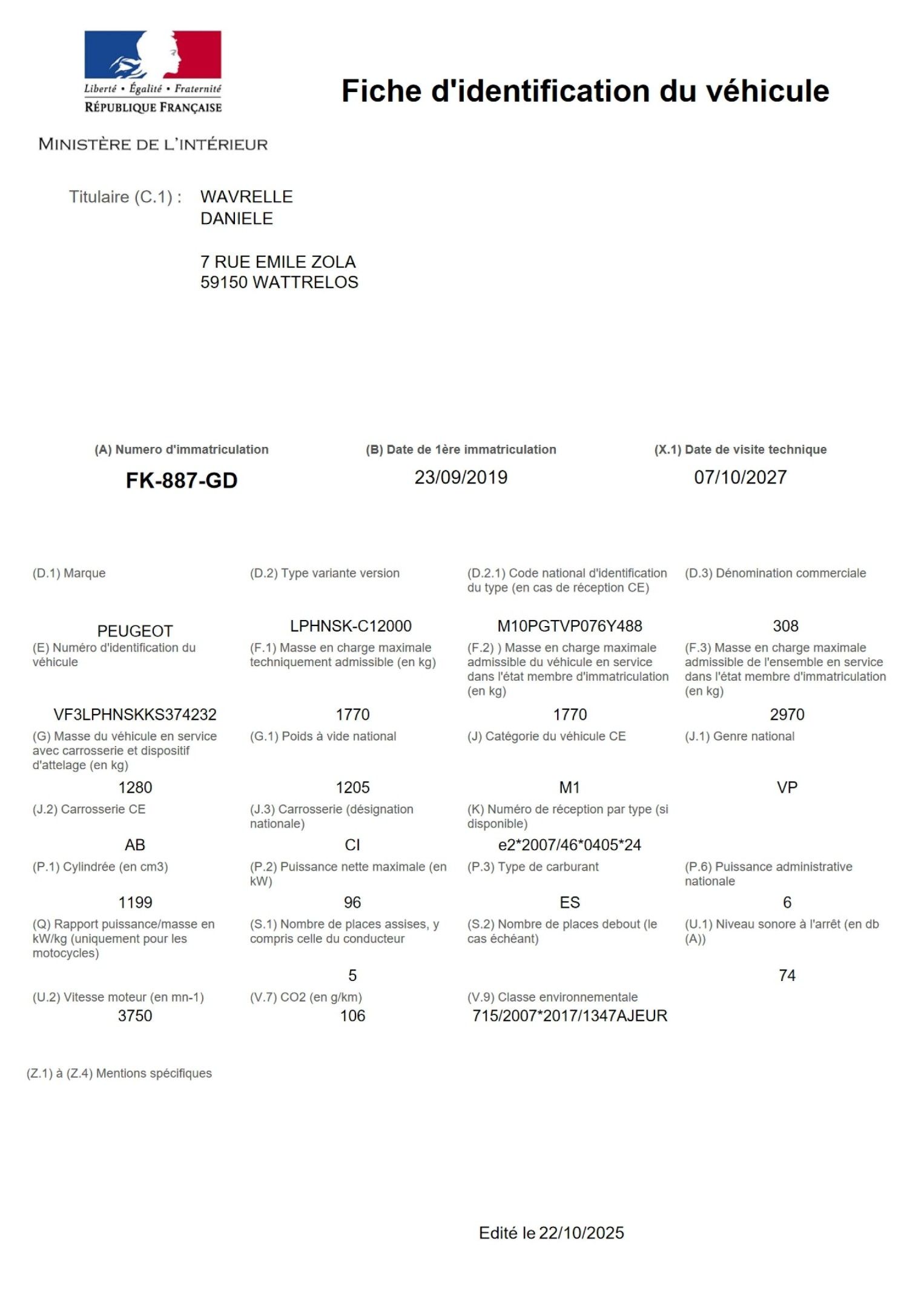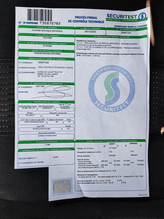 308 PEUGEOT - Type: PC - Body: CI - Energy: ES - Colour: GREY - Odometer reading: 11396 - 1ere M.E.C: 23/09/2019 - Power: 6 - Remarks: tva non récupérable, fiche d'identification , non gage, contrôle technique favorable