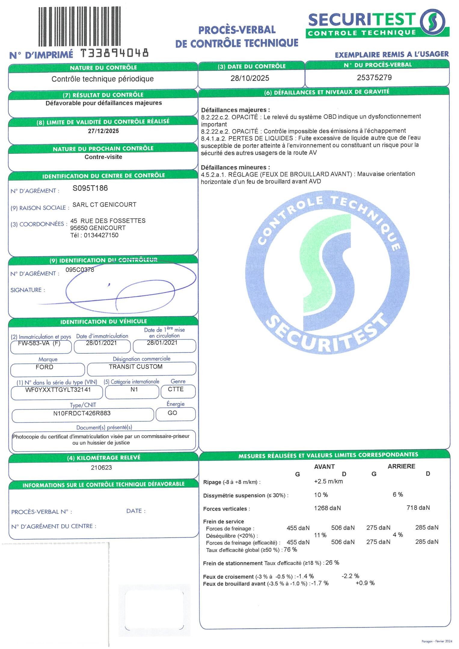 FORD TRANSIT CUSTOM 2.0 TDCI POWERS HIFT 170 CH - Type : CTTE - Body : FOURGON - Energy : GO - Mileage : 210600 - 1ere M.E.C : 28/01/2021 - Power : 7 - Tva récupérable - Seats : 3 - Remarks : Court fees 14.28 % + 48 € VAT included in case of purchase on live - JUDICIAL SOLD IN STATE WITHOUT CLAIM - VAT RECOVERABLE FOR PROFESSIONALS - SOLD WITH IDENTIFICATION SHEET + FORM