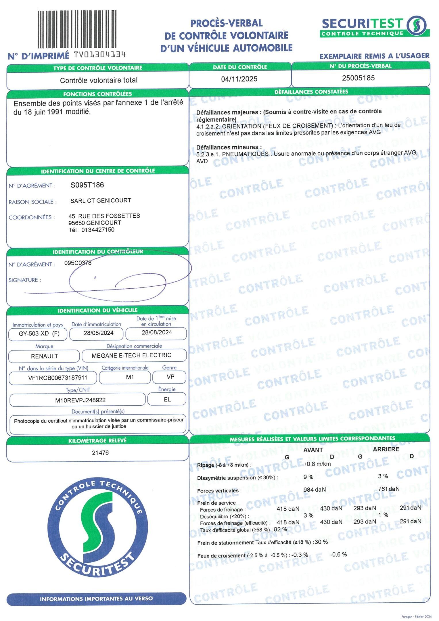RENAULT MEGANE E-TECH E ICONIC 220 CH AUTONOMIE - Type : Passenger car - Body : CI - Energy : EL - Colour : GRIS - Mileage : 21476 - 1ere M.E.C : 28/08/2024 - Power : 4 - Recoverable vat - Seats : 5 - Remarks : VOLUNTARY vehicle sales costs 13 % VAT included + 200 € Administration costs (+ 48 € VAT included in case of purchase on live)