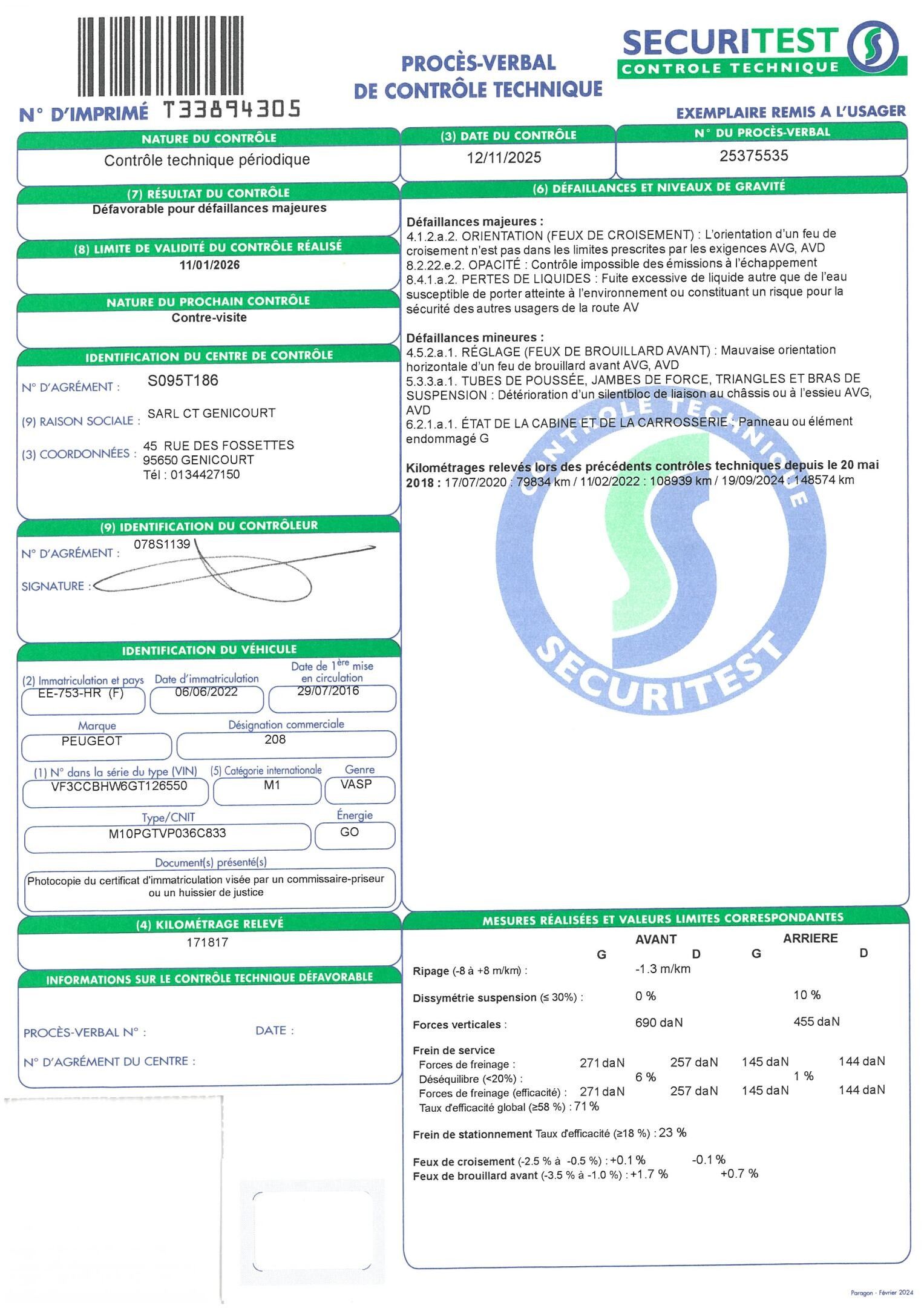 PEUGEOT 208 STE 1.6 HDI 75 CH - Type : VASP - Body : DERIV VP - Energy : GO - Color : BLANC - Mileage : 171817 - 1ere M.E.C : 29/07/2016 - Power : 4 - VAT RECOVERABLE - Remarks : Court fees 14.28 % + 48 € TTC en cas d'achat sur le live - TVA RECUPERABLE POUR LES PROFESSIONNELS - VENDU DANS L'ETAT PAS NON RECLAMATION VENDU PAR L'ETUDE MORETTON NANTERRE AVEC FICHE D'IDENTIFICATION - 1 CLEF - PC AV AV ET AR FROTTES ET RAYES - BAS DE CAISSE COTE G ENFONCE - FROTTEMENTS AILES ARD ET AVD - RAYURE SUR PORTE ARG - Equipements : RADIO CD / CENTRAL LOCKING / BLUETOOTH / SPEED LIMITER / AIR CONDITIONING / CRUISE CONTROL / ELECTRIC WINDOWS