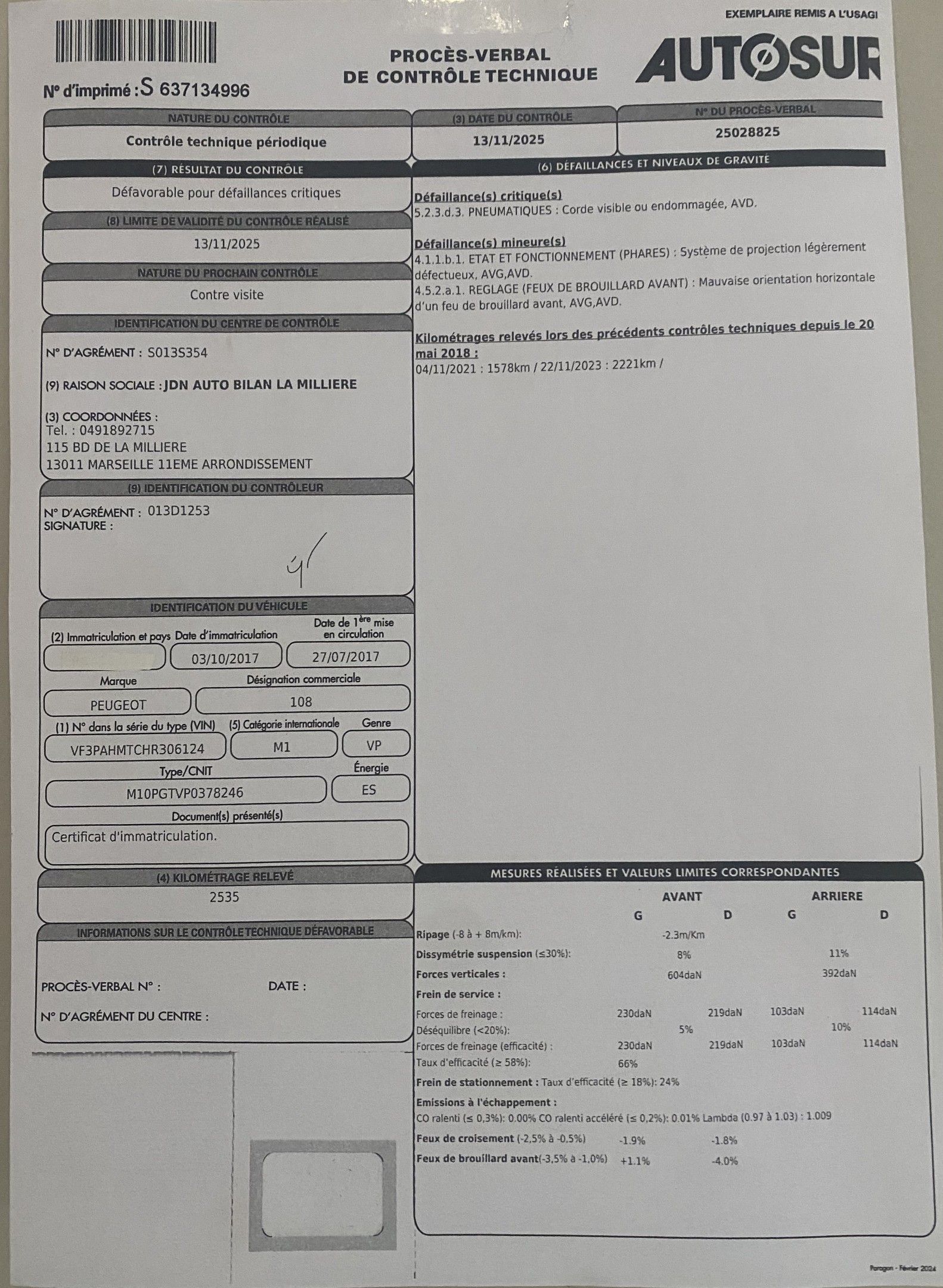 PEUGEOT 108 FROM 27/07/2017, PETROL, 2,535 KMS ON THE CLOCK - 2 KEYS - SMALL DENTS OTHERWISE GOOD CONDITION