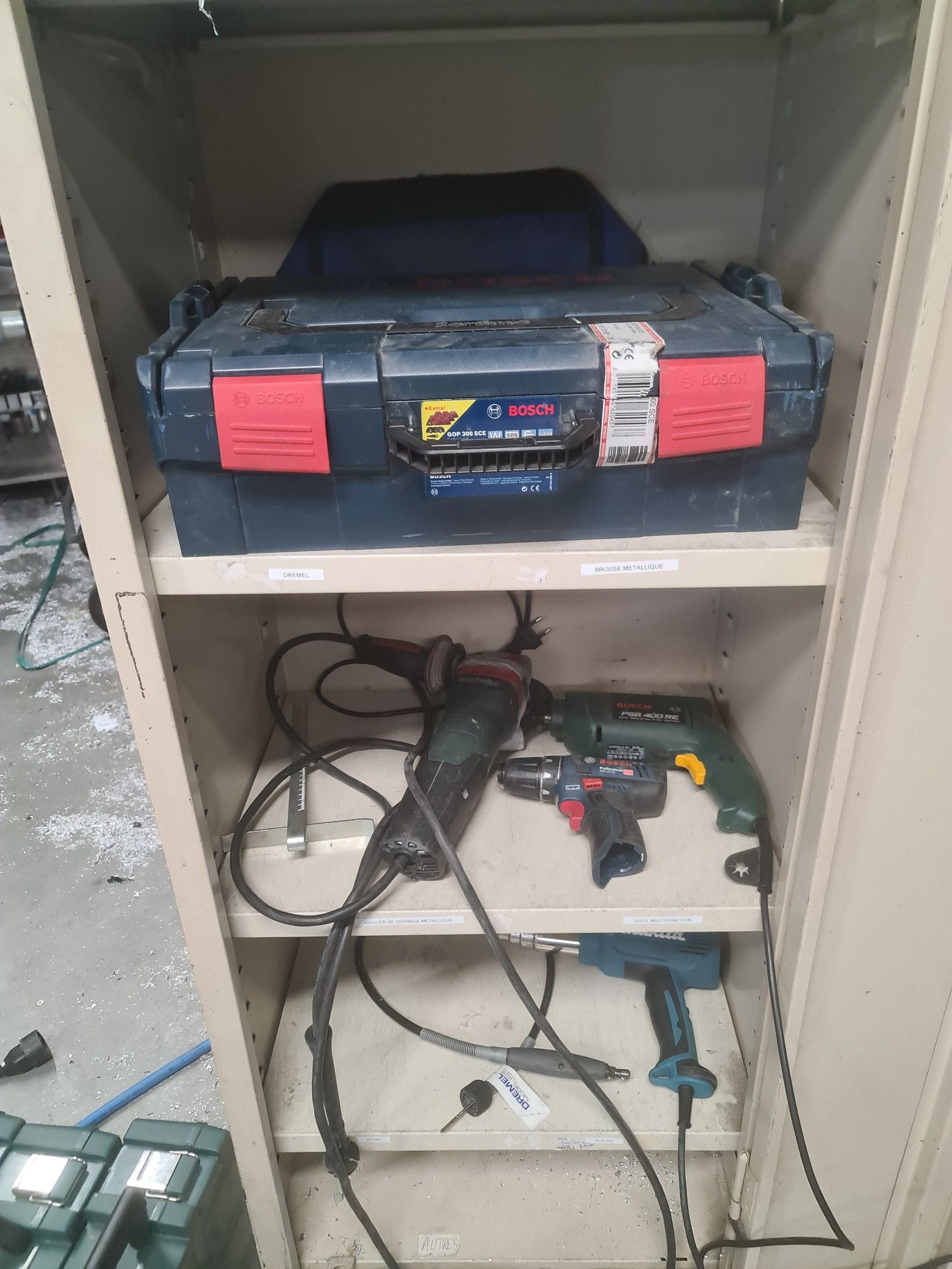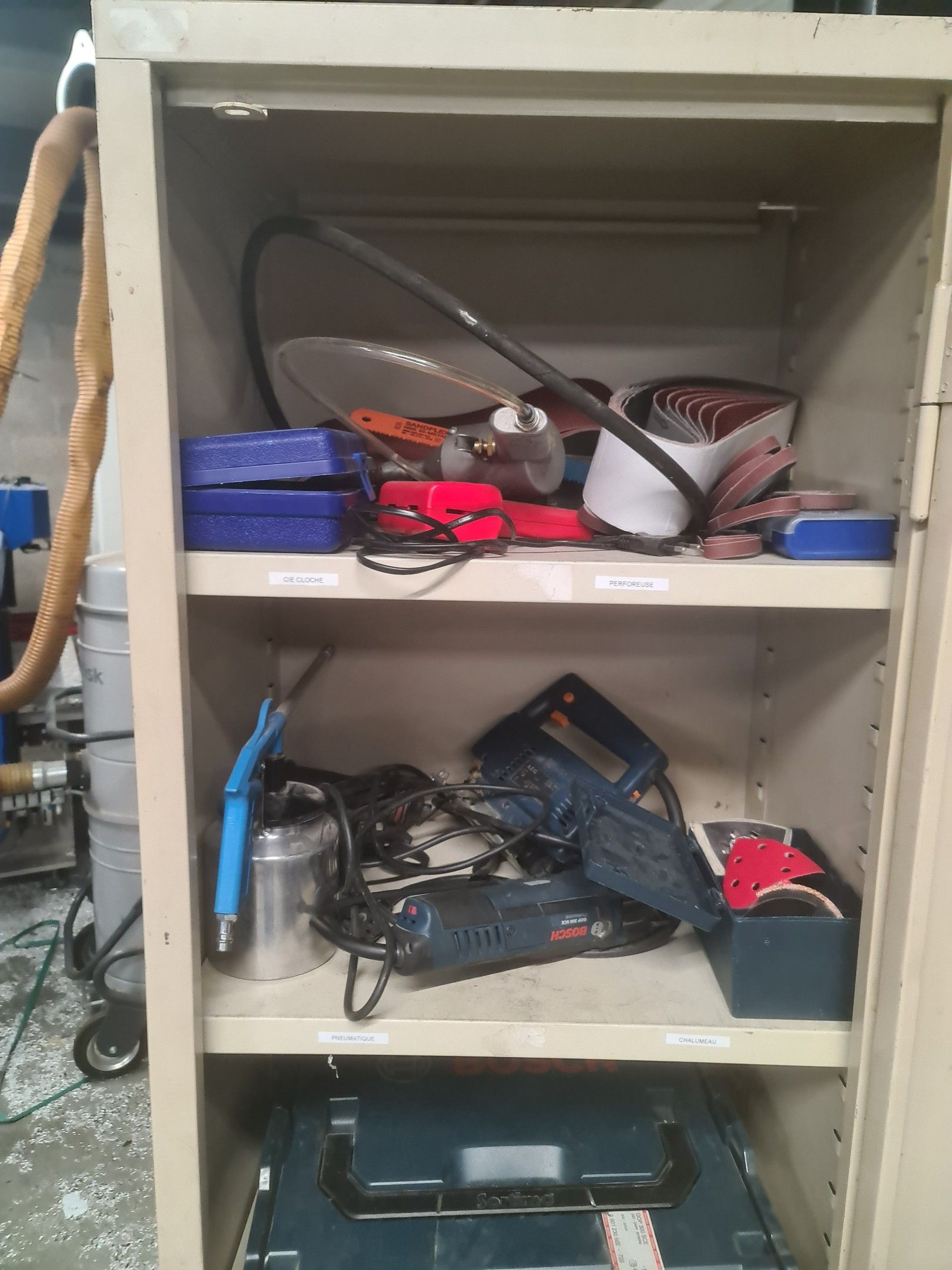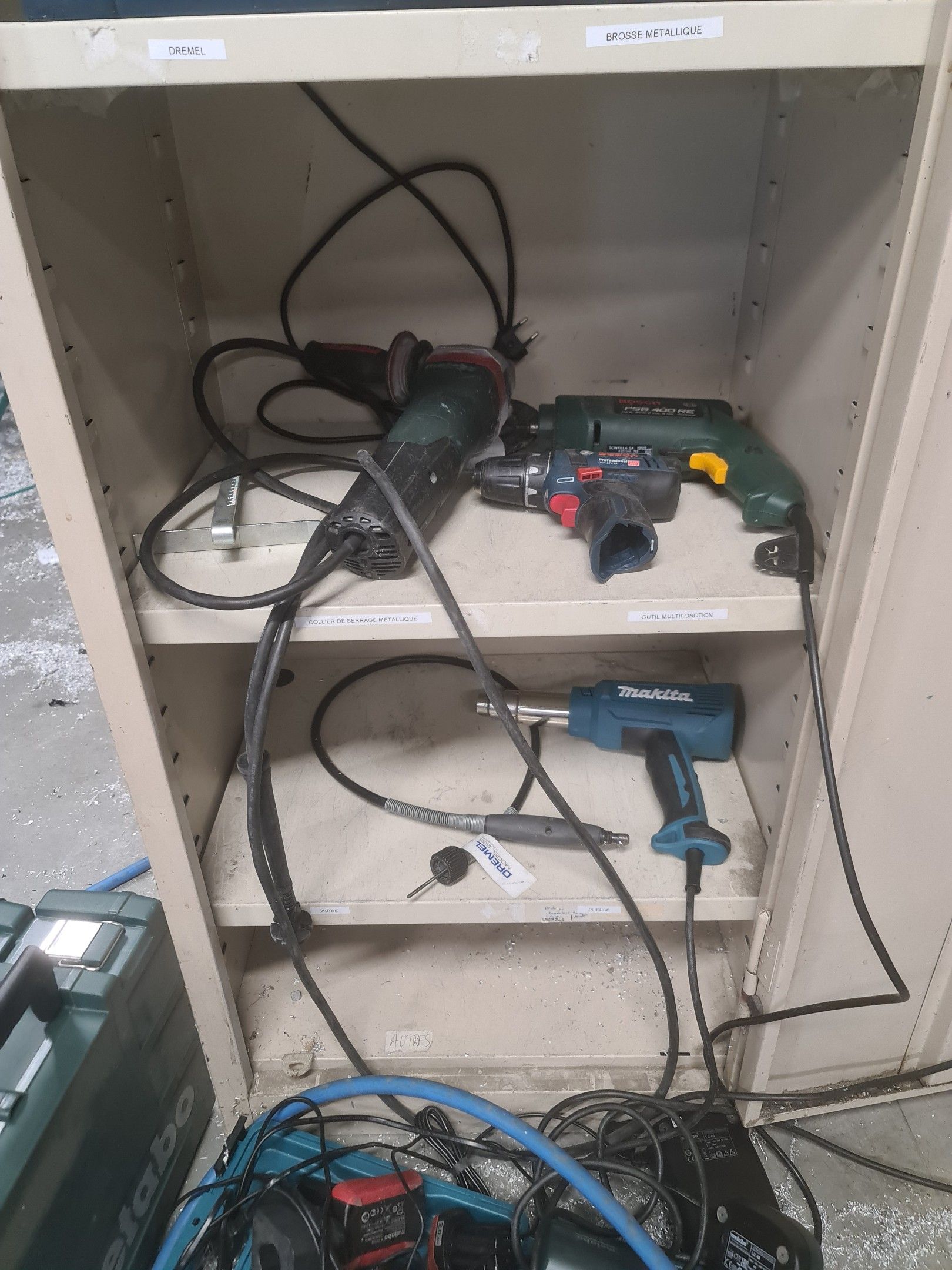 an AEG corded jigsaw, a Bosch corded multifunction tool, Bosch accessories, 3 empty METABO cases, a MAKITA thermal scraper, a BOSCH drill, a METABO grinder, a METABO charger, all in a metal cabinet with a hinged door.
