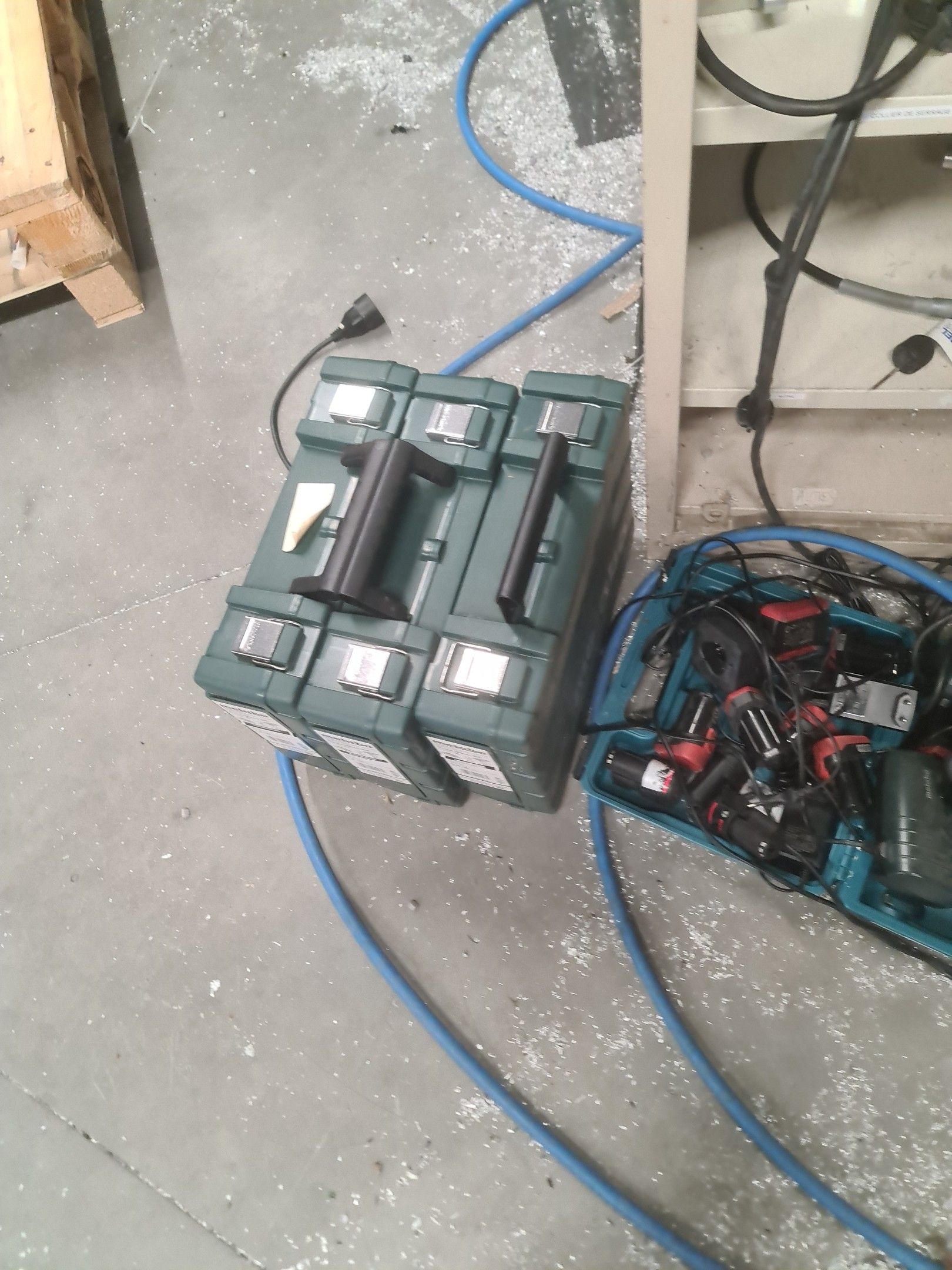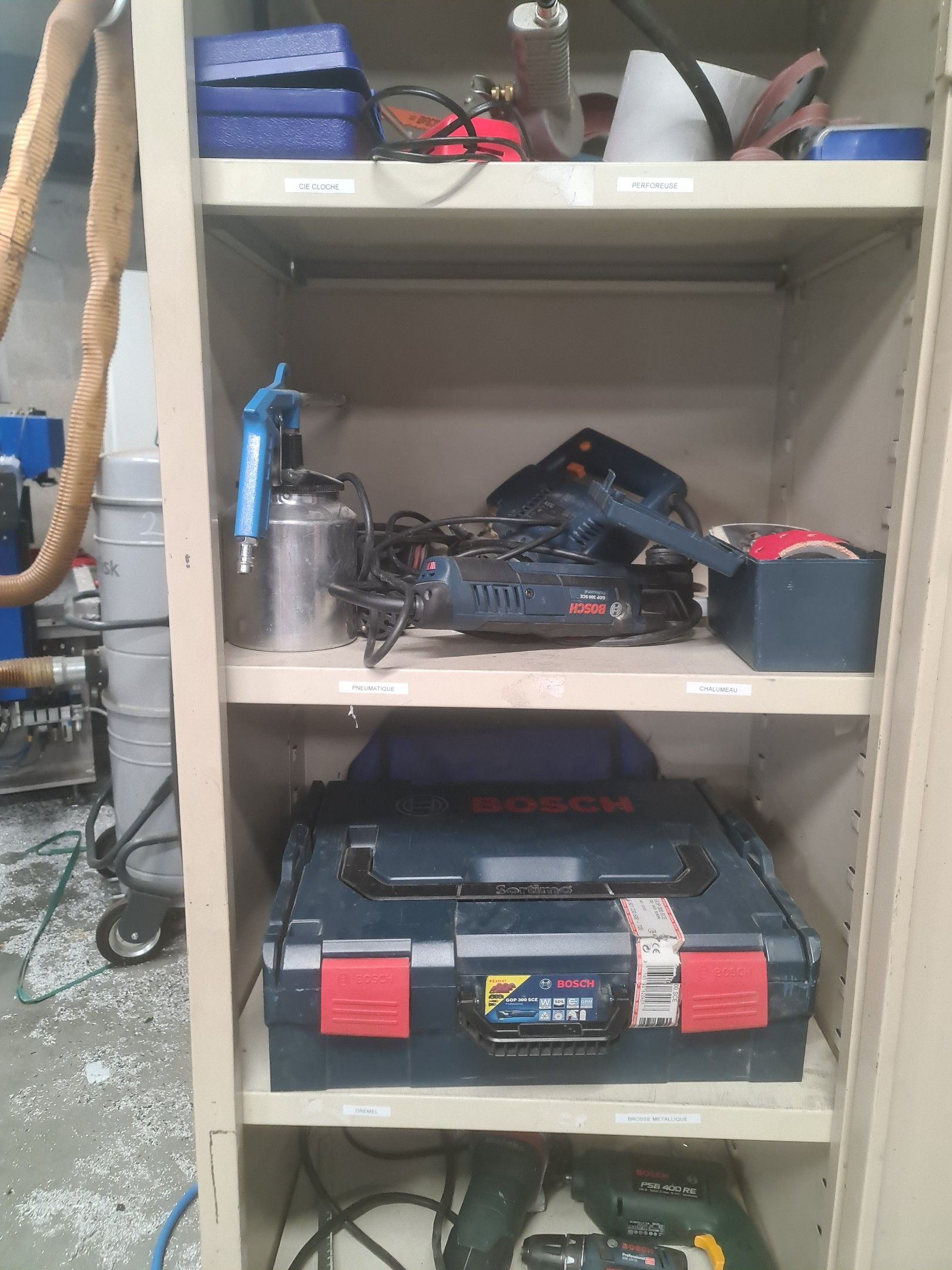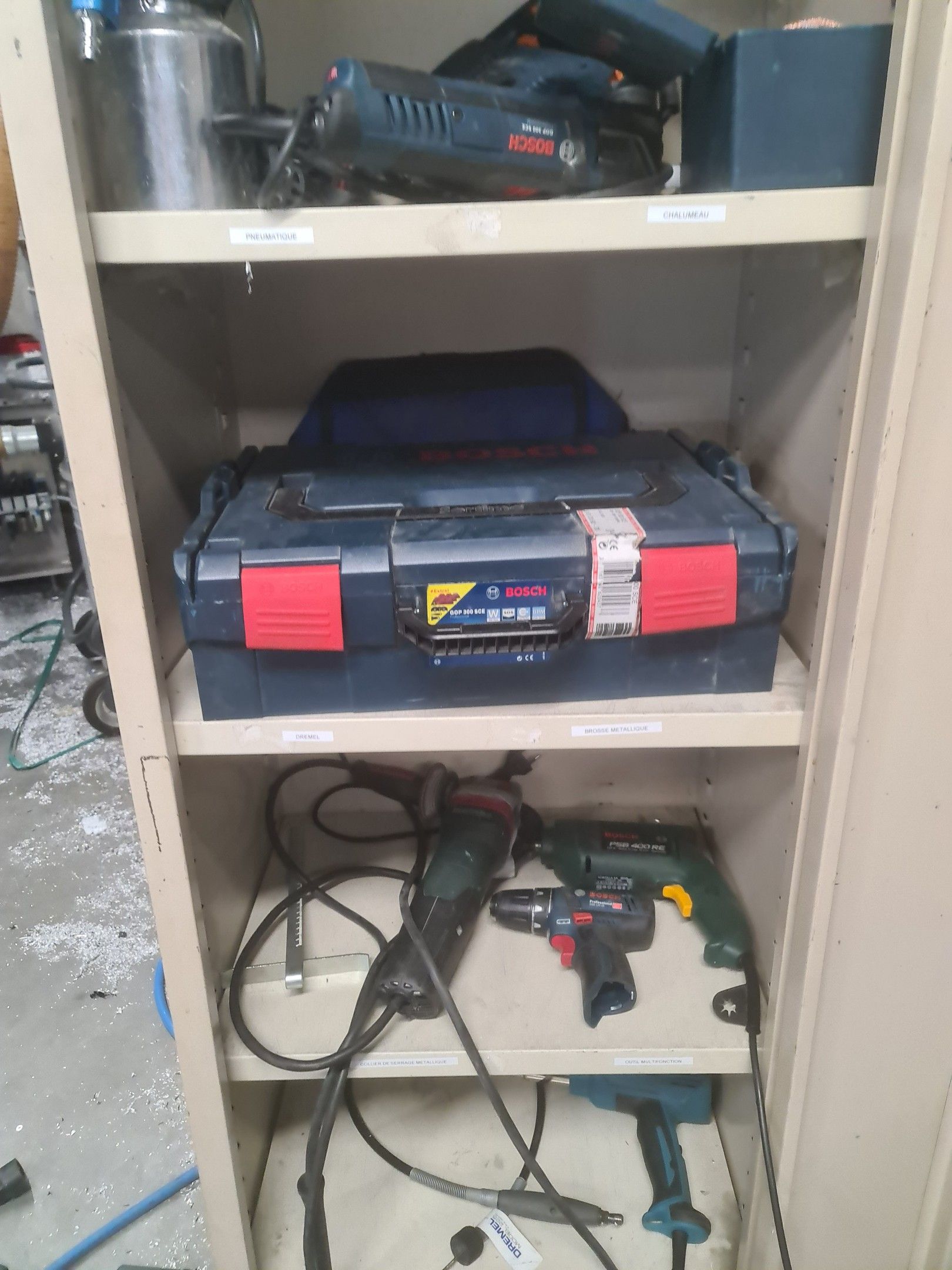 an AEG corded jigsaw, a Bosch corded multifunction tool, Bosch accessories, 3 empty METABO cases, a MAKITA thermal scraper, a BOSCH drill, a METABO grinder, a METABO charger, all in a metal cabinet with a hinged door.