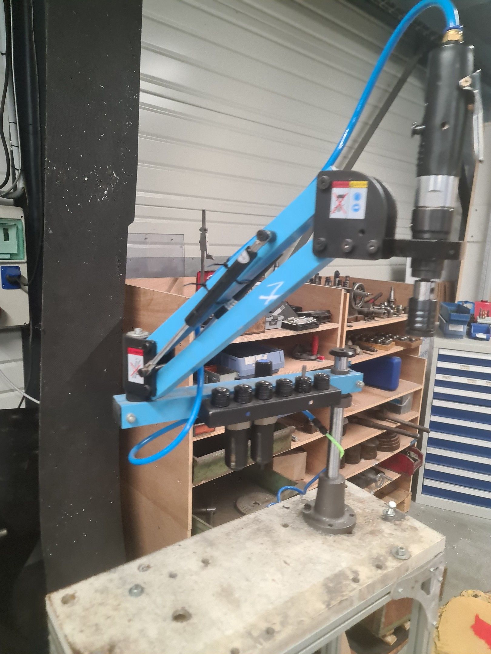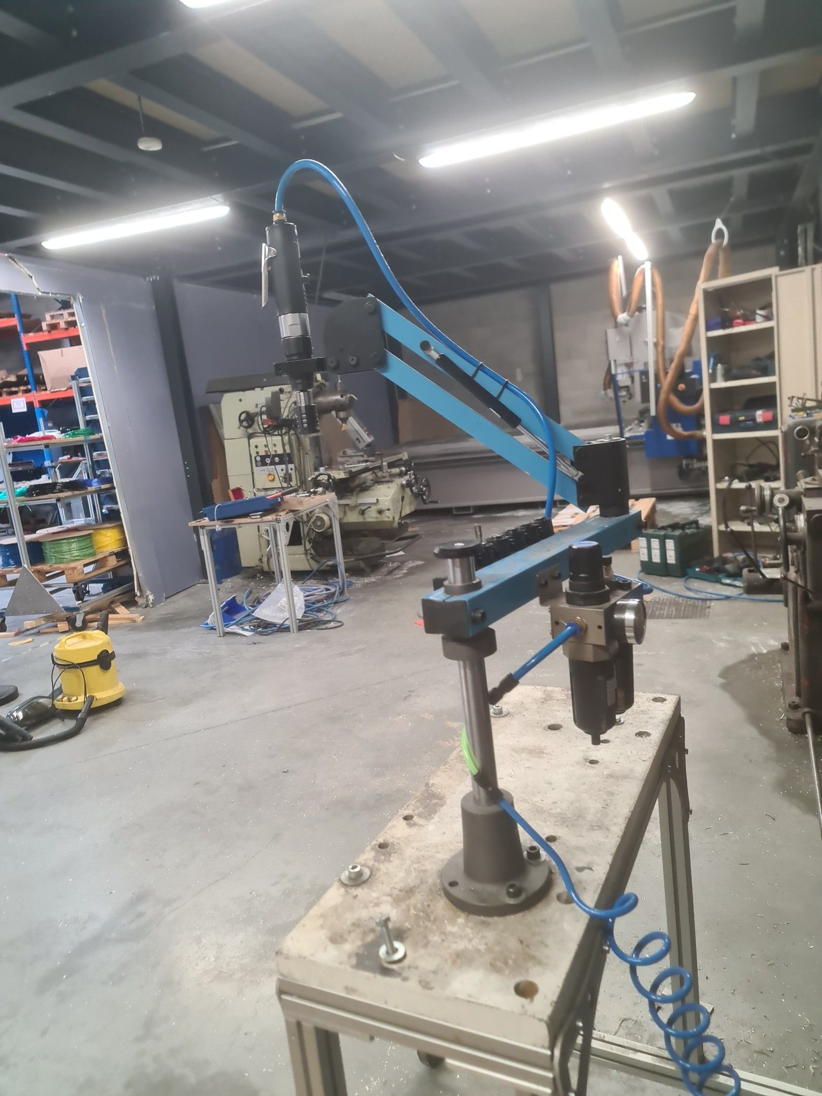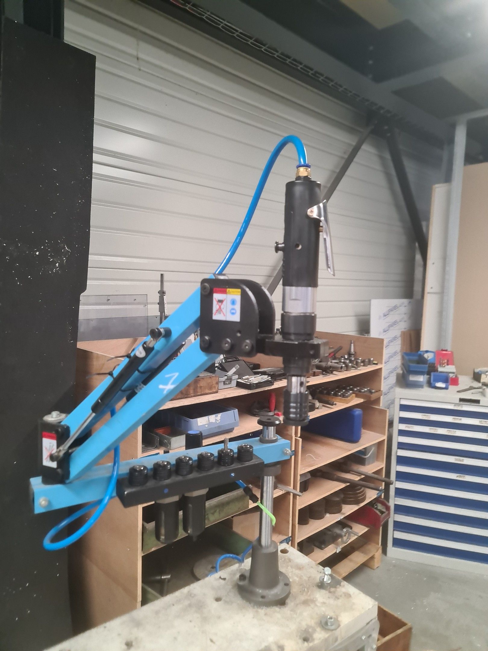 a manual tapping machine on a telescopic arm mounted on its metal carriage