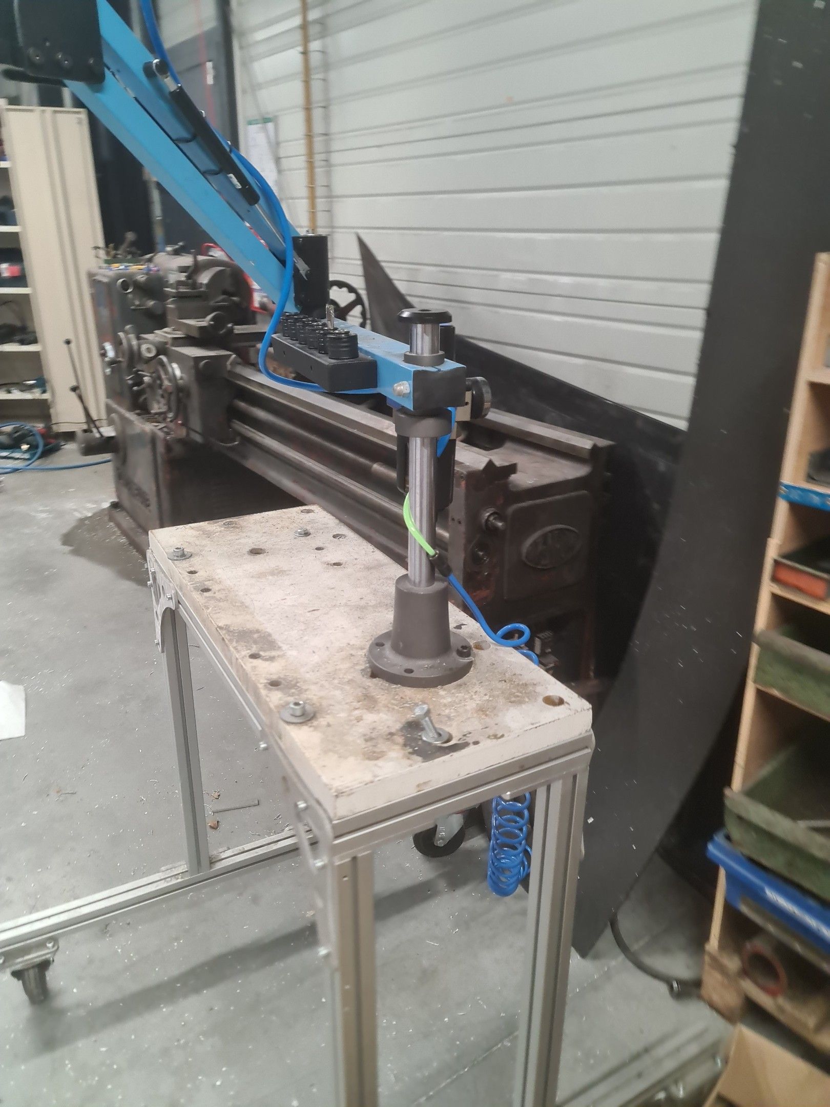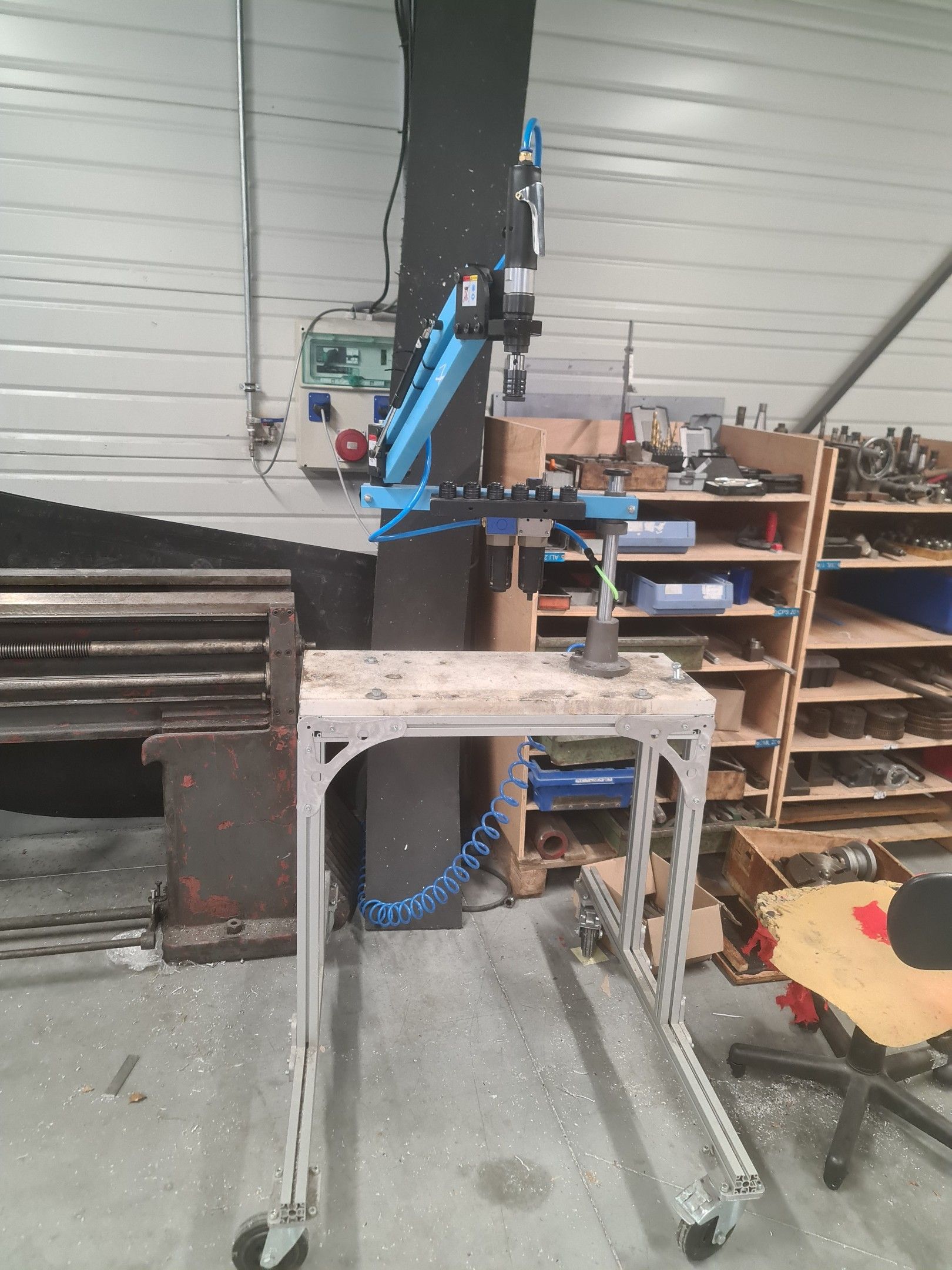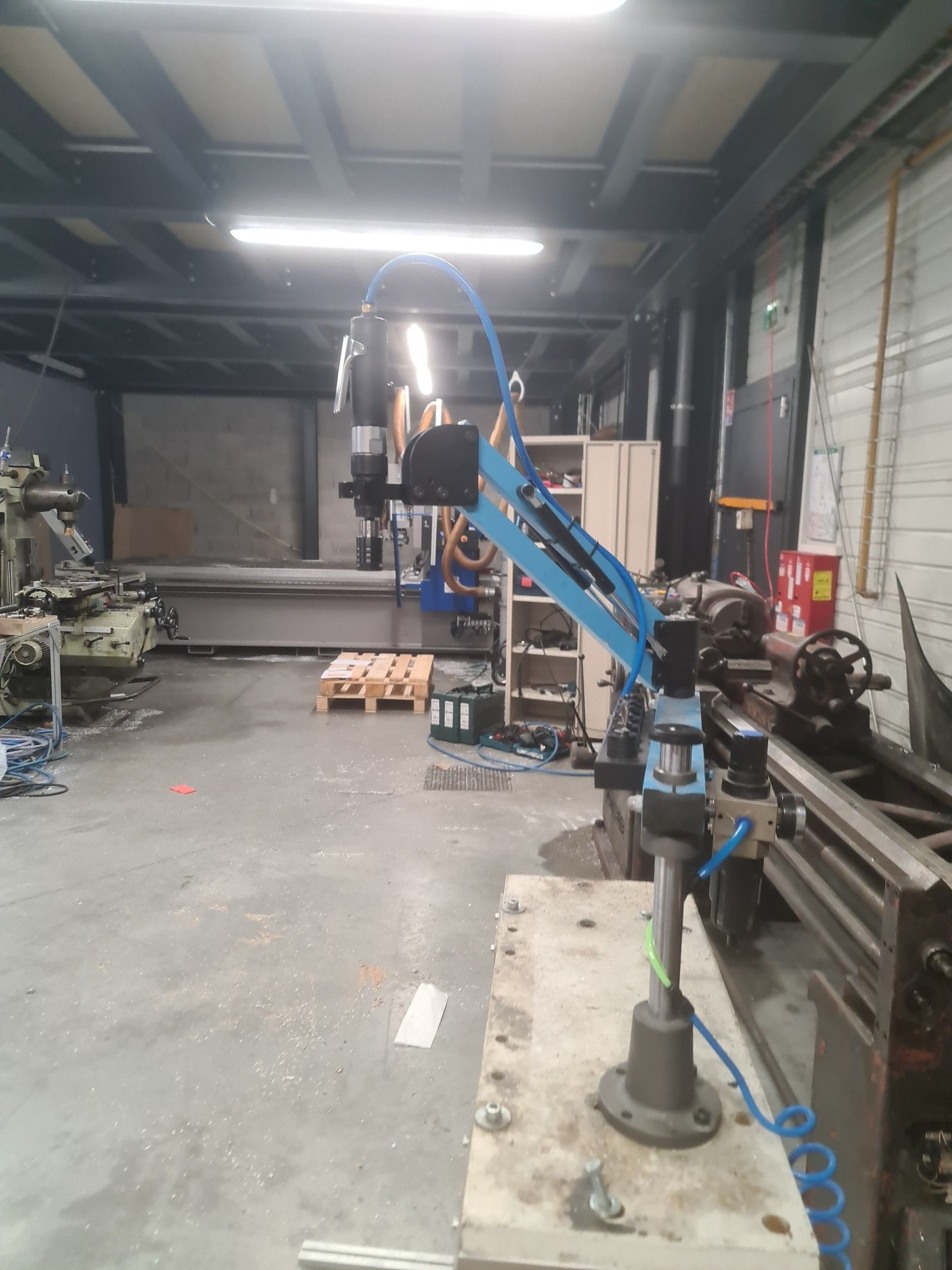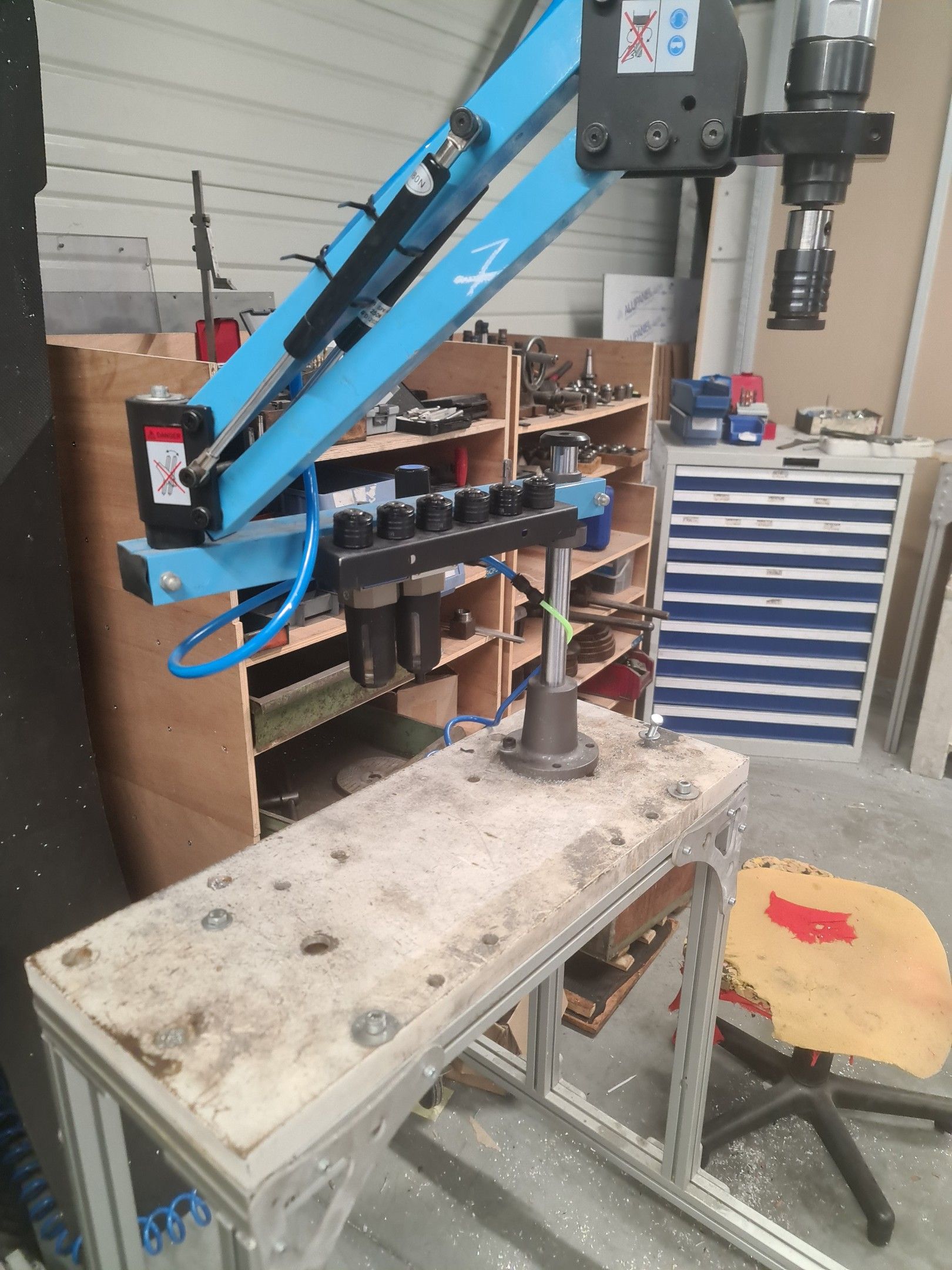 a manual tapping machine on a telescopic arm mounted on its metal carriage