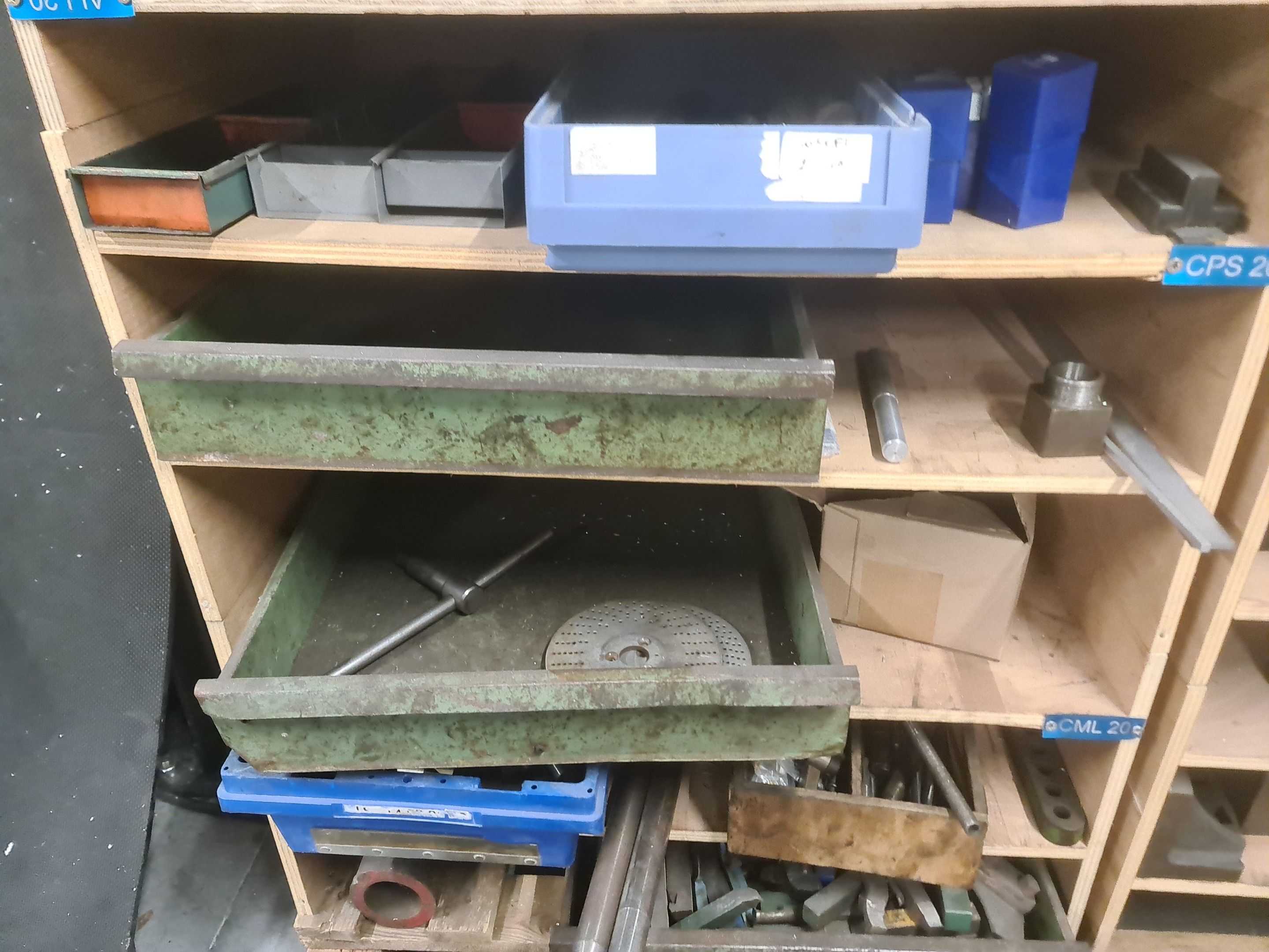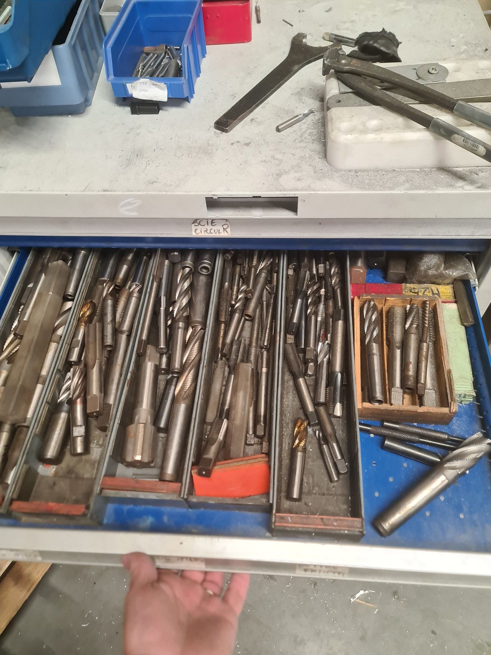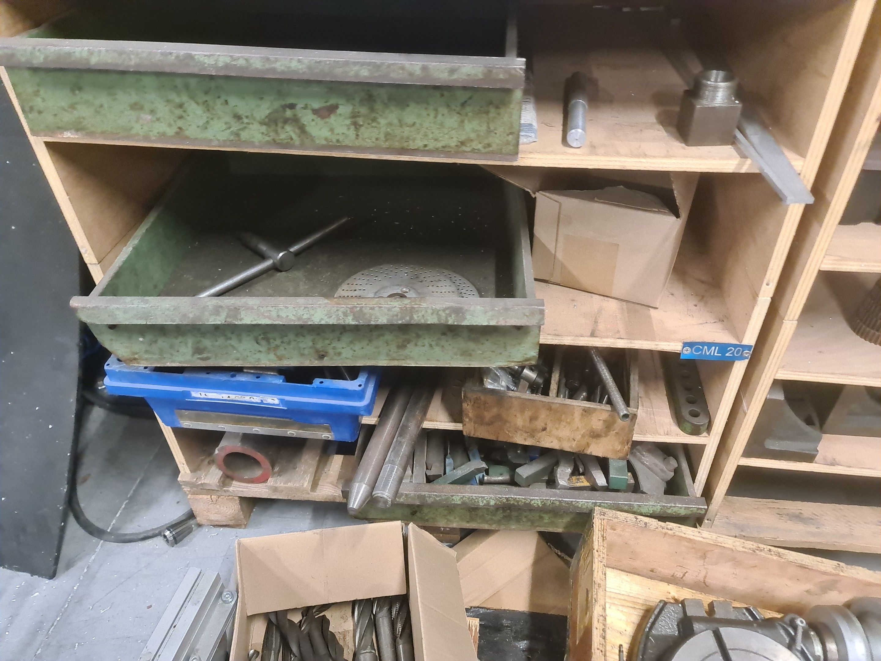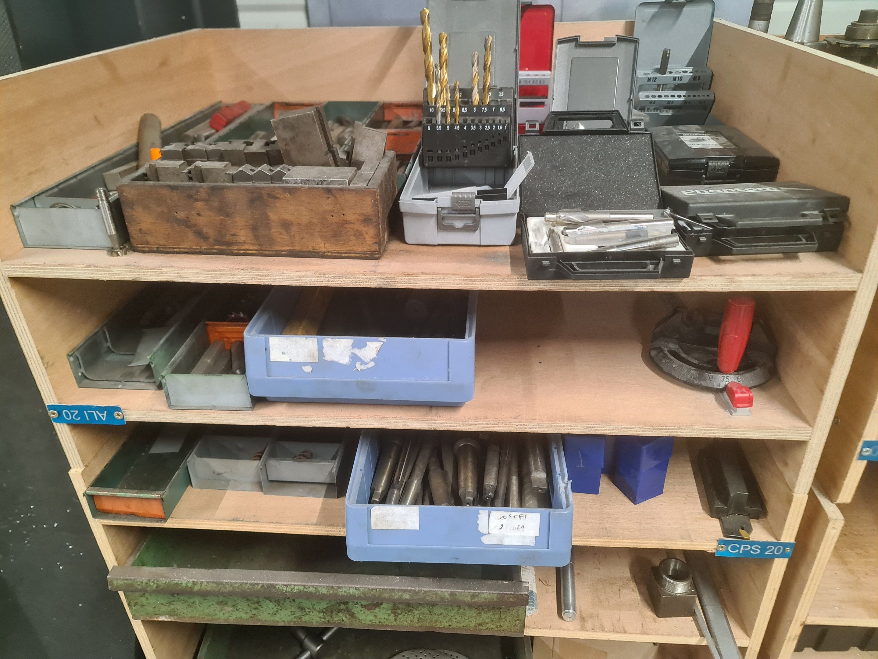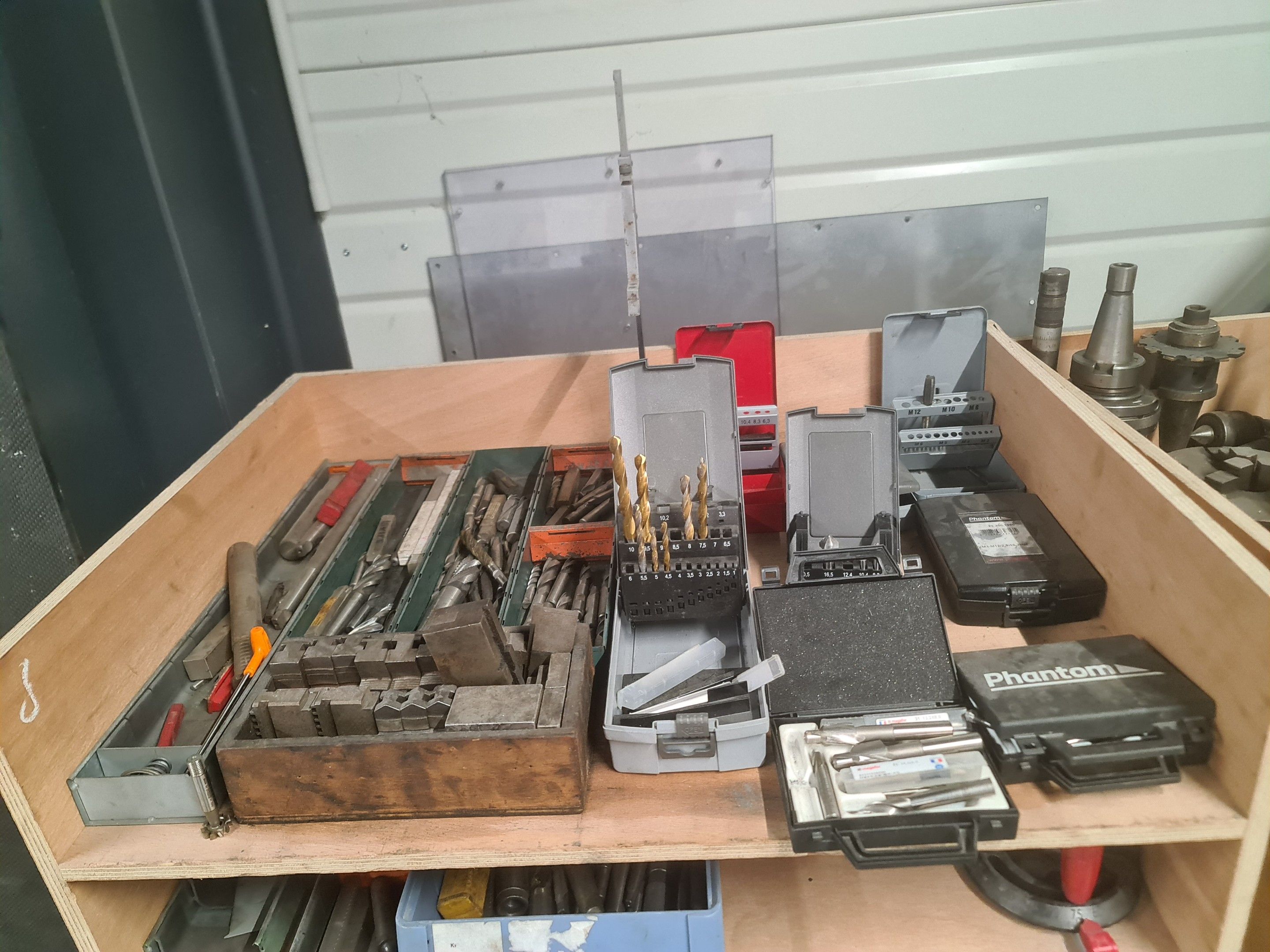 a batch of milling cutters, drills, taps and various metal parts for different machines, all in two laminated cabinets and a chest of drawers