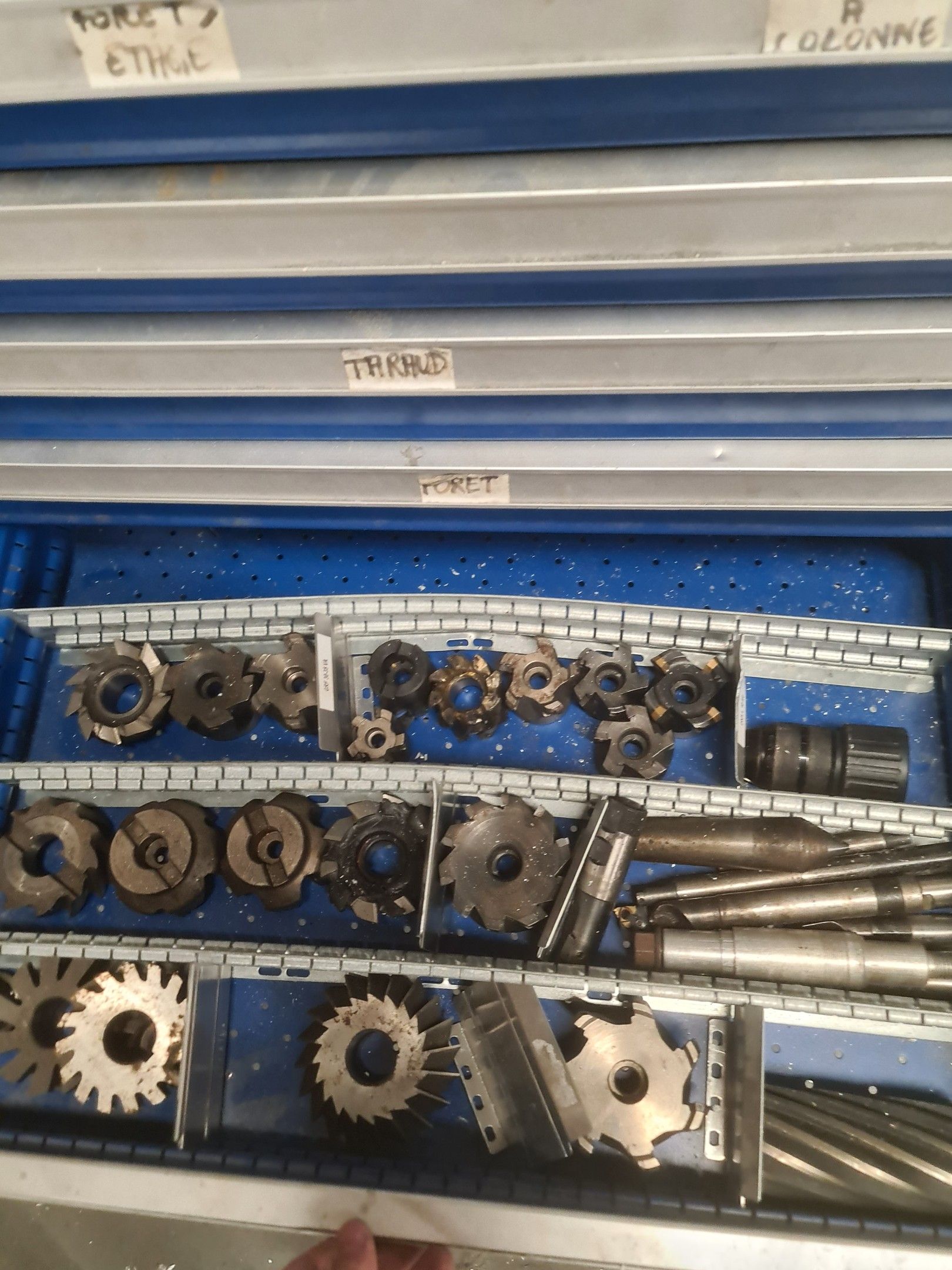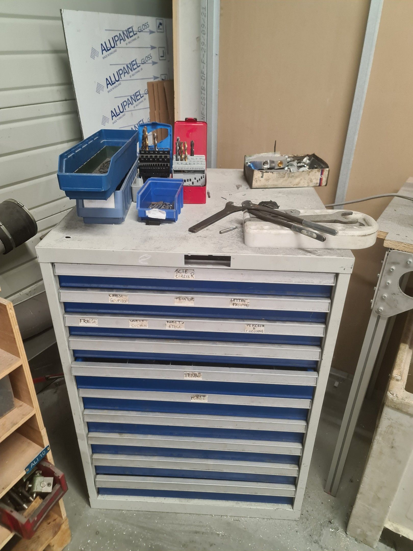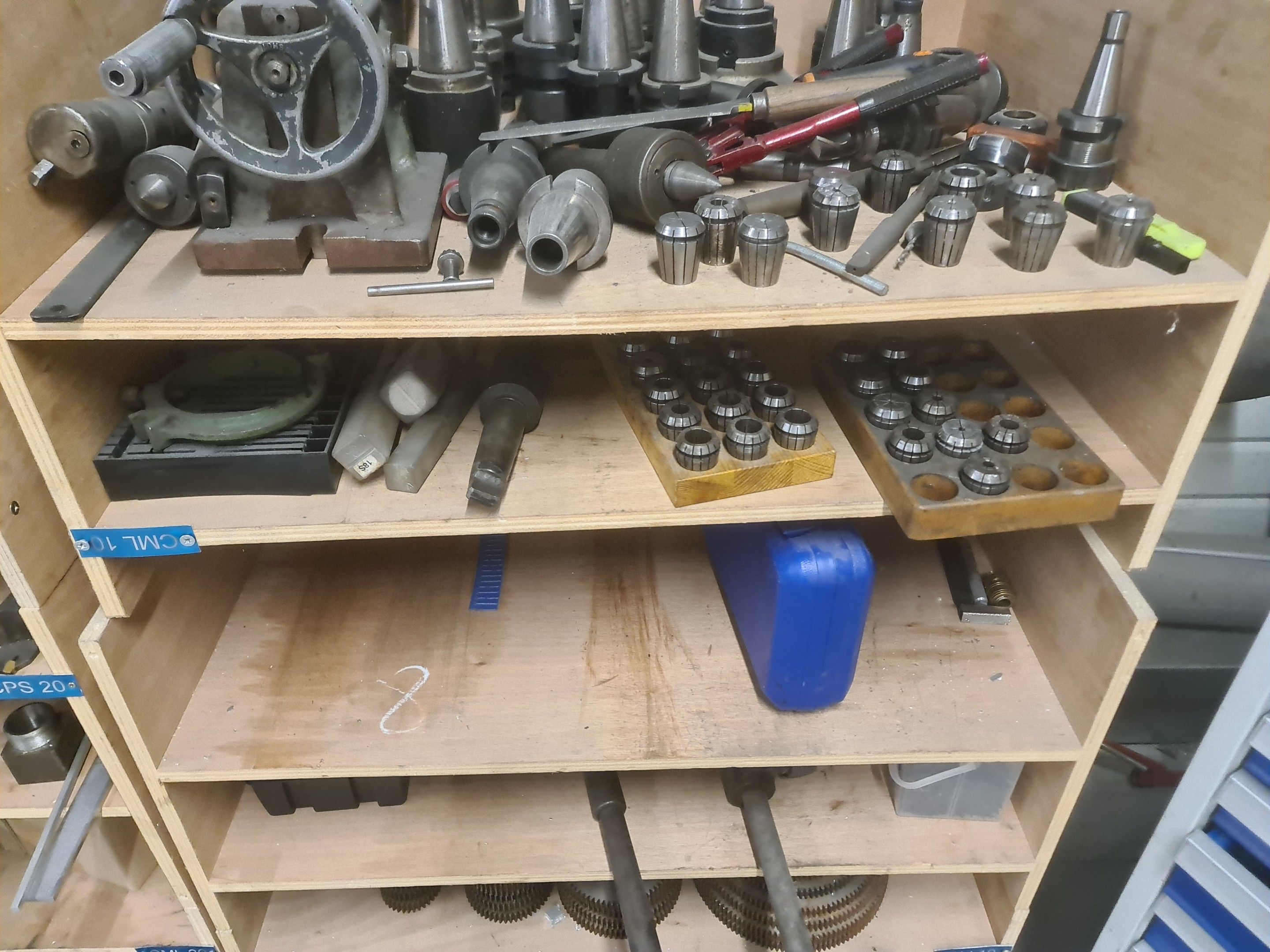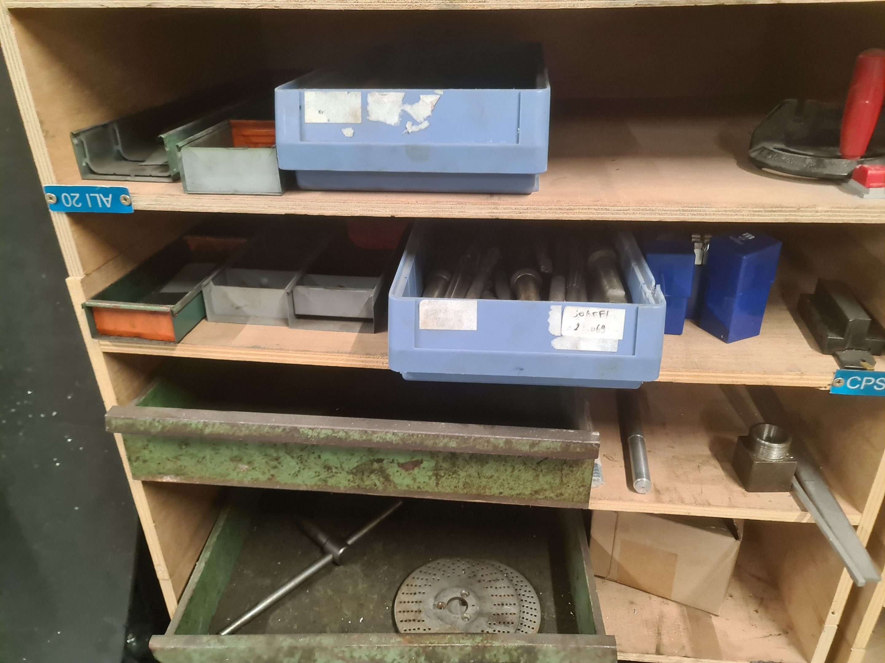 a batch of milling cutters, drills, taps and various metal parts for different machines, all in two laminated cabinets and a chest of drawers