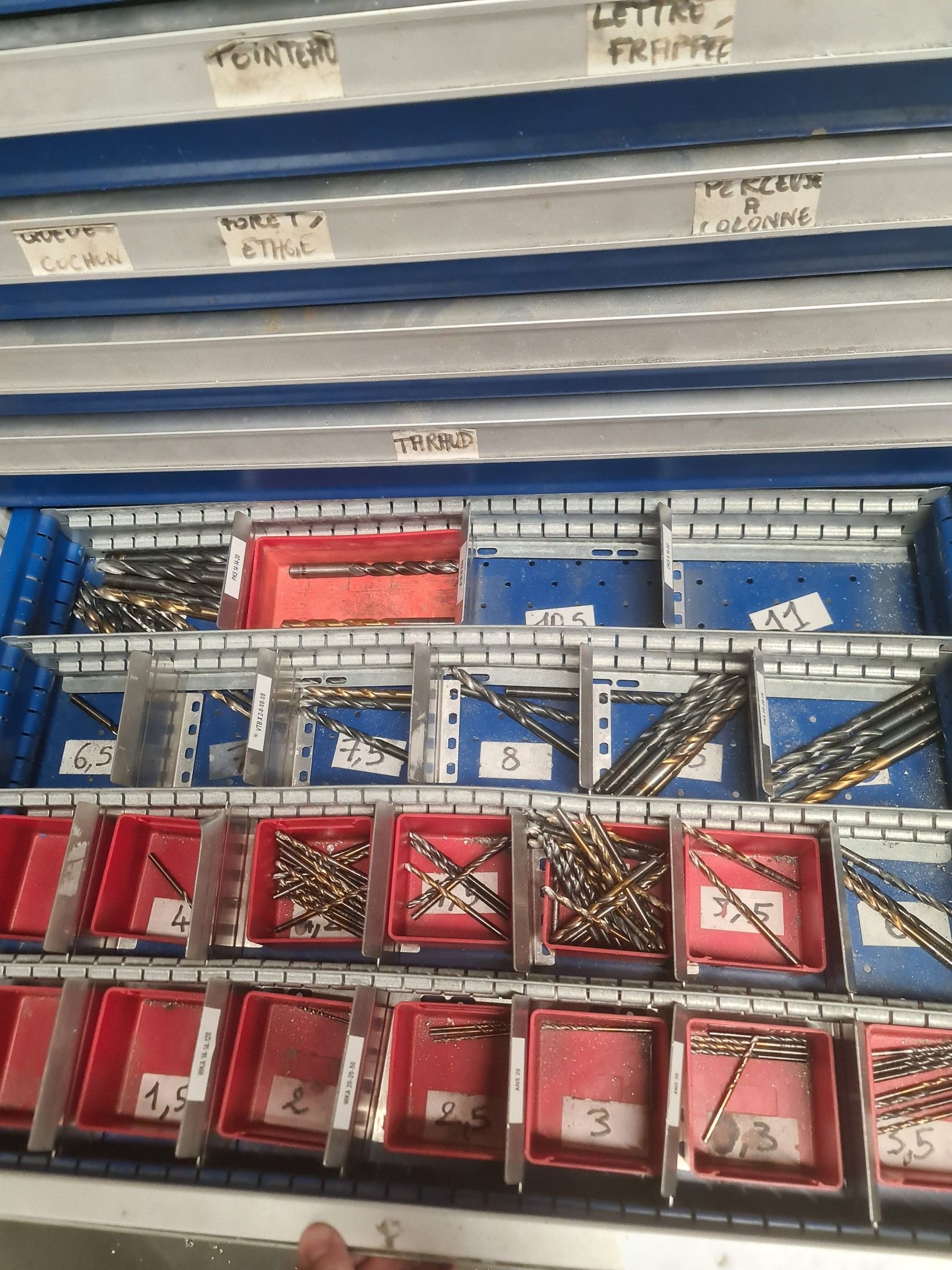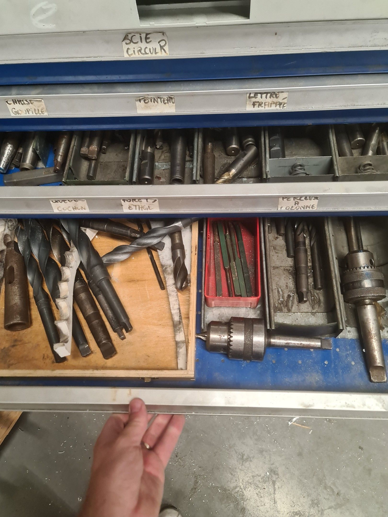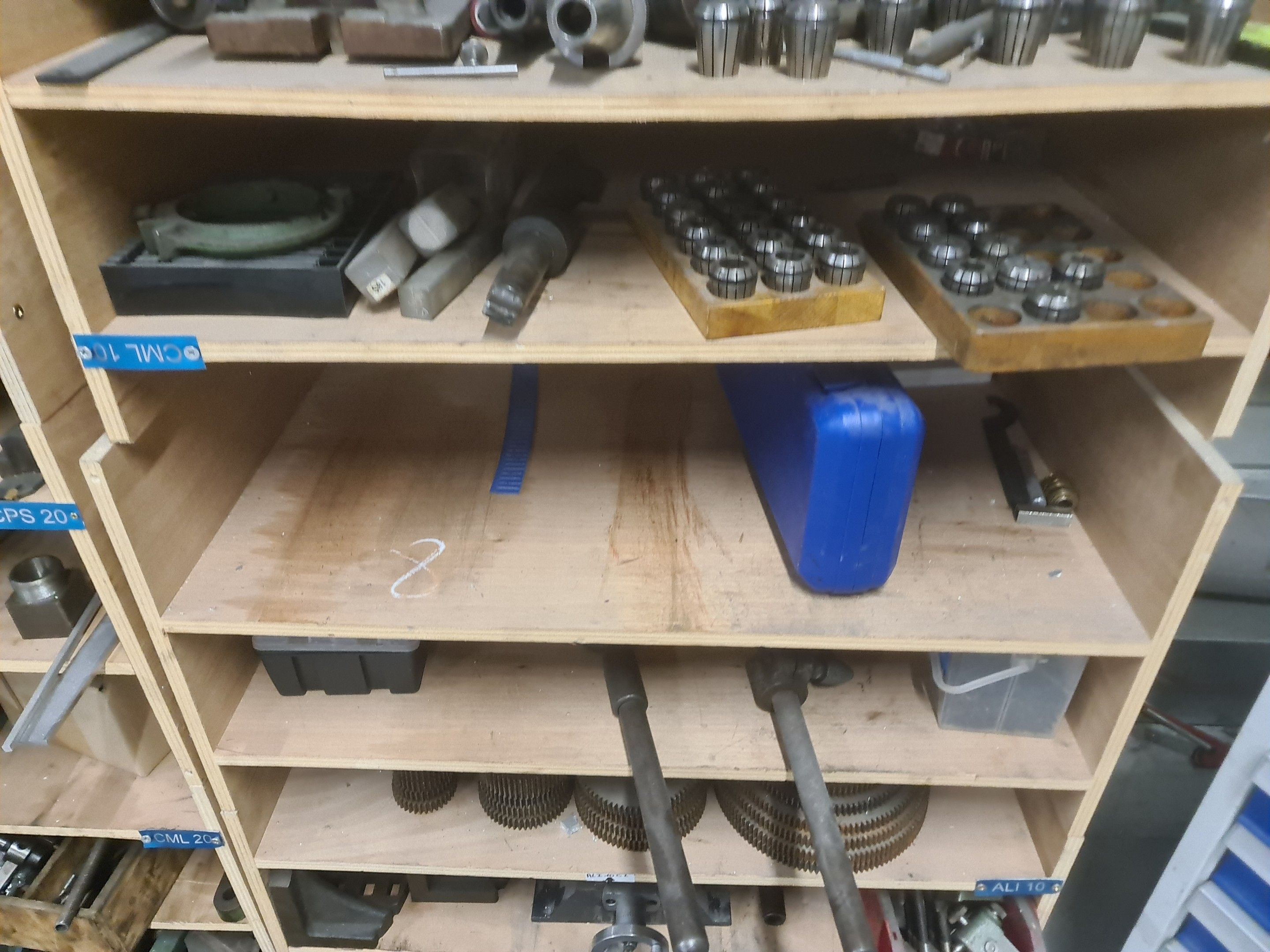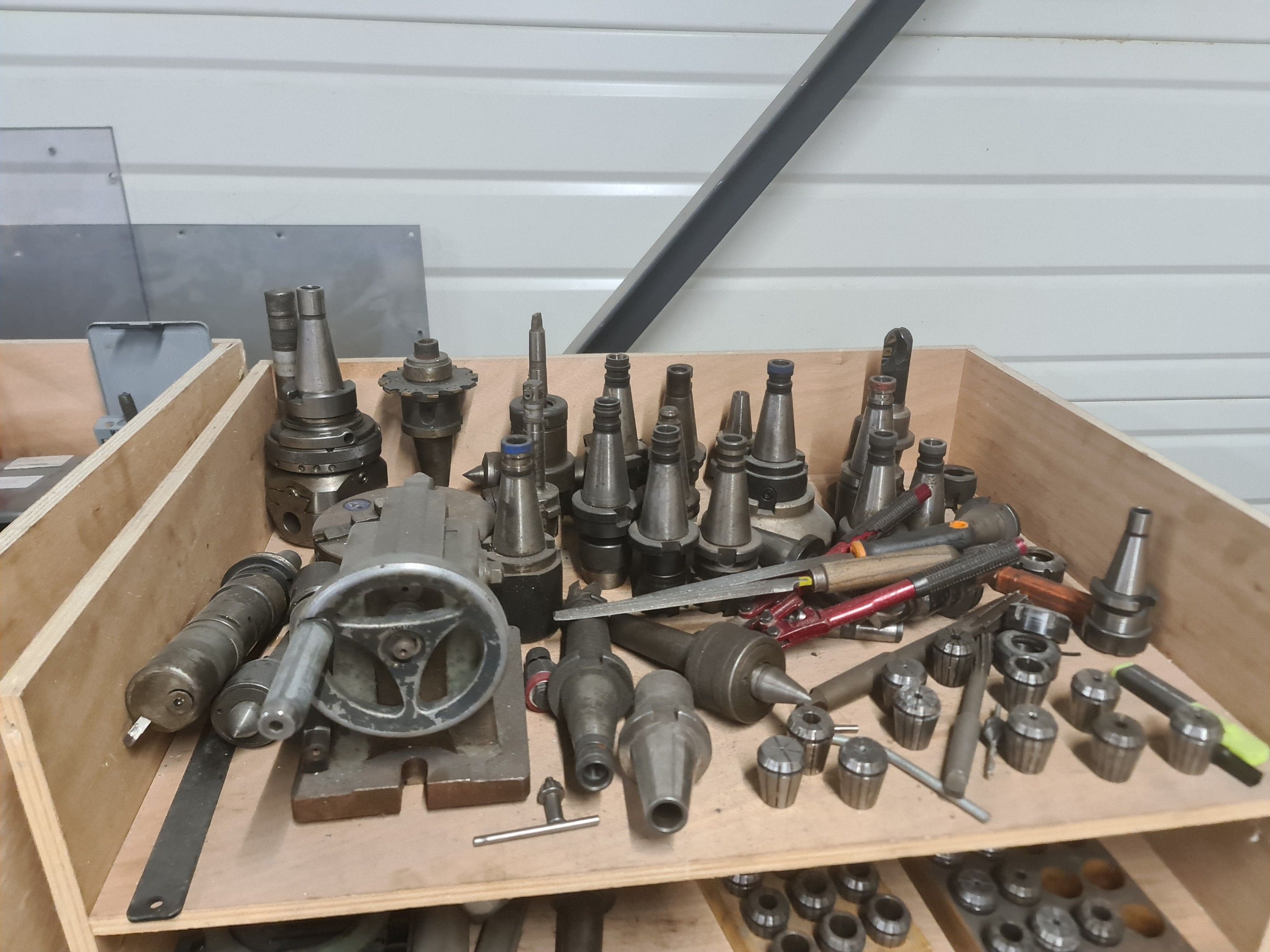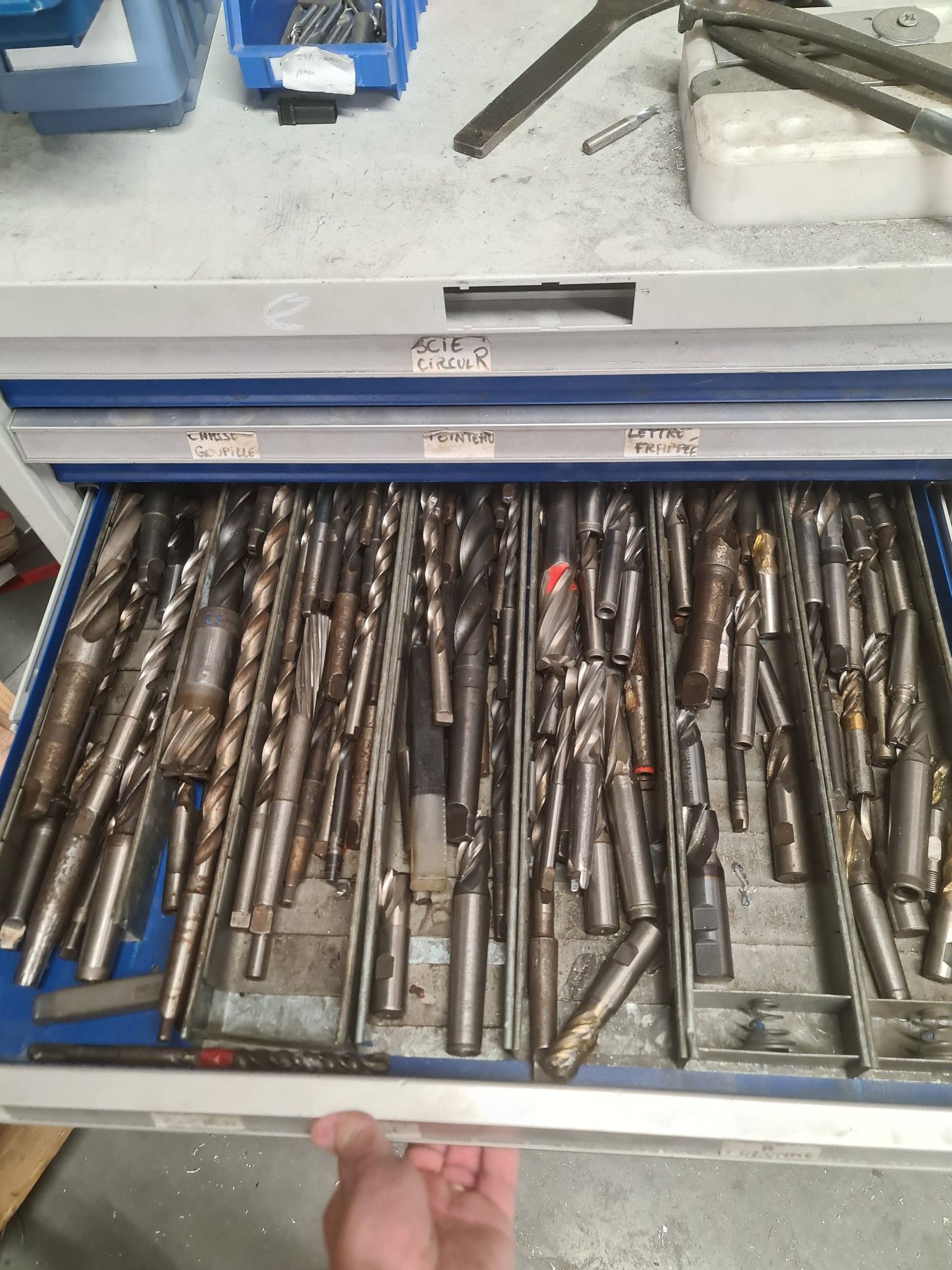a batch of milling cutters, drills, taps and various metal parts for different machines, all in two laminated cabinets and a chest of drawers