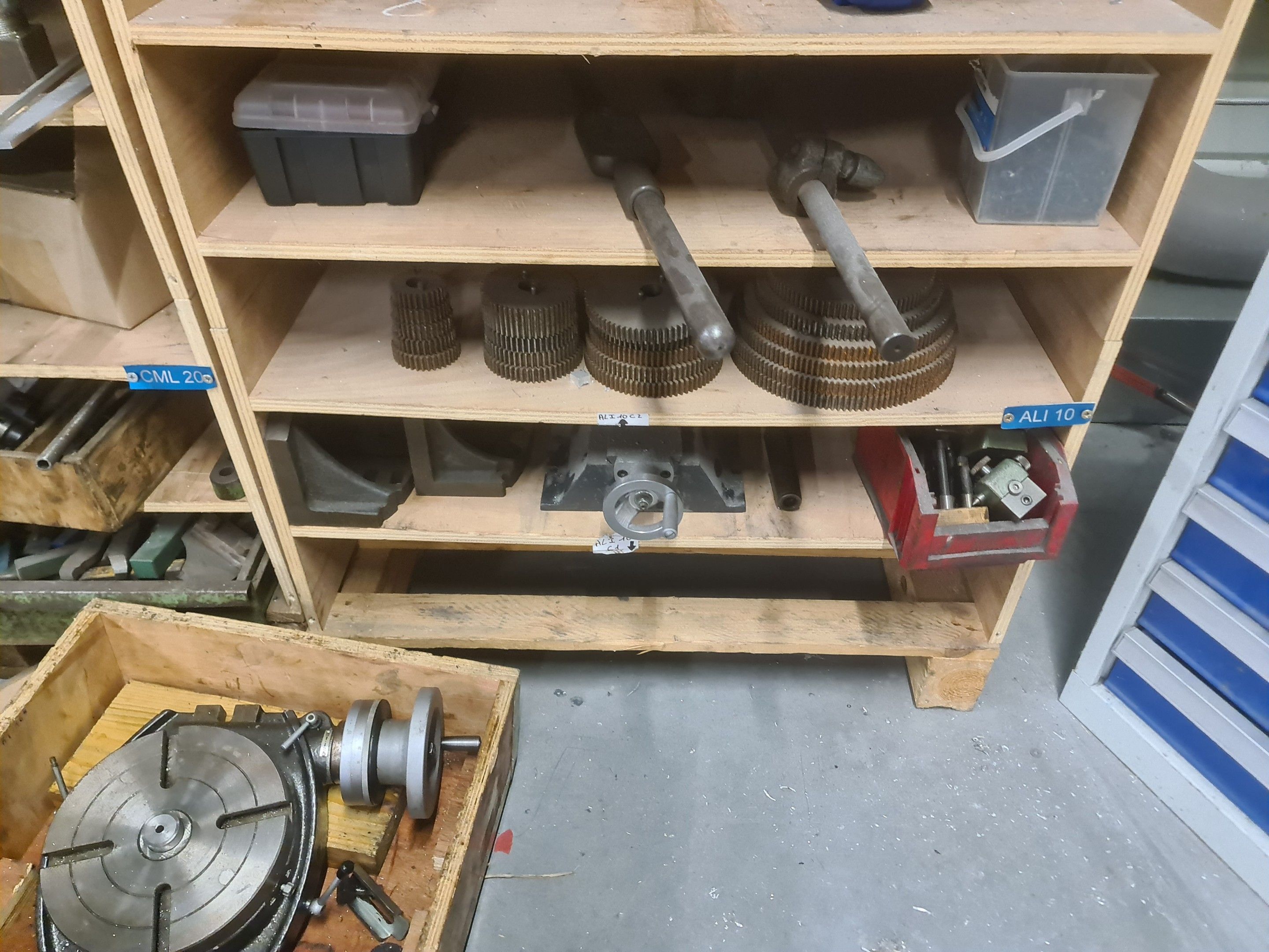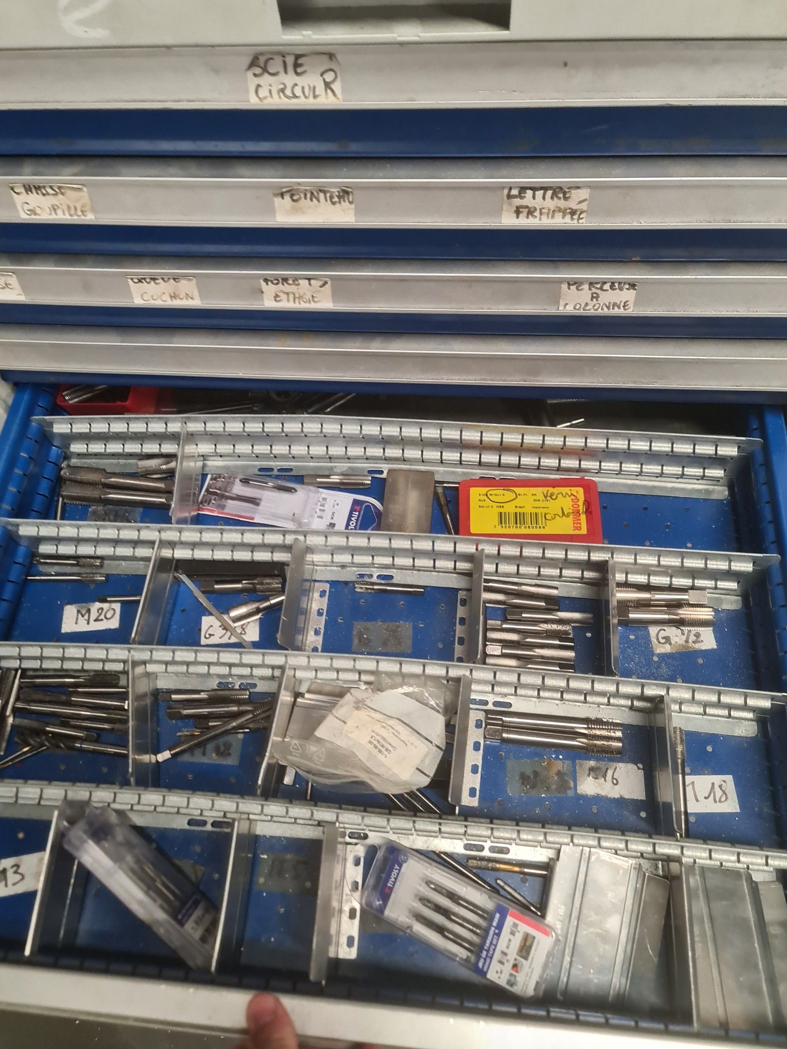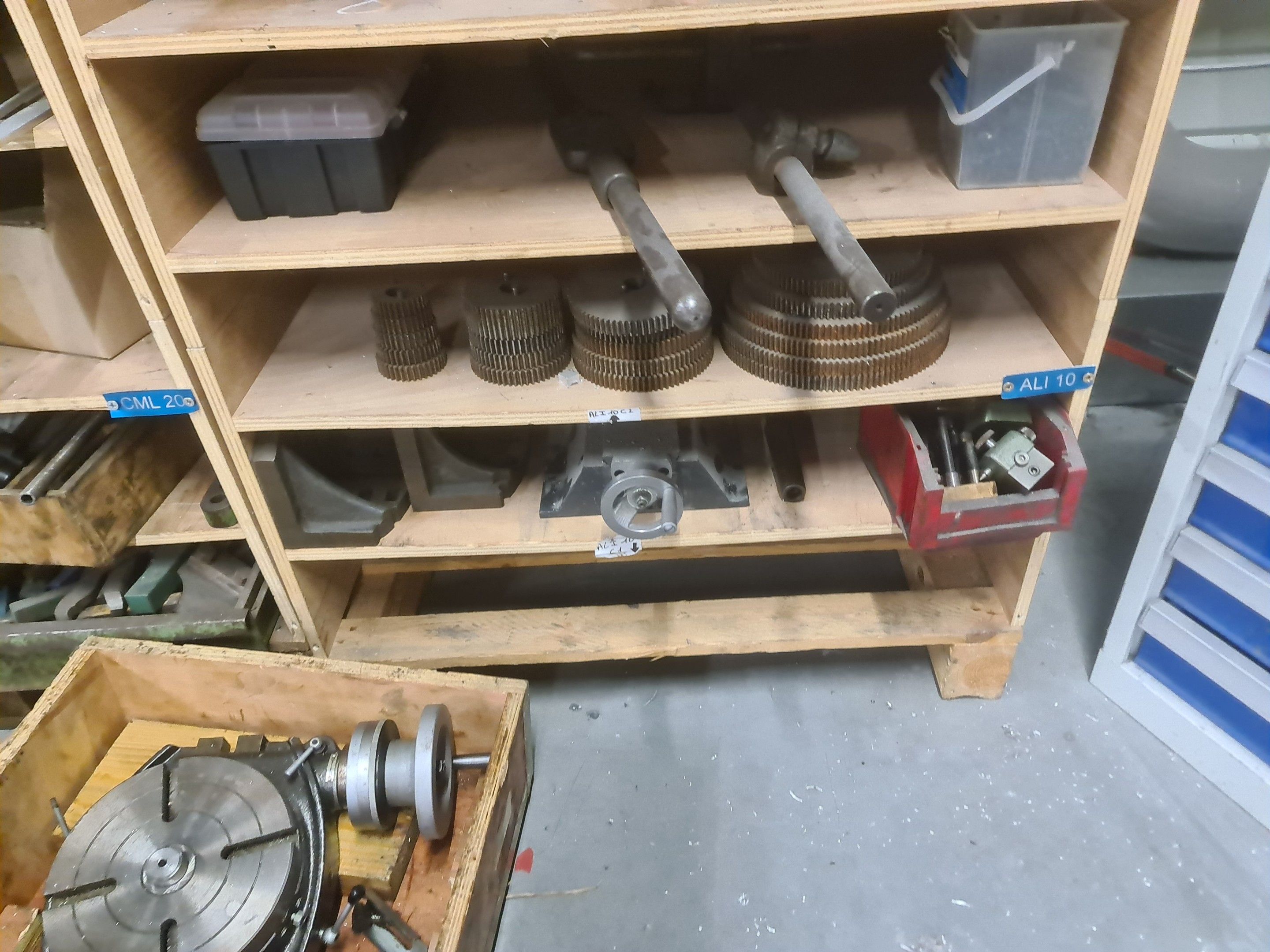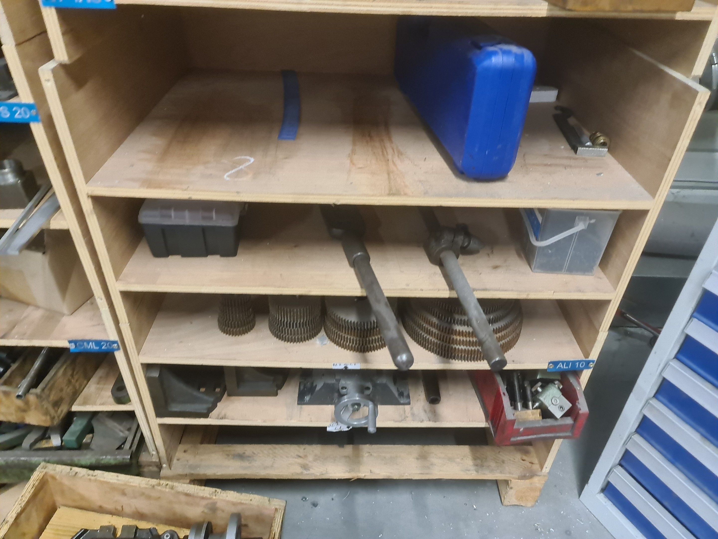a batch of milling cutters, drills, taps and various metal parts for different machines, all in two laminated cabinets and a chest of drawers