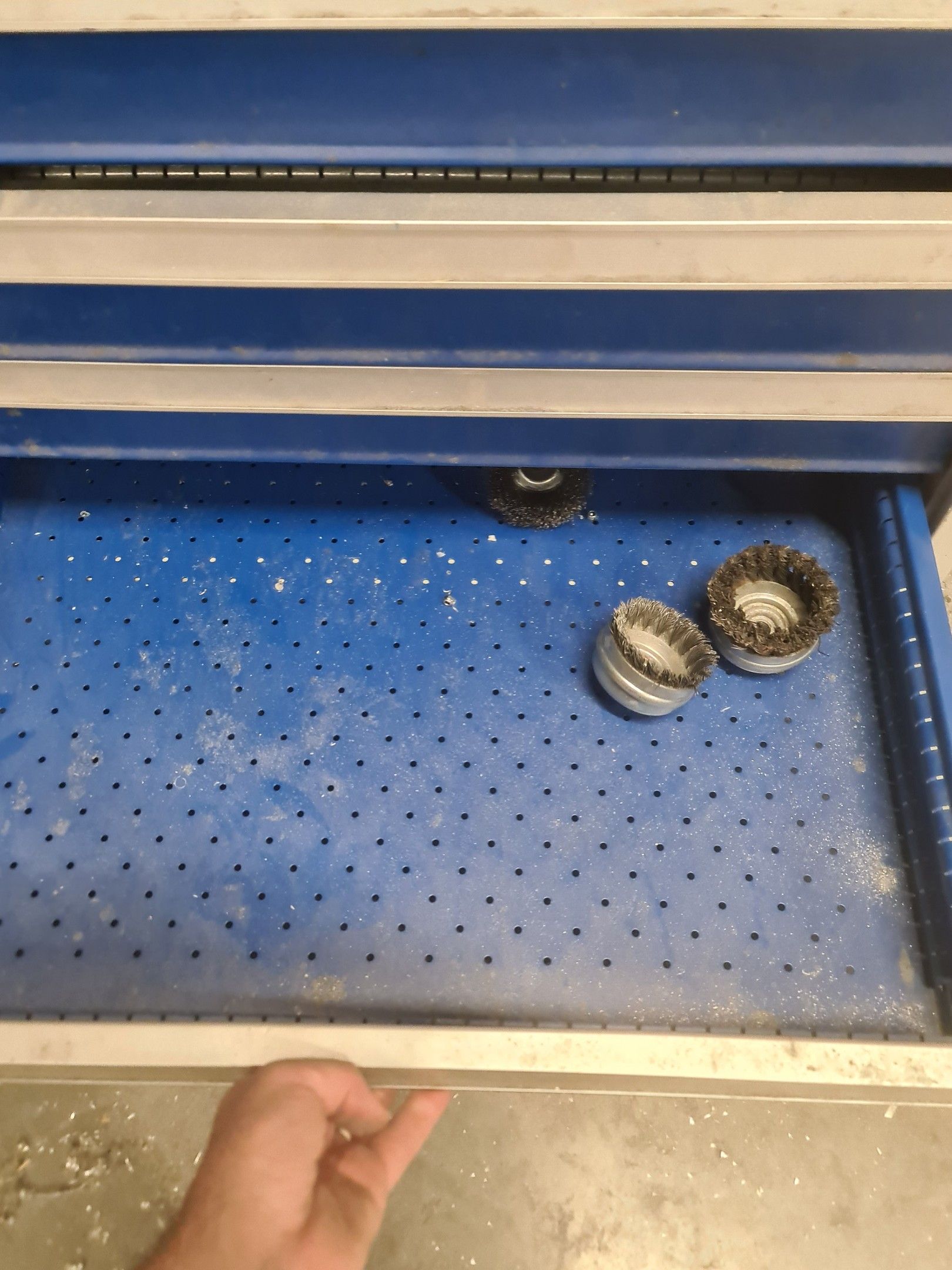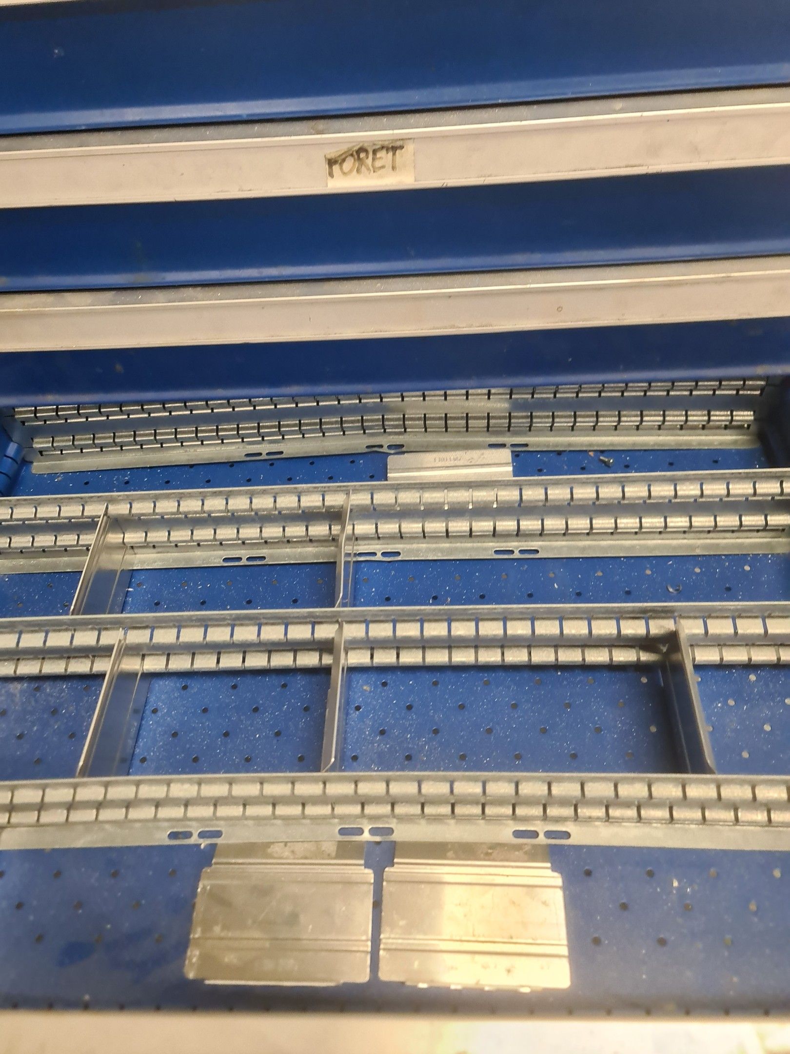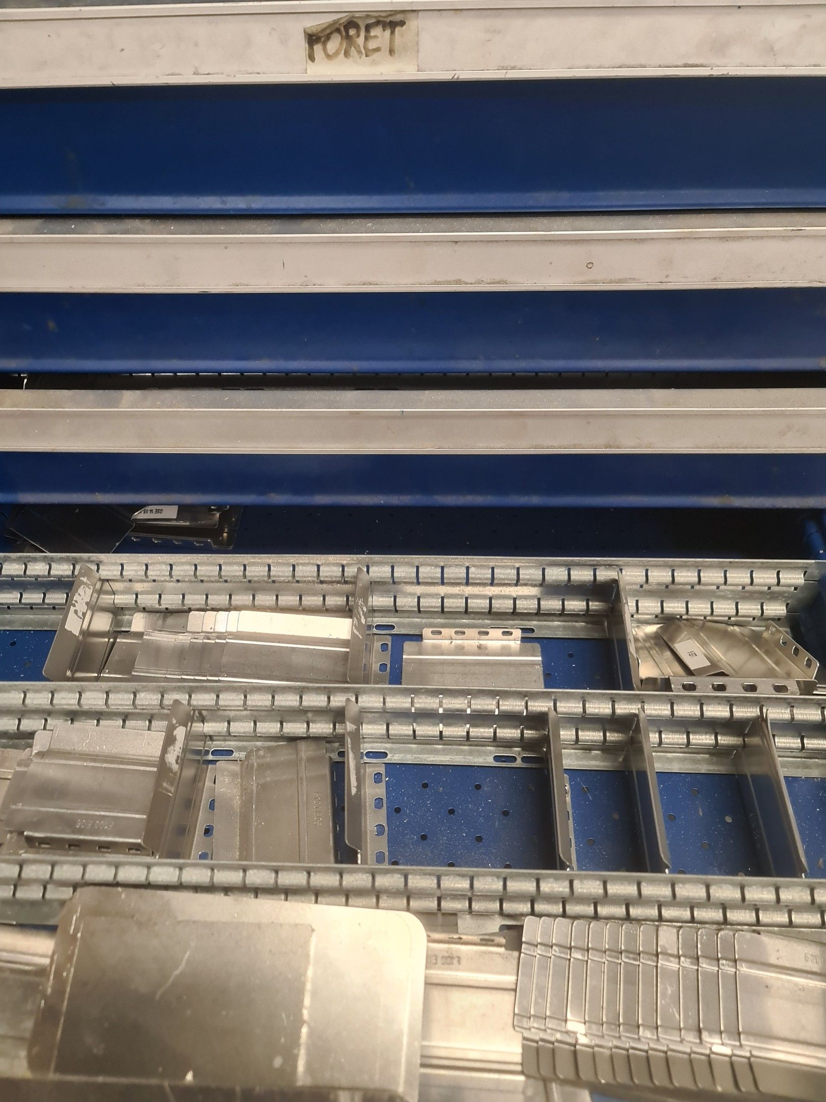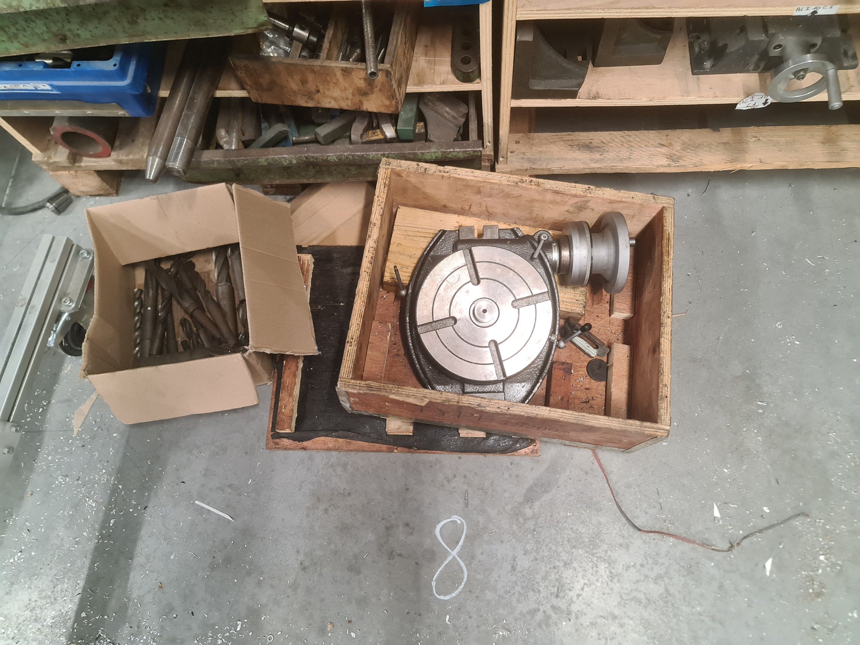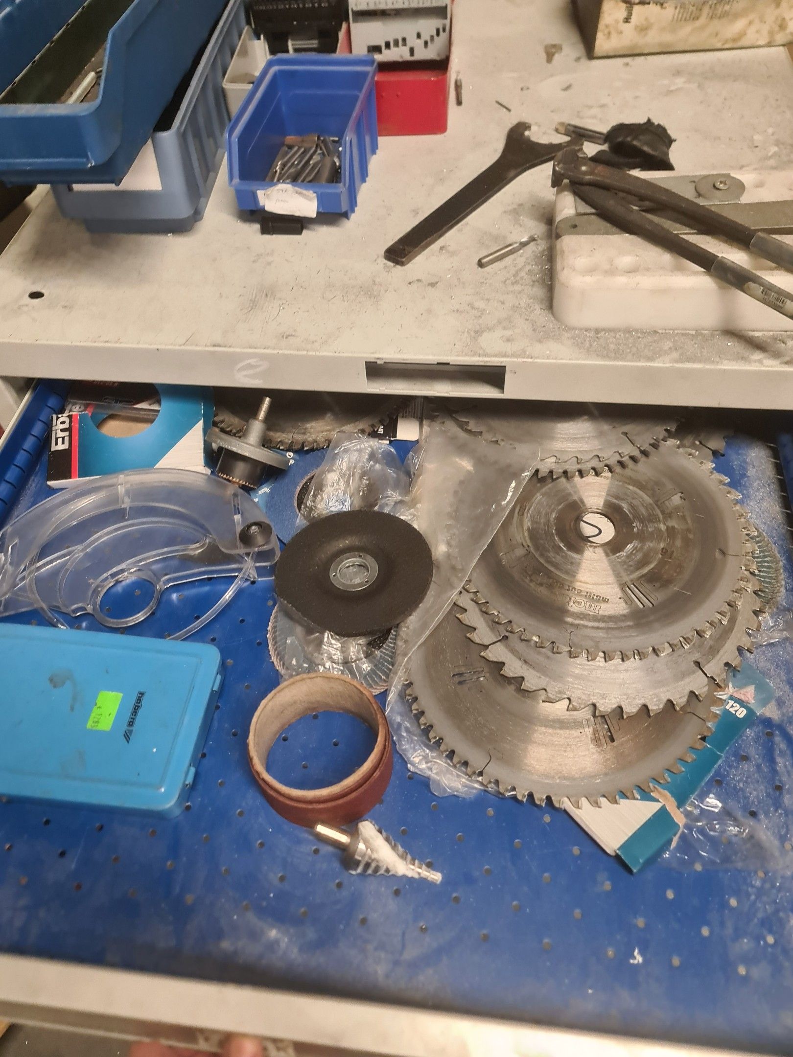 a batch of milling cutters, drills, taps and various metal parts for different machines, all in two laminated cabinets and a chest of drawers