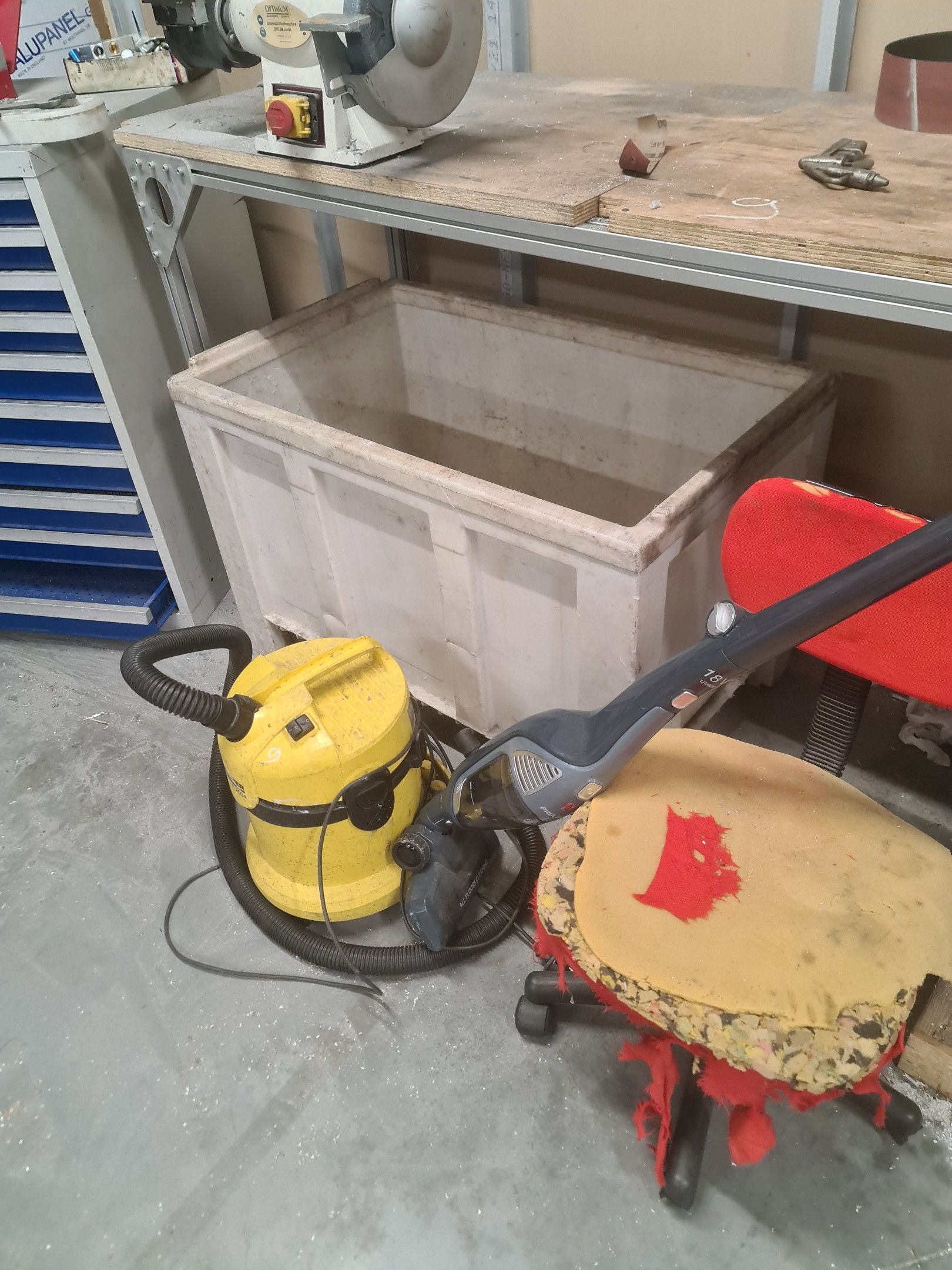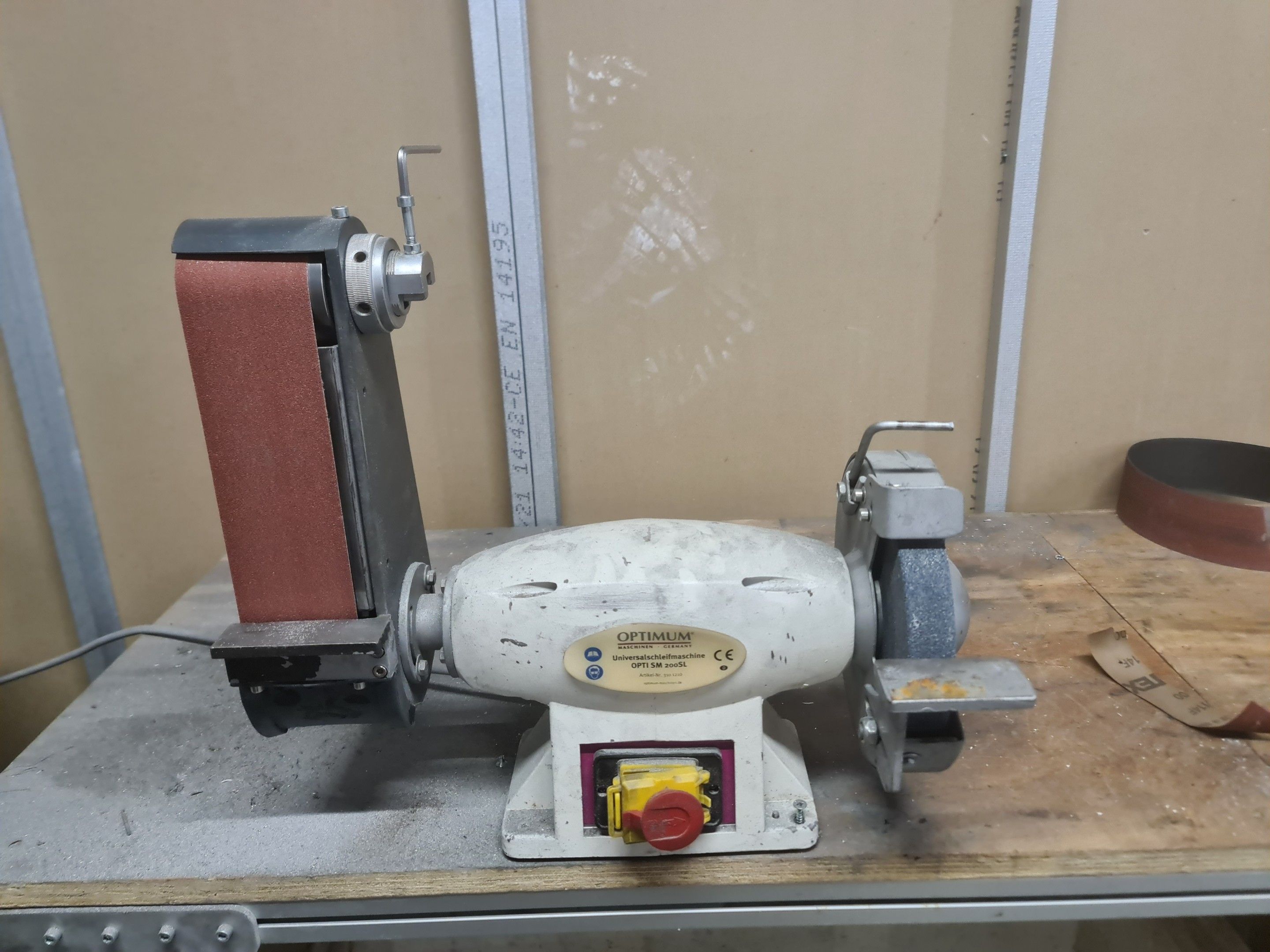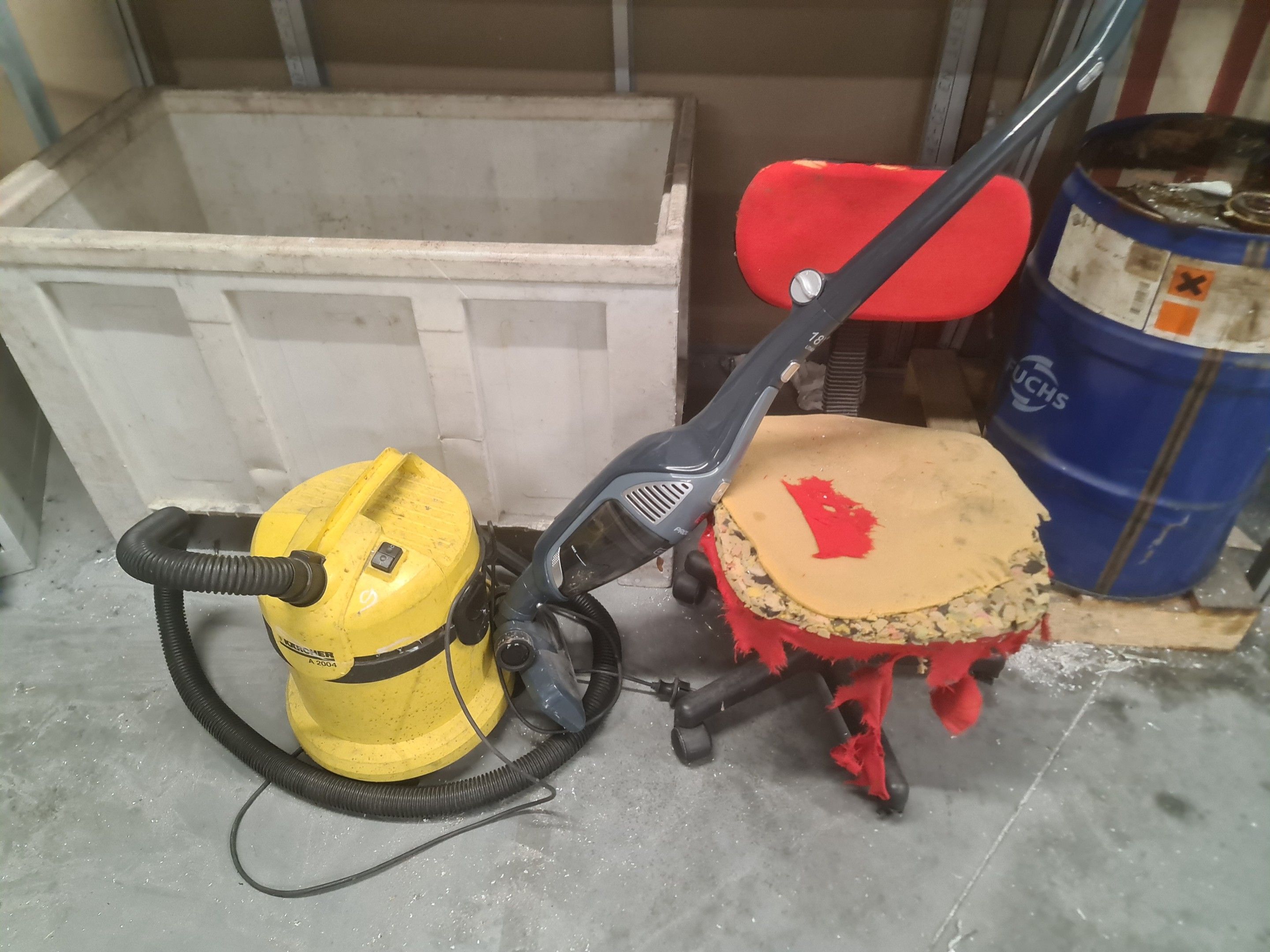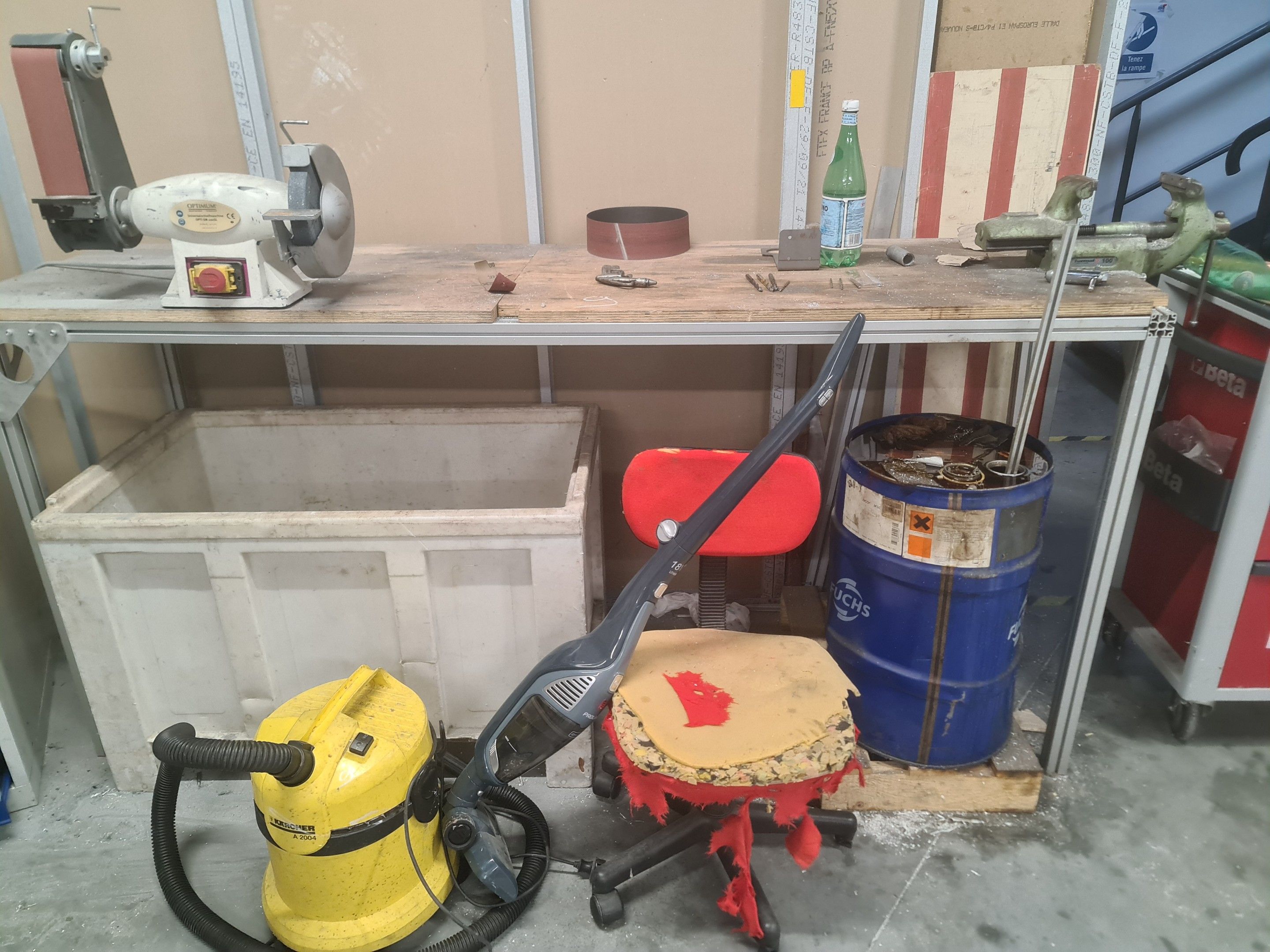 a two-head Optimum grinder with two heads, one circular and the other belt sander, a vice mounted on its workbench, an old stool, a Karcher hoover, a Proline hoover.