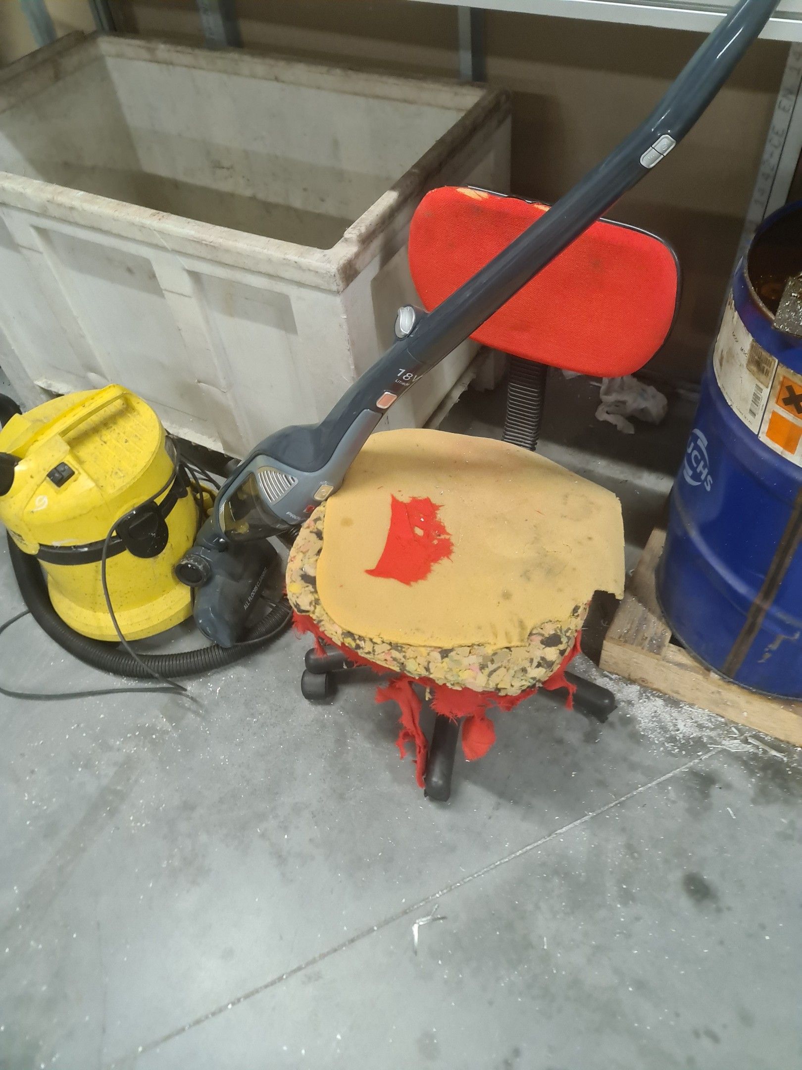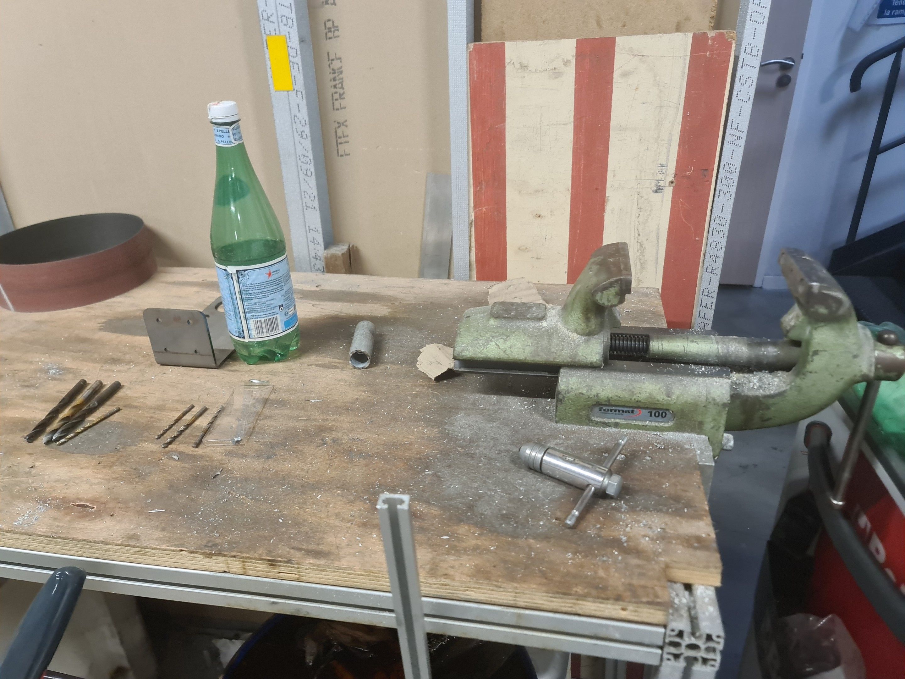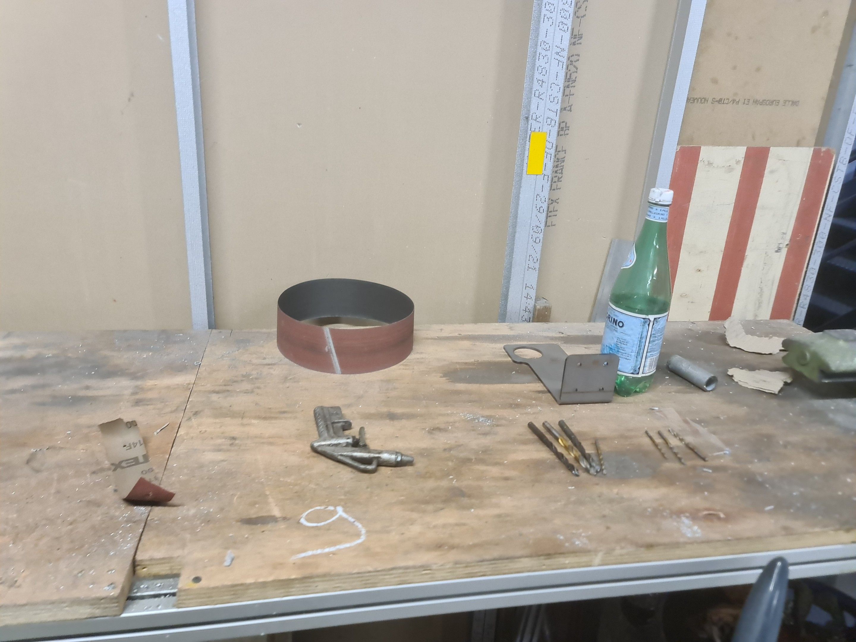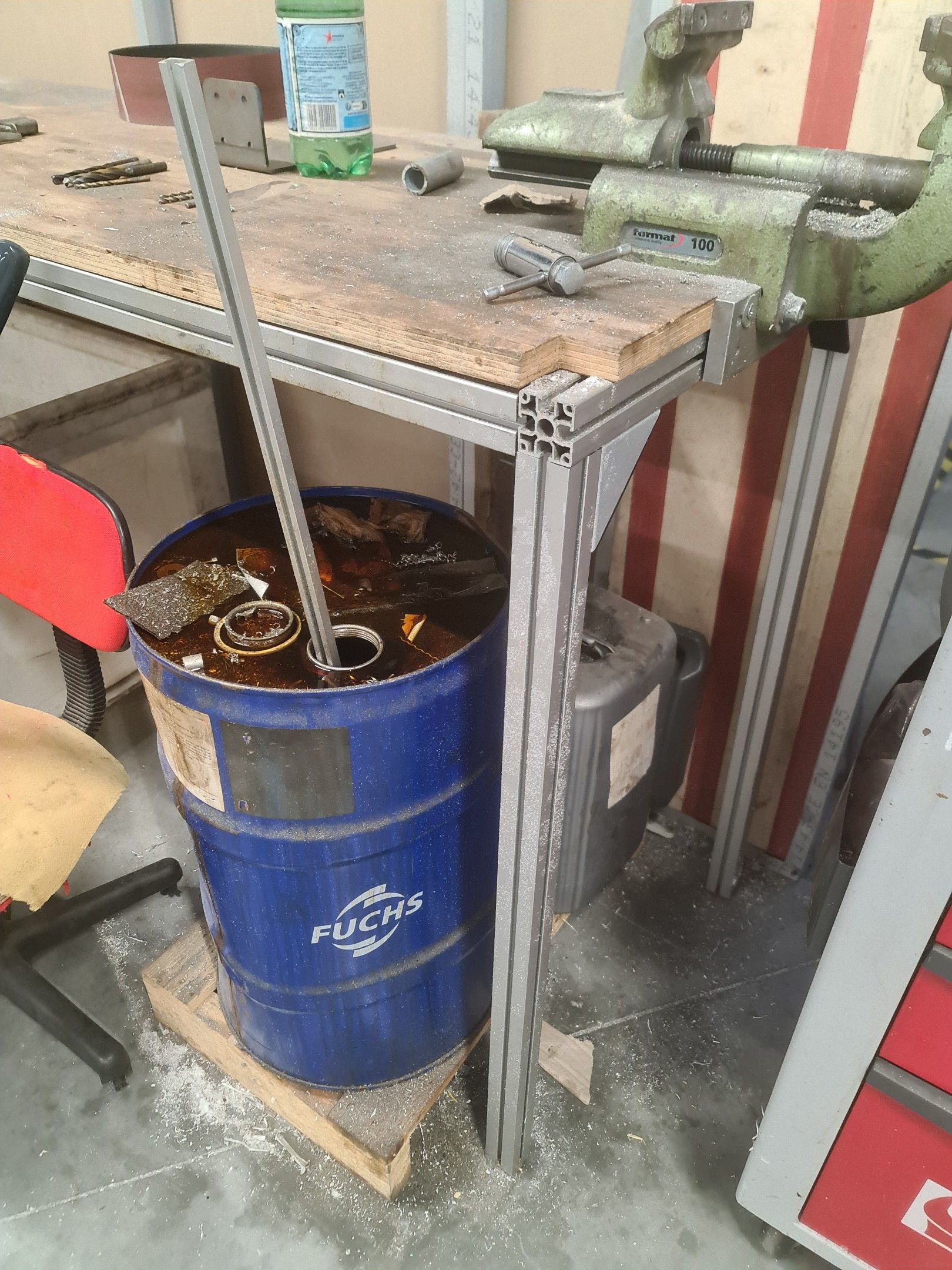 a two-head Optimum grinder with two heads, one circular and the other belt sander, a vice mounted on its workbench, an old stool, a Karcher hoover, a Proline hoover.