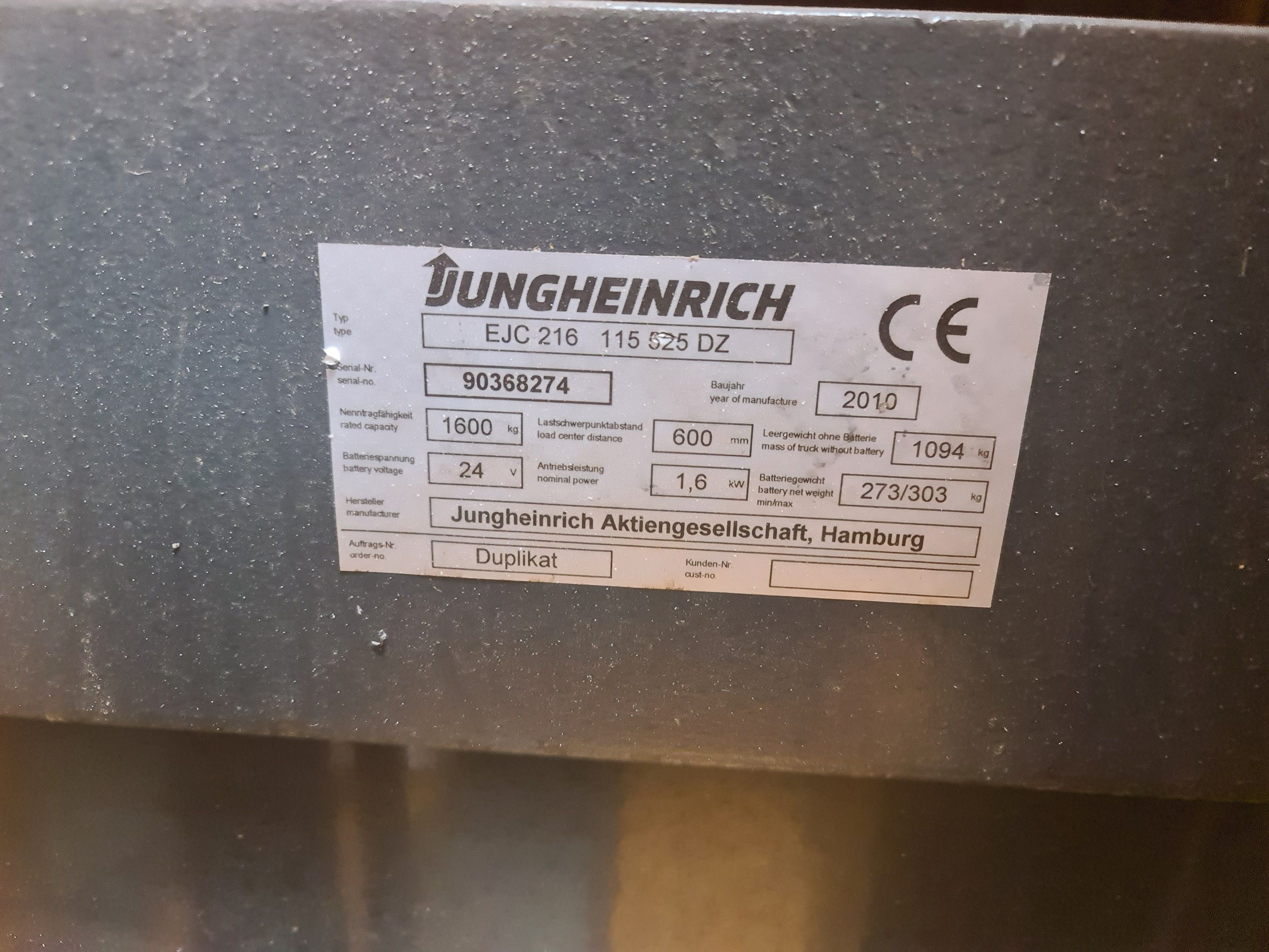 a Jungheinrich electric stacker model EJC 216, year 2010. Counter 1383