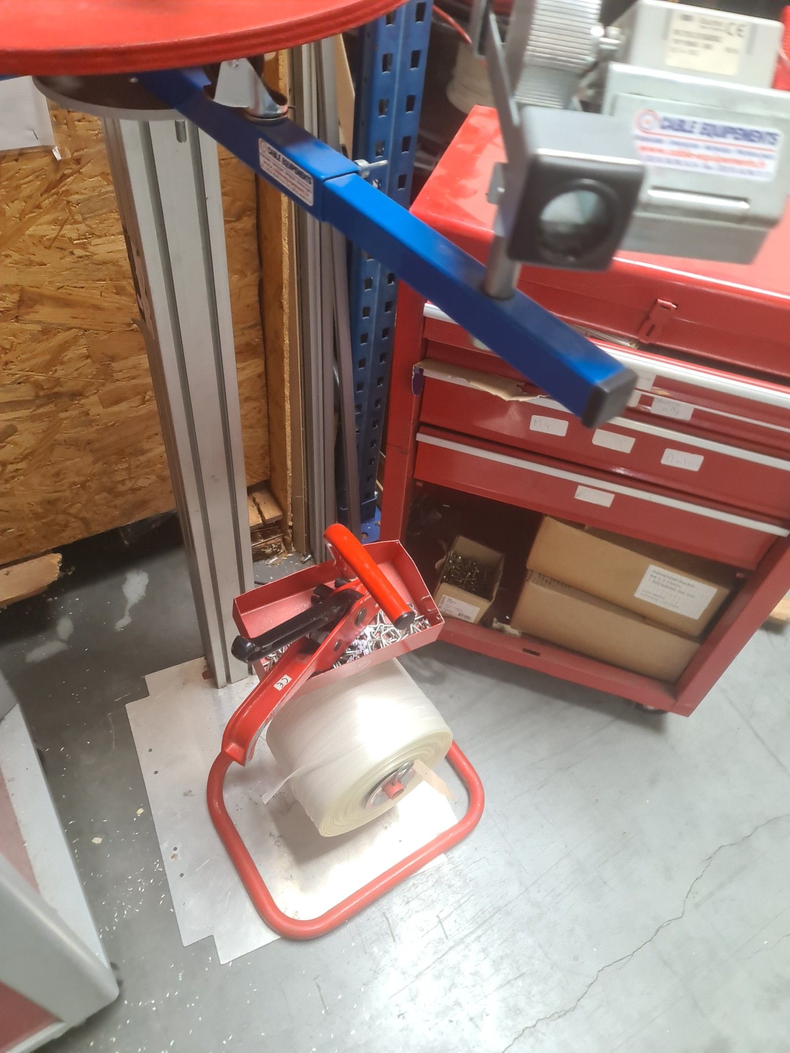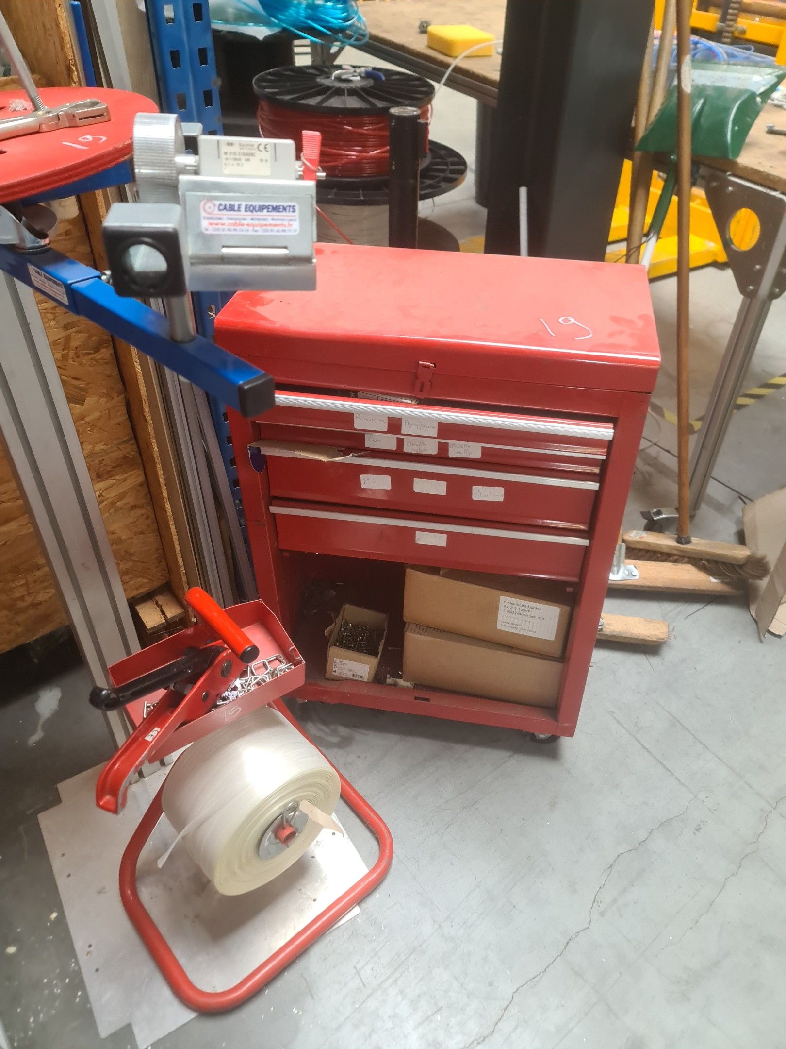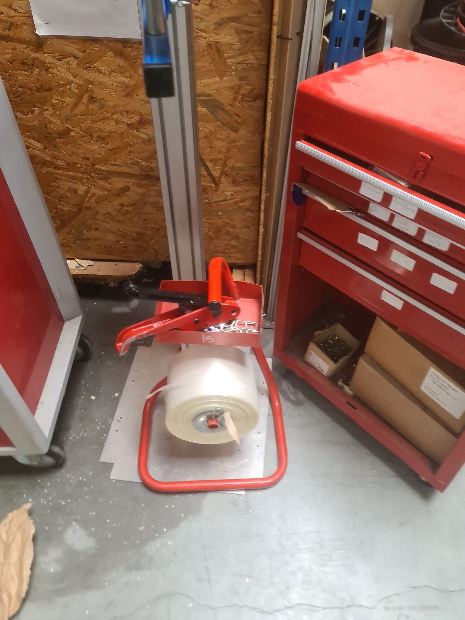 a red metal workshop trolley, a reel, a home-made hose reel and a red metal manual strapping machine