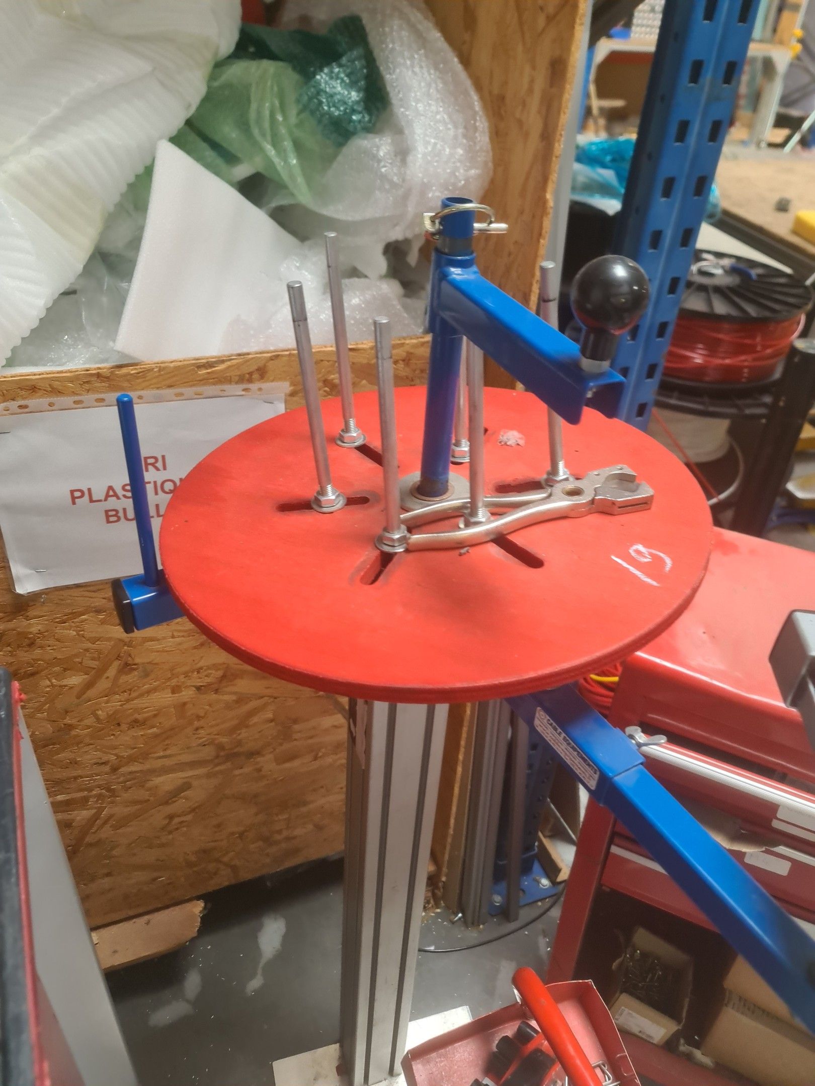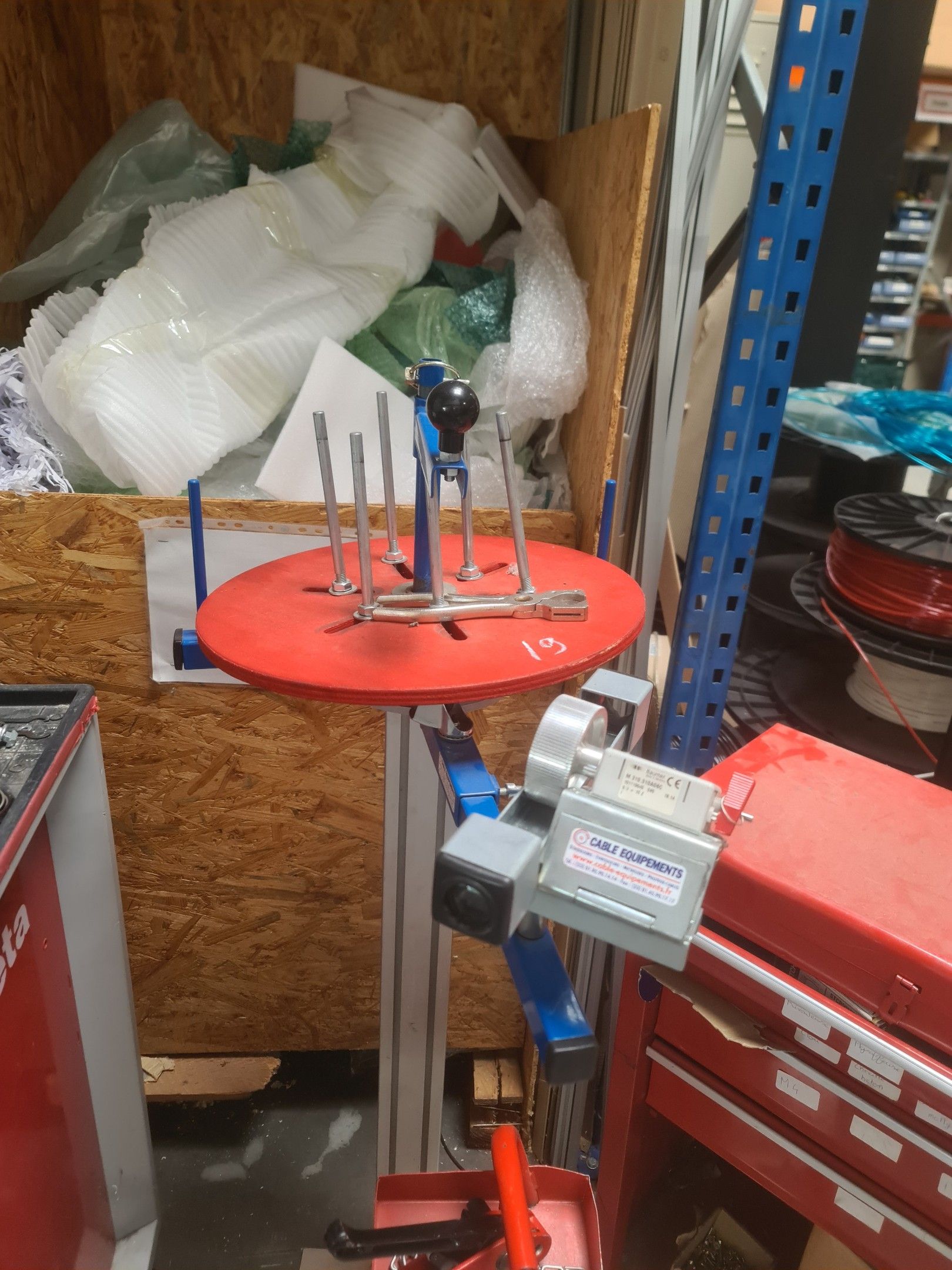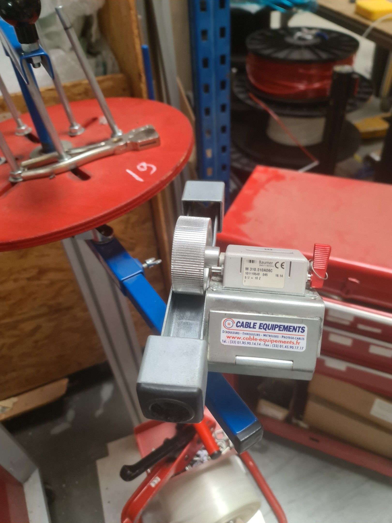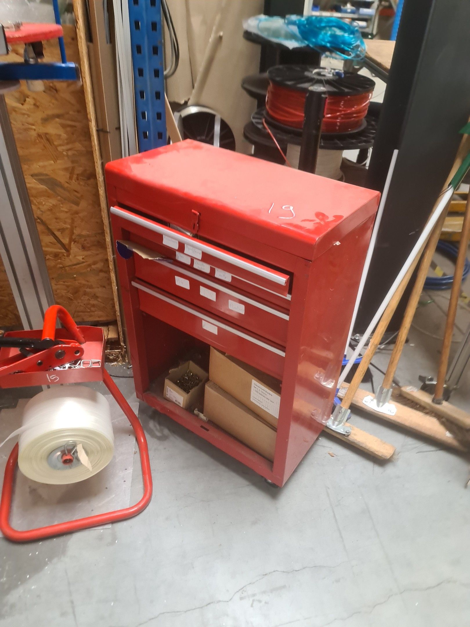 a red metal workshop trolley, a reel, a home-made hose reel and a red metal manual strapping machine
