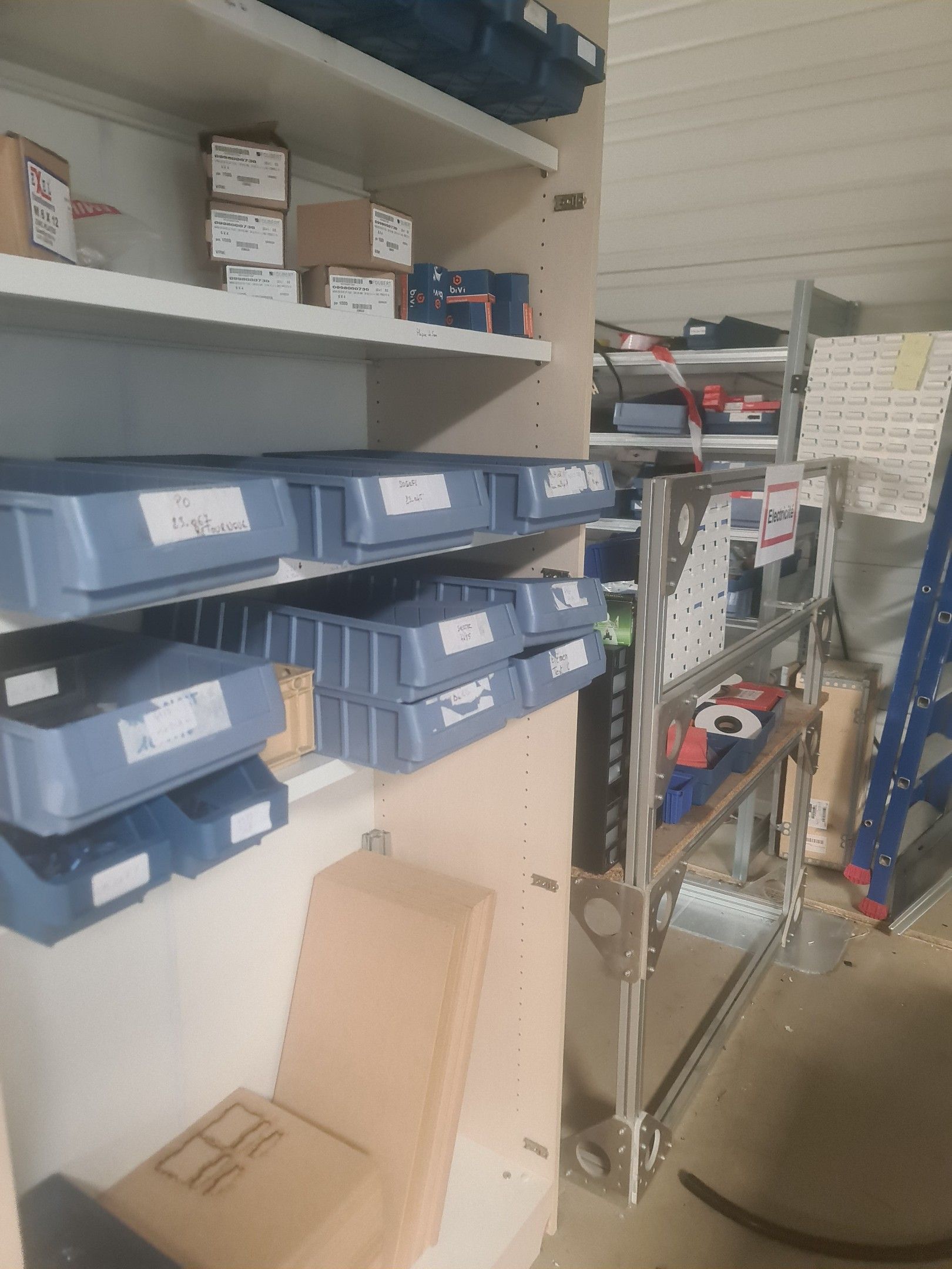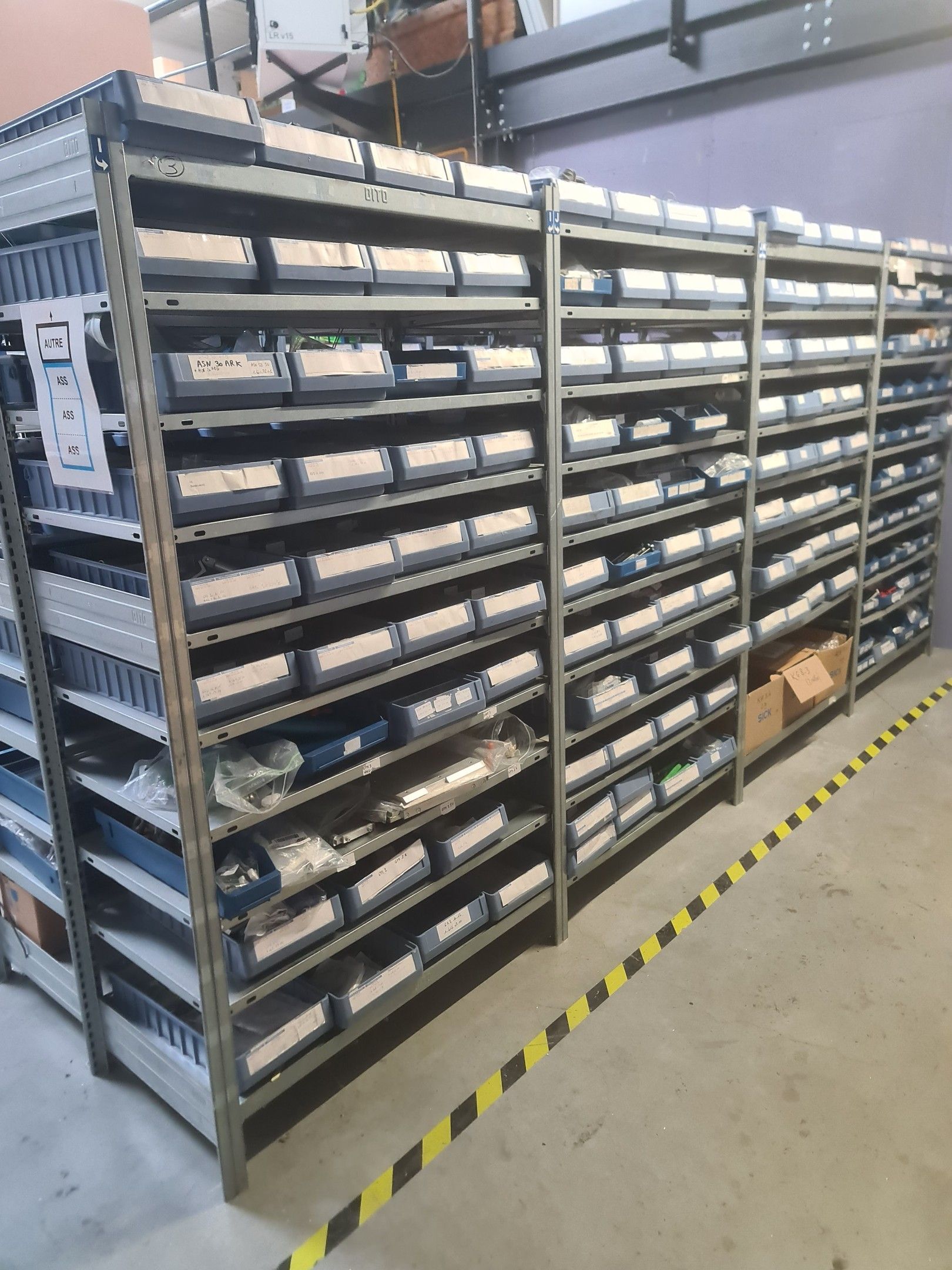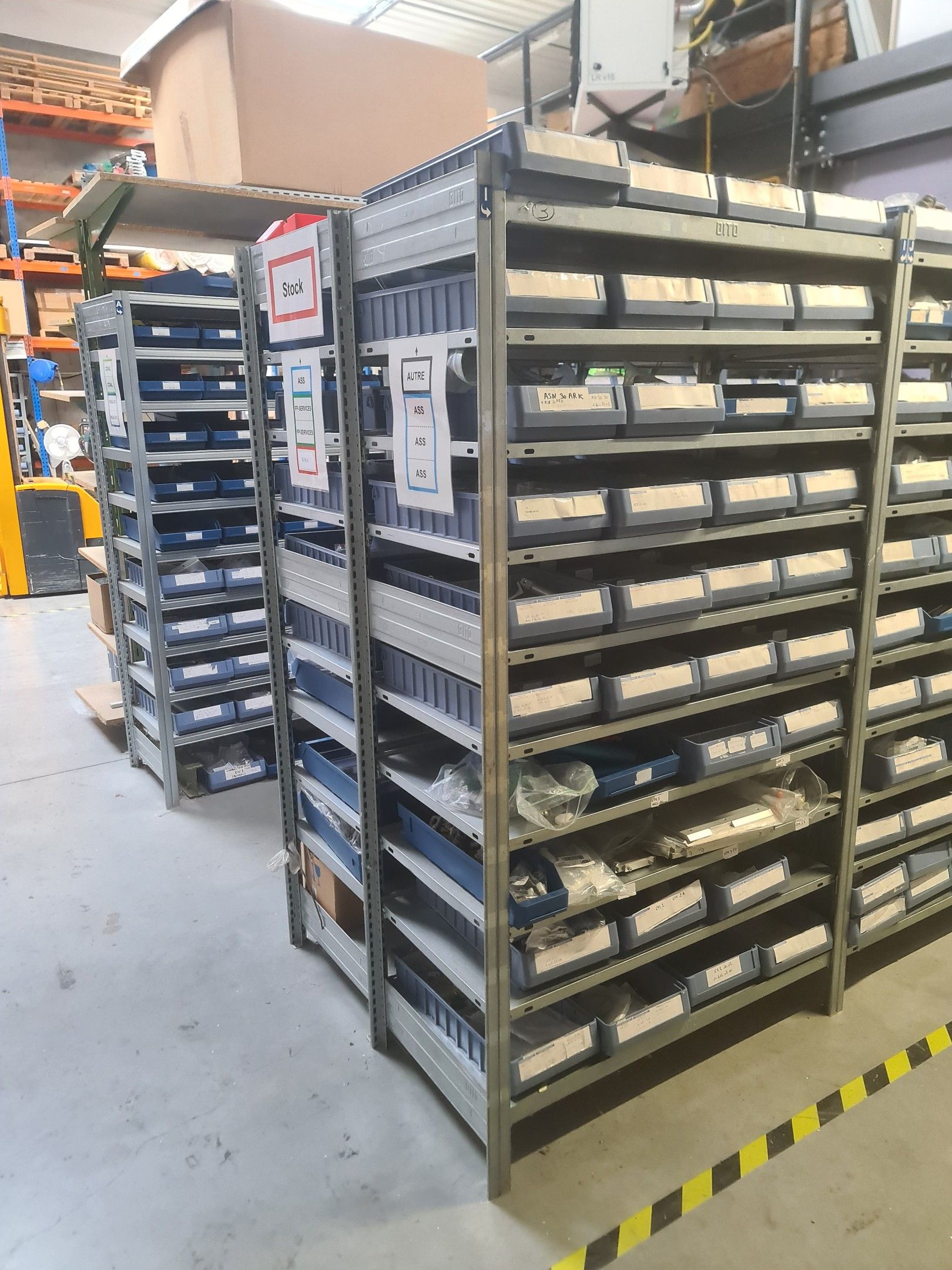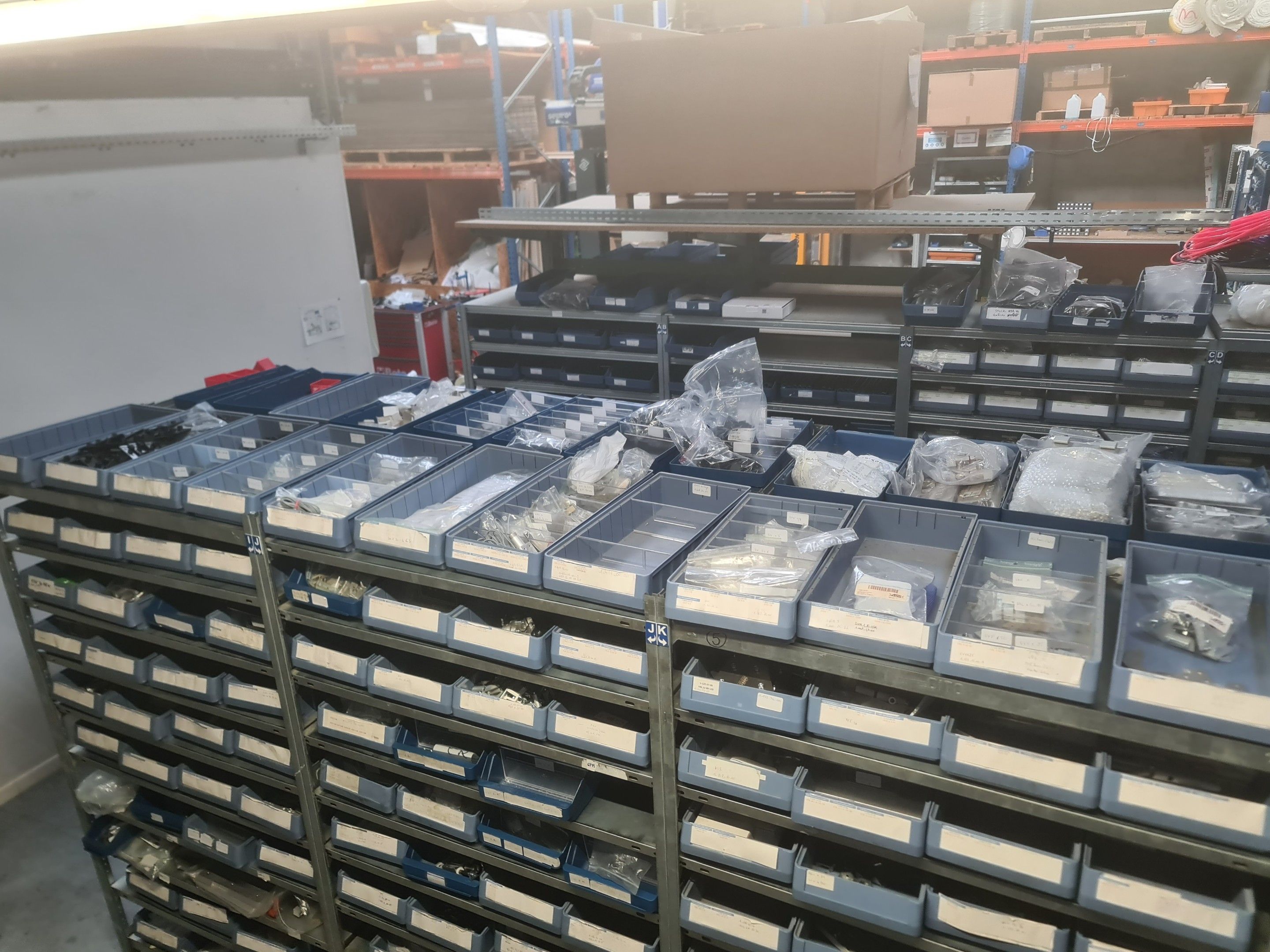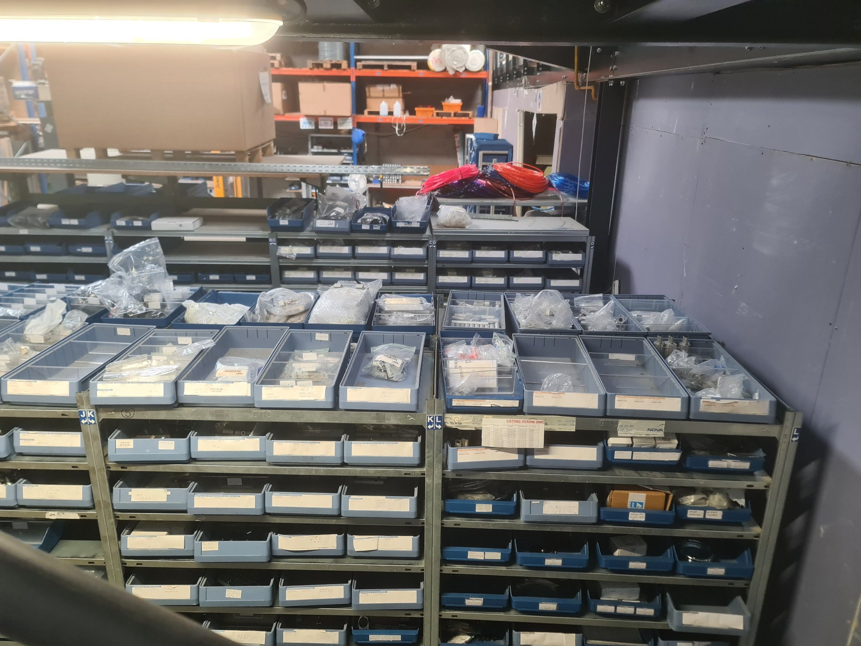 stock of mechanical spare parts, detectors, raw materials, consumables and hardware, mainly of the COVAL, ASS and SIEC brands, in bins