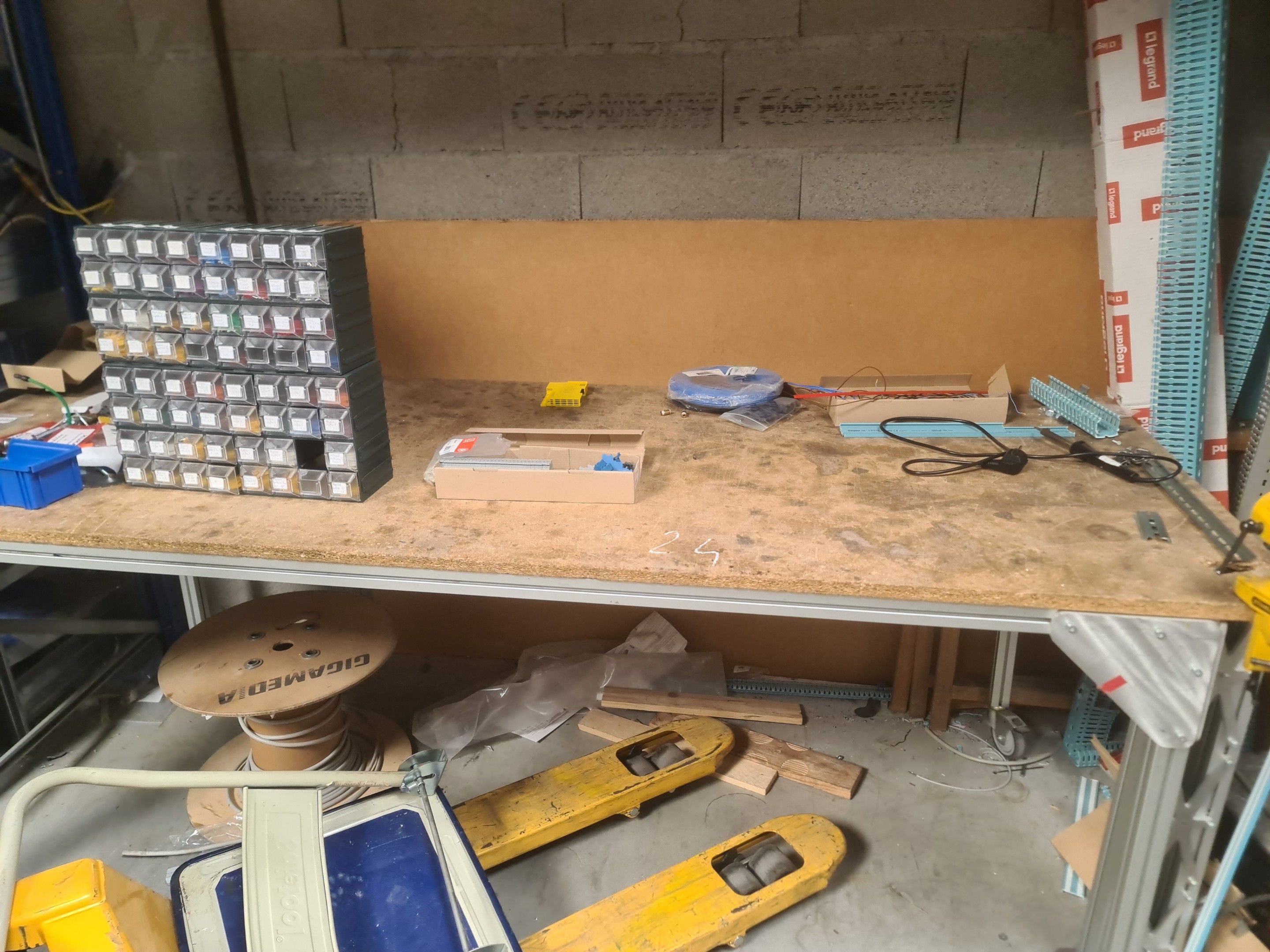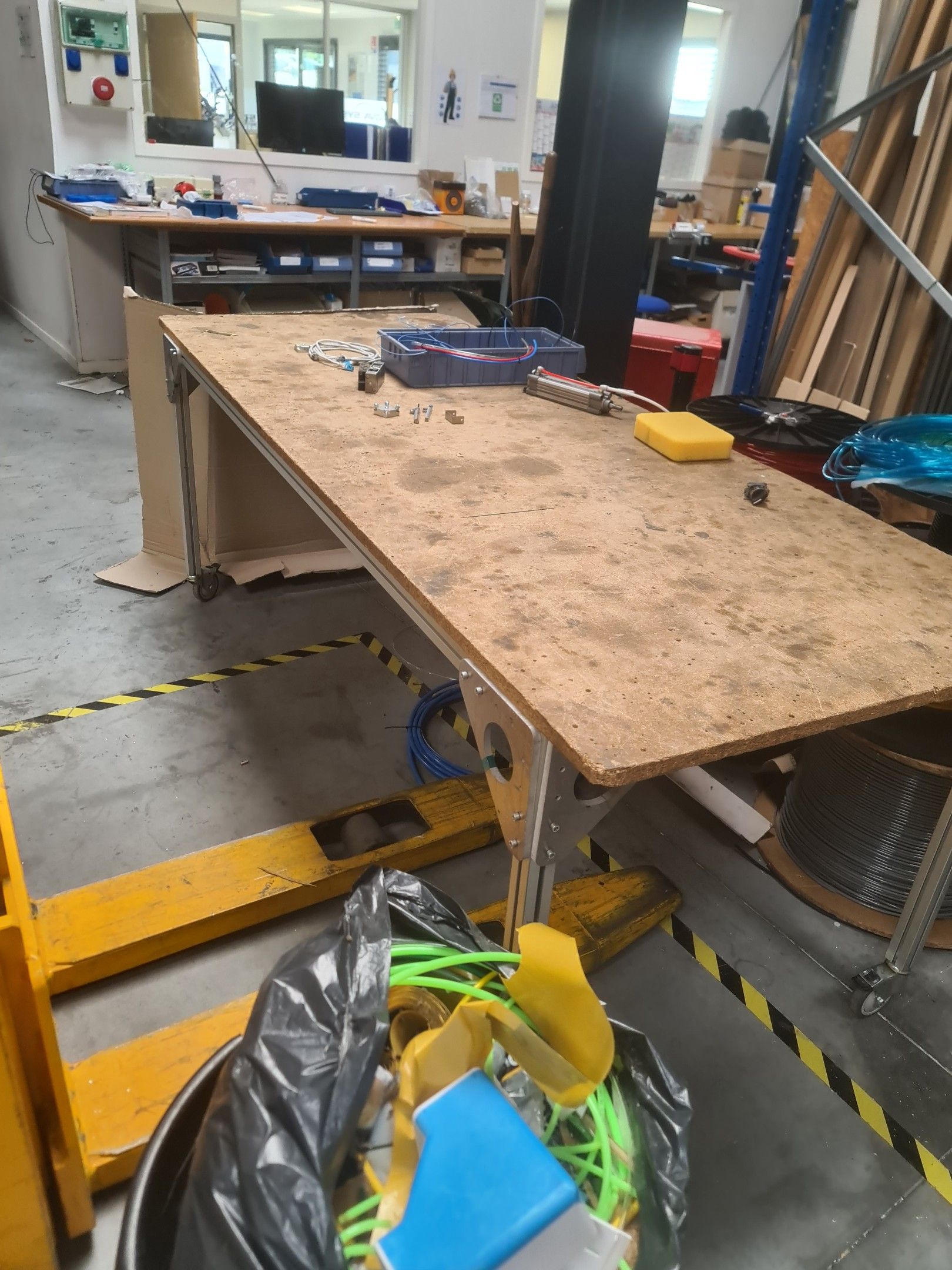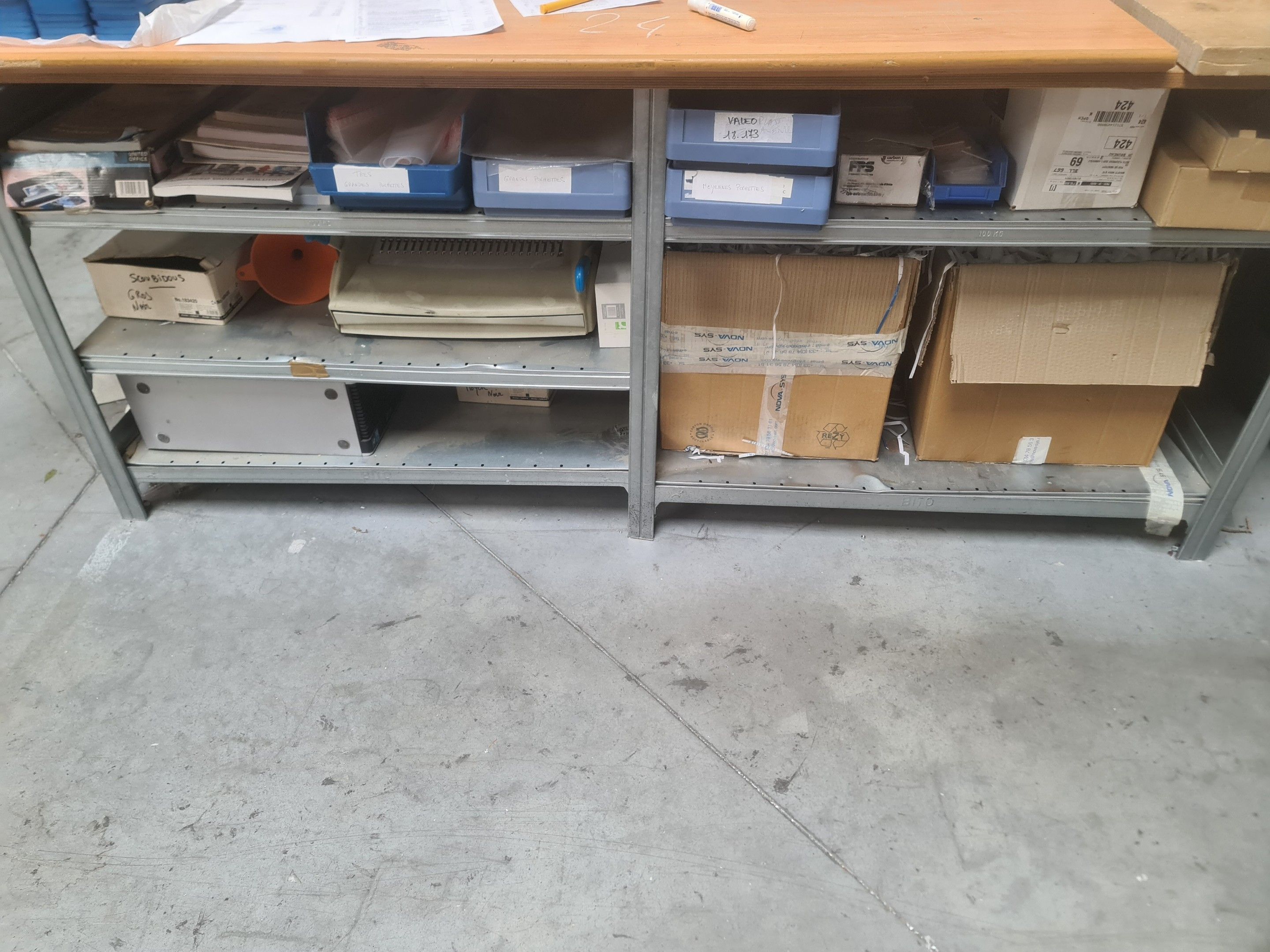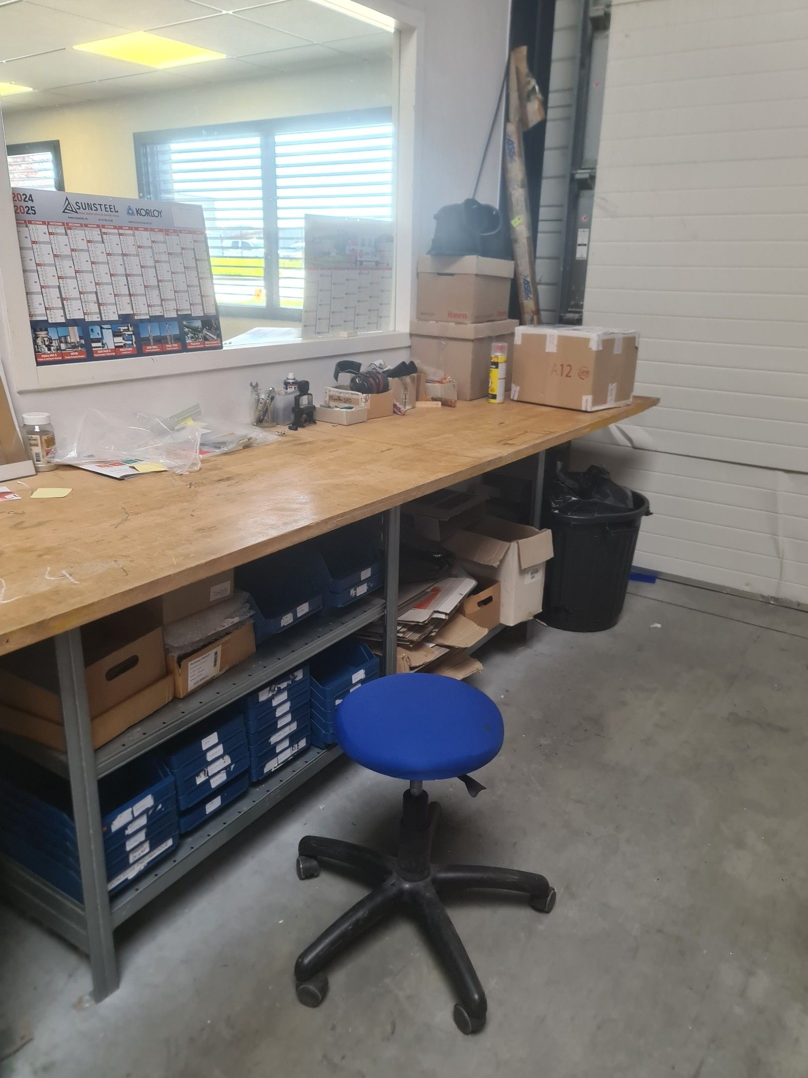 a laminate, wood and metal workbench (approx. 6 linear metres), a bookbinder, an old HP Z400 central processing unit, keyboard, mouse and connectors, a mobile stool with a circular blue fabric top