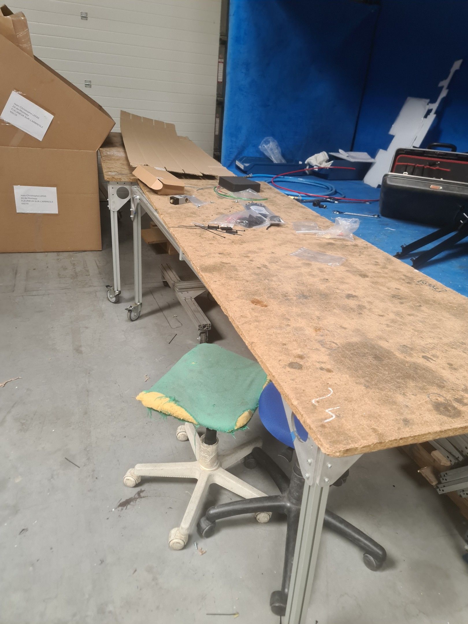 4 mobile workbenches with melamine tops and aluminium legs, a blue circular fabric stool, an old green fabric mobile stool