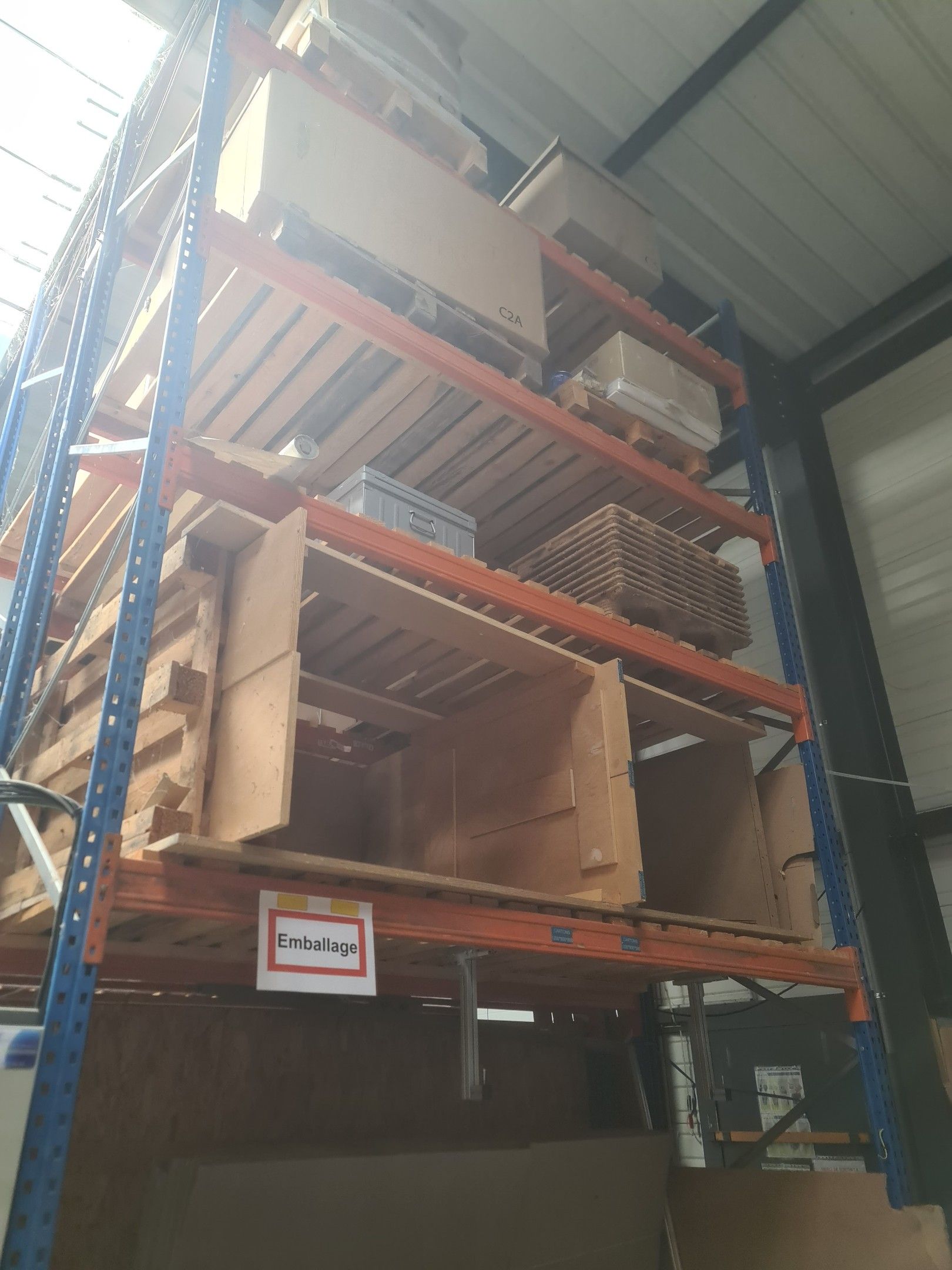 large red and orange metal carrier rack, approximately 6 linear metres and 6 metres high, compressed air dispenser