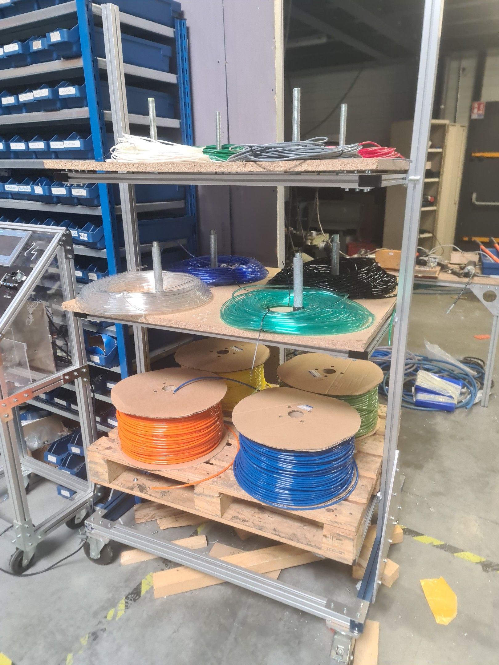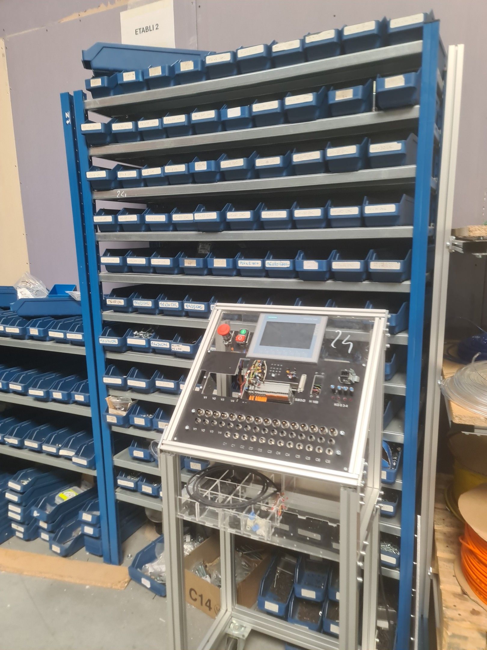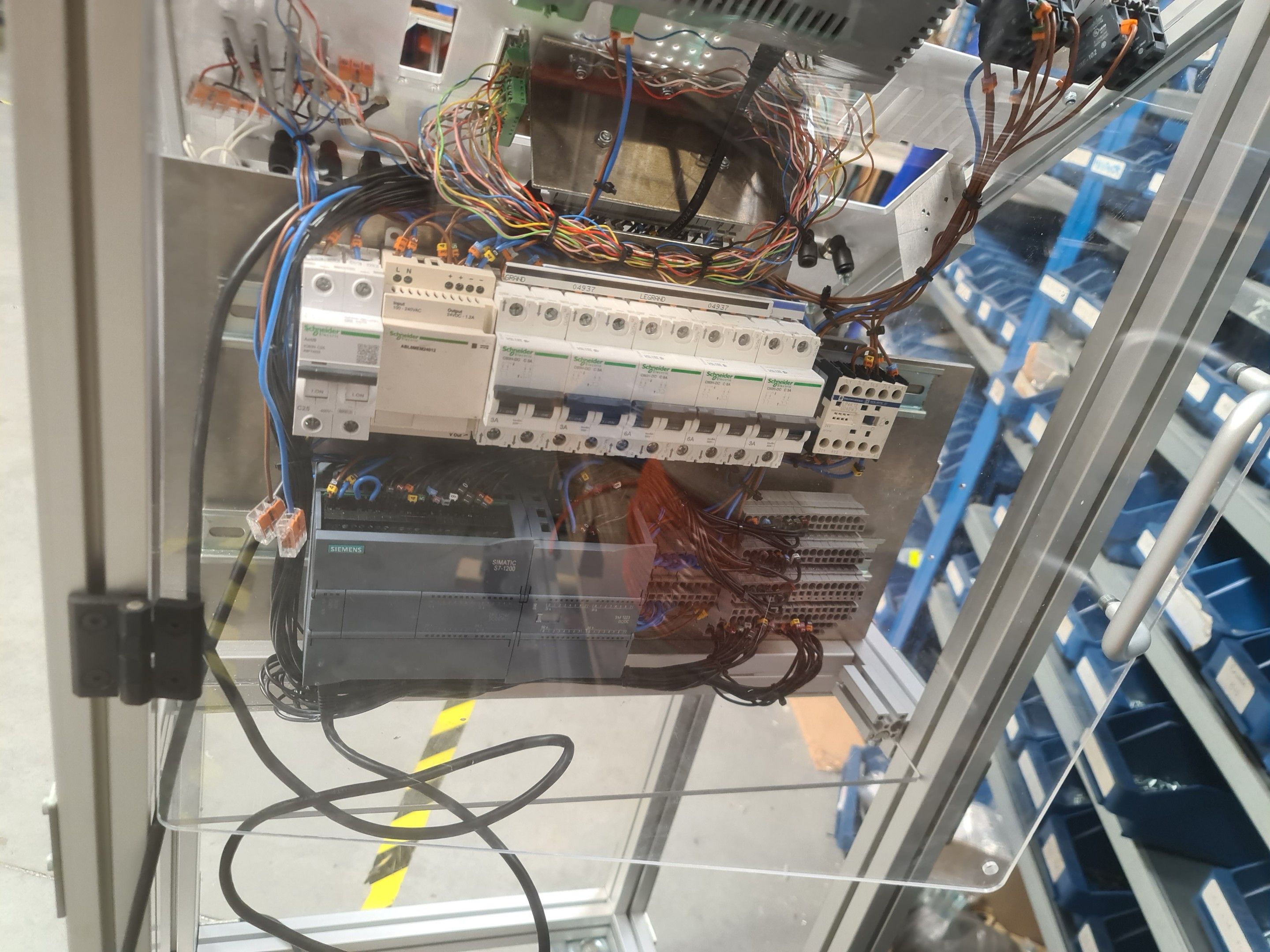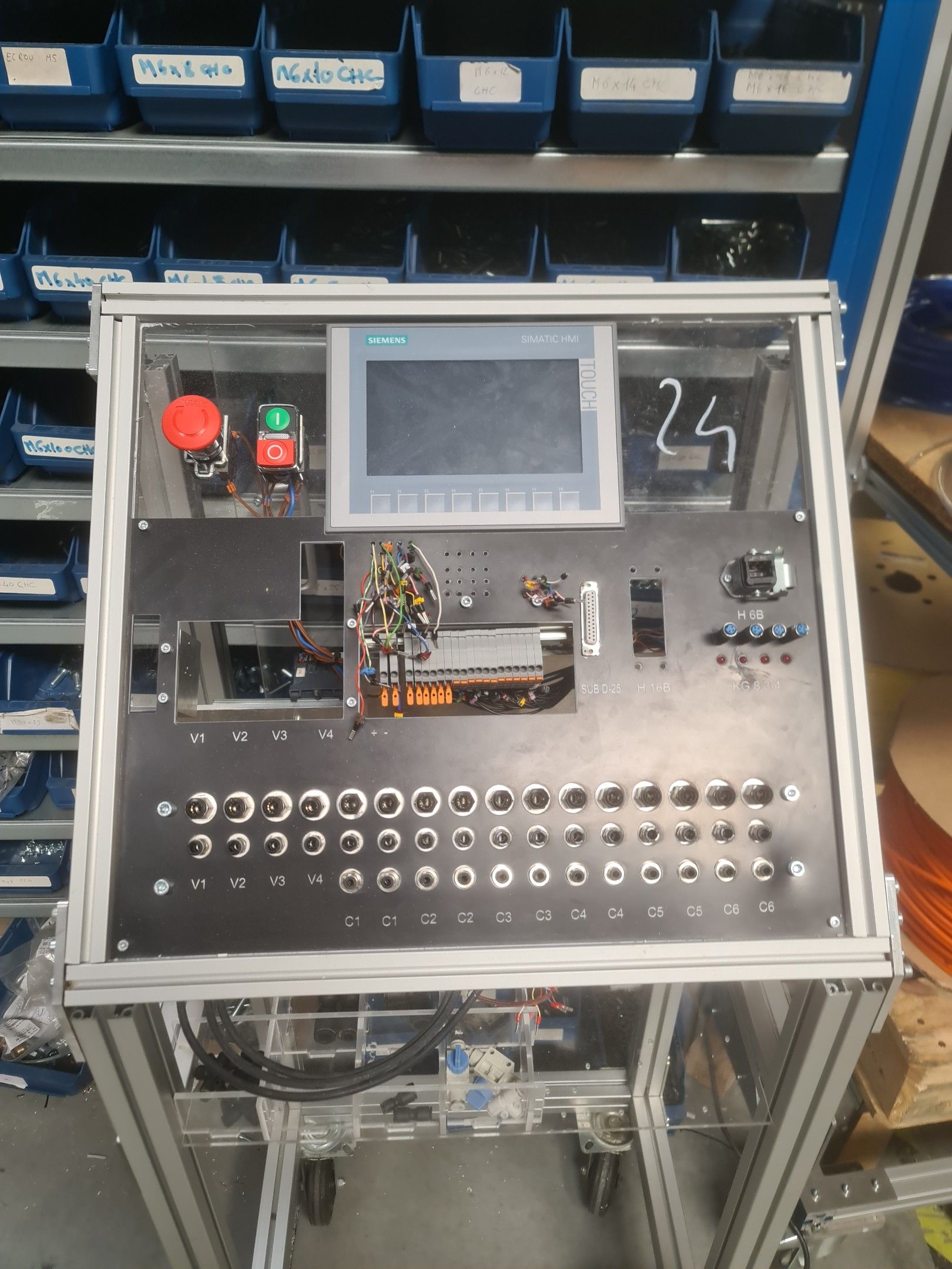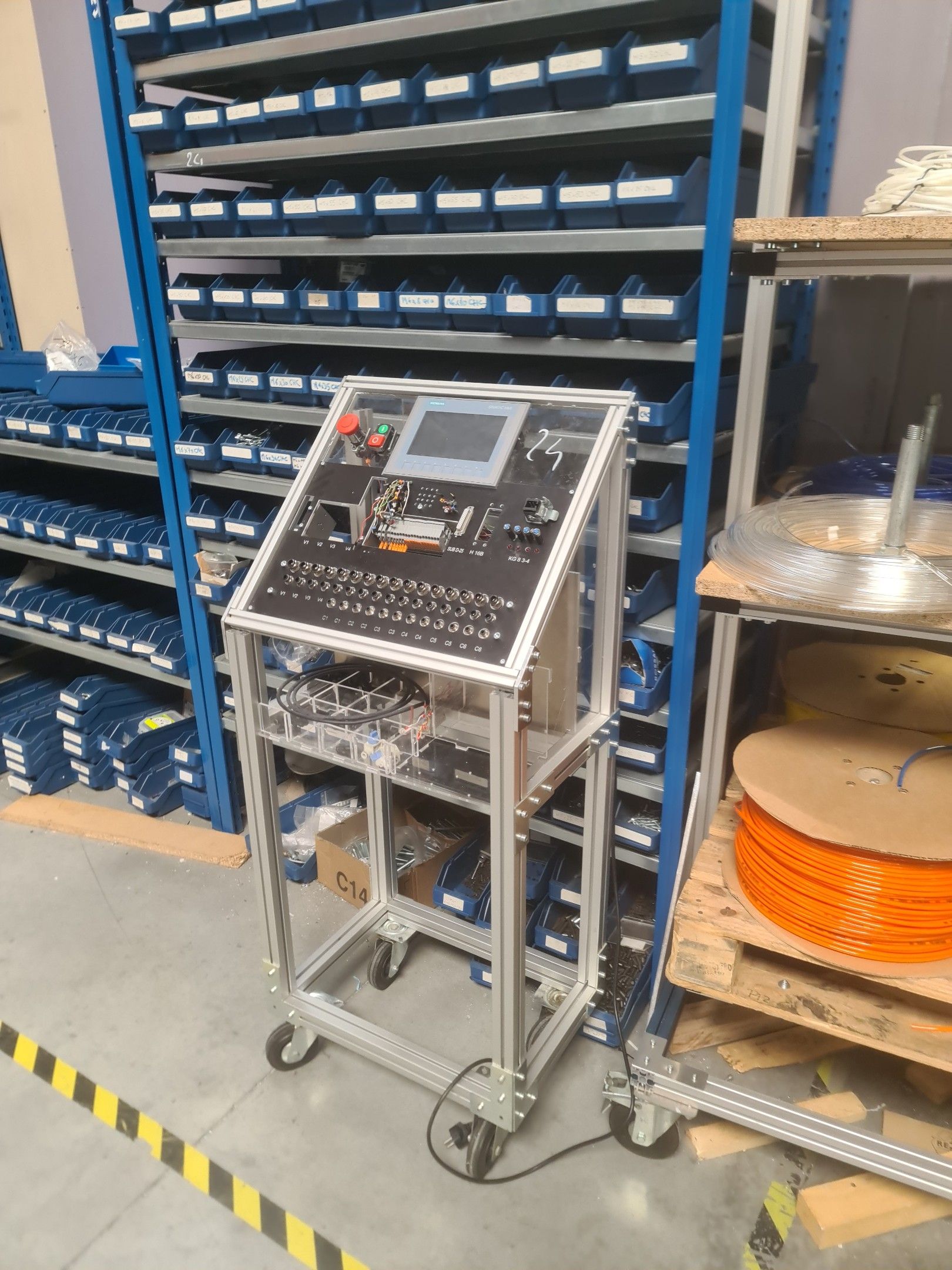 a homemade mobile test desk comprising Schneider circuit breakers, Siemens Simatic S7-1200 box, Siemens Simatic HMI Touch control screen, various connectors