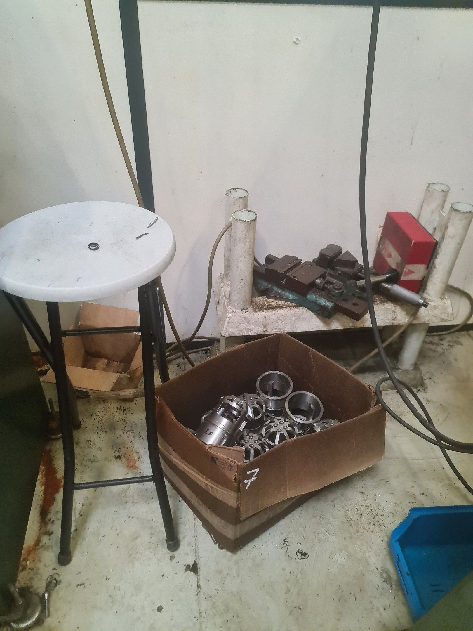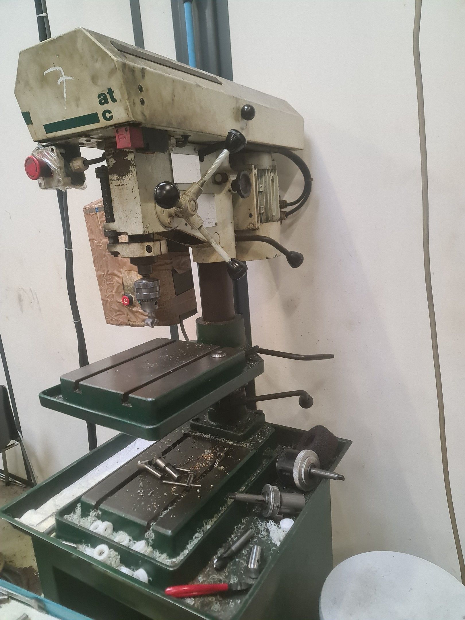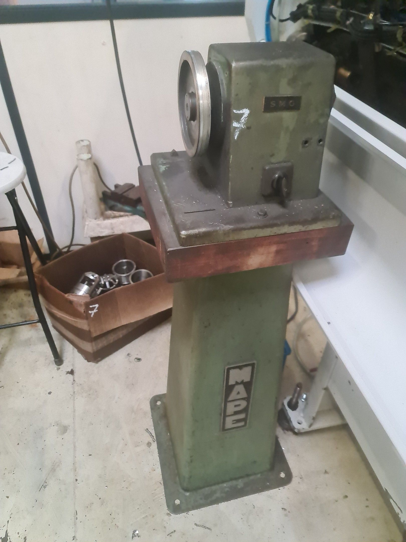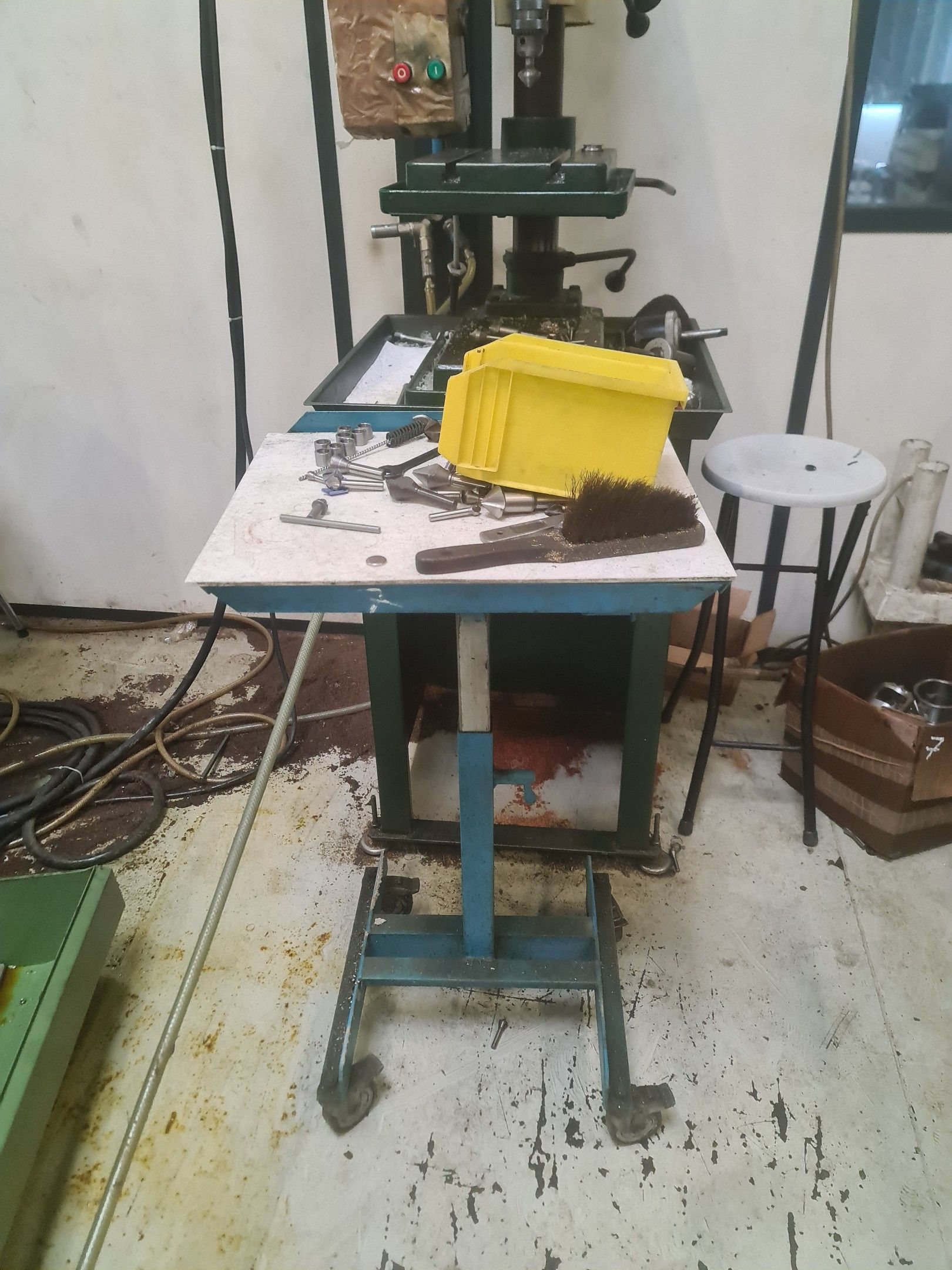a bench drill, a MAPE lathe, a blue metal mobile desk, 2 vices, a stool and various metal parts