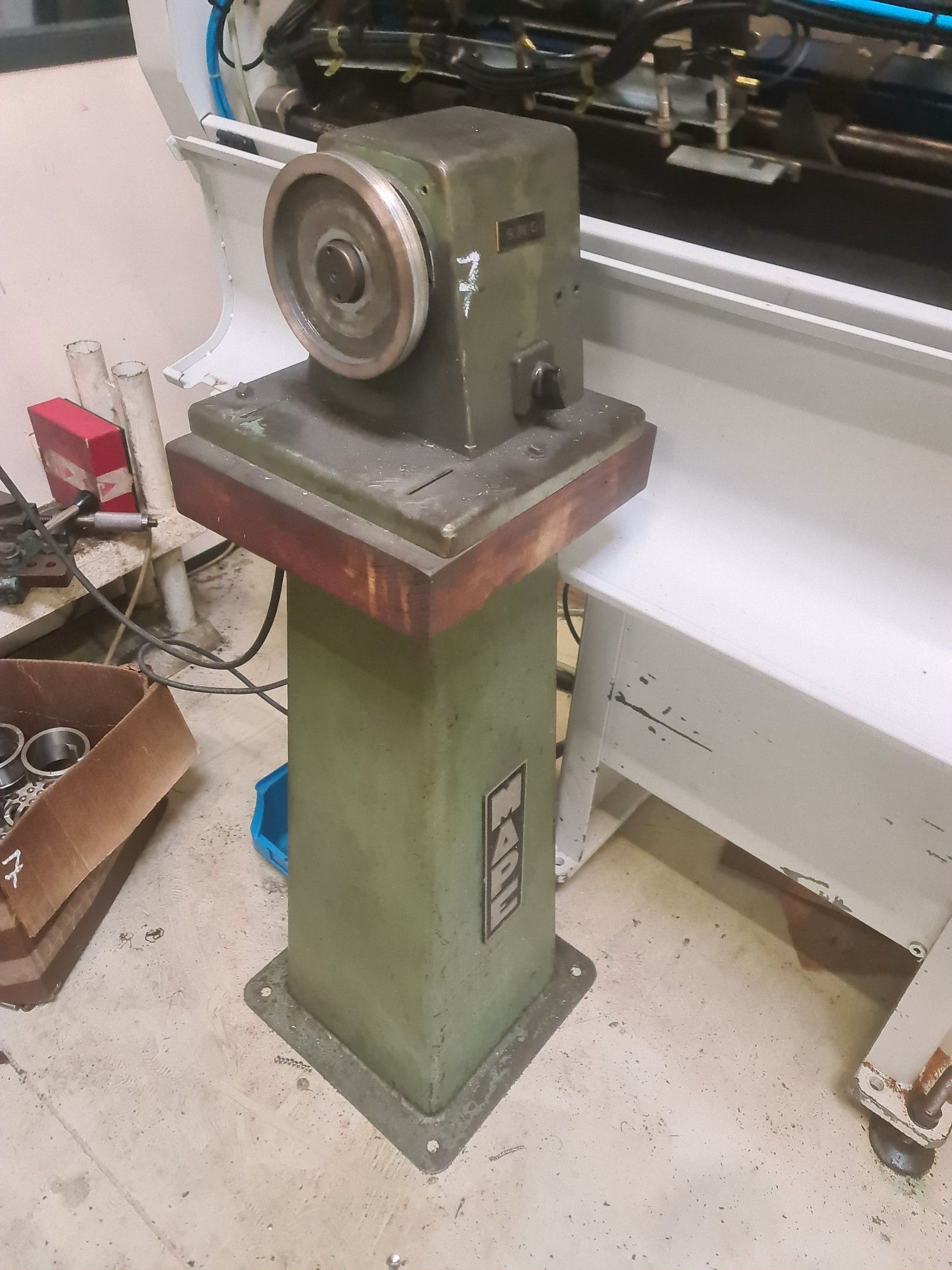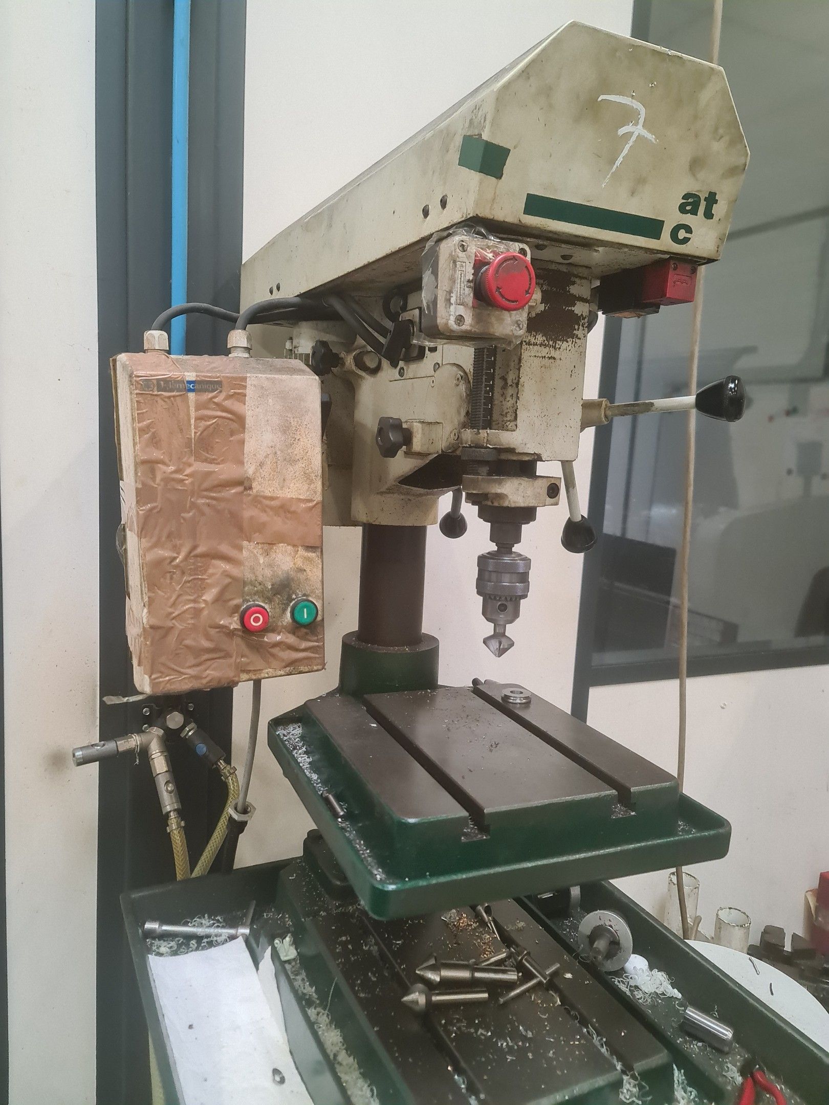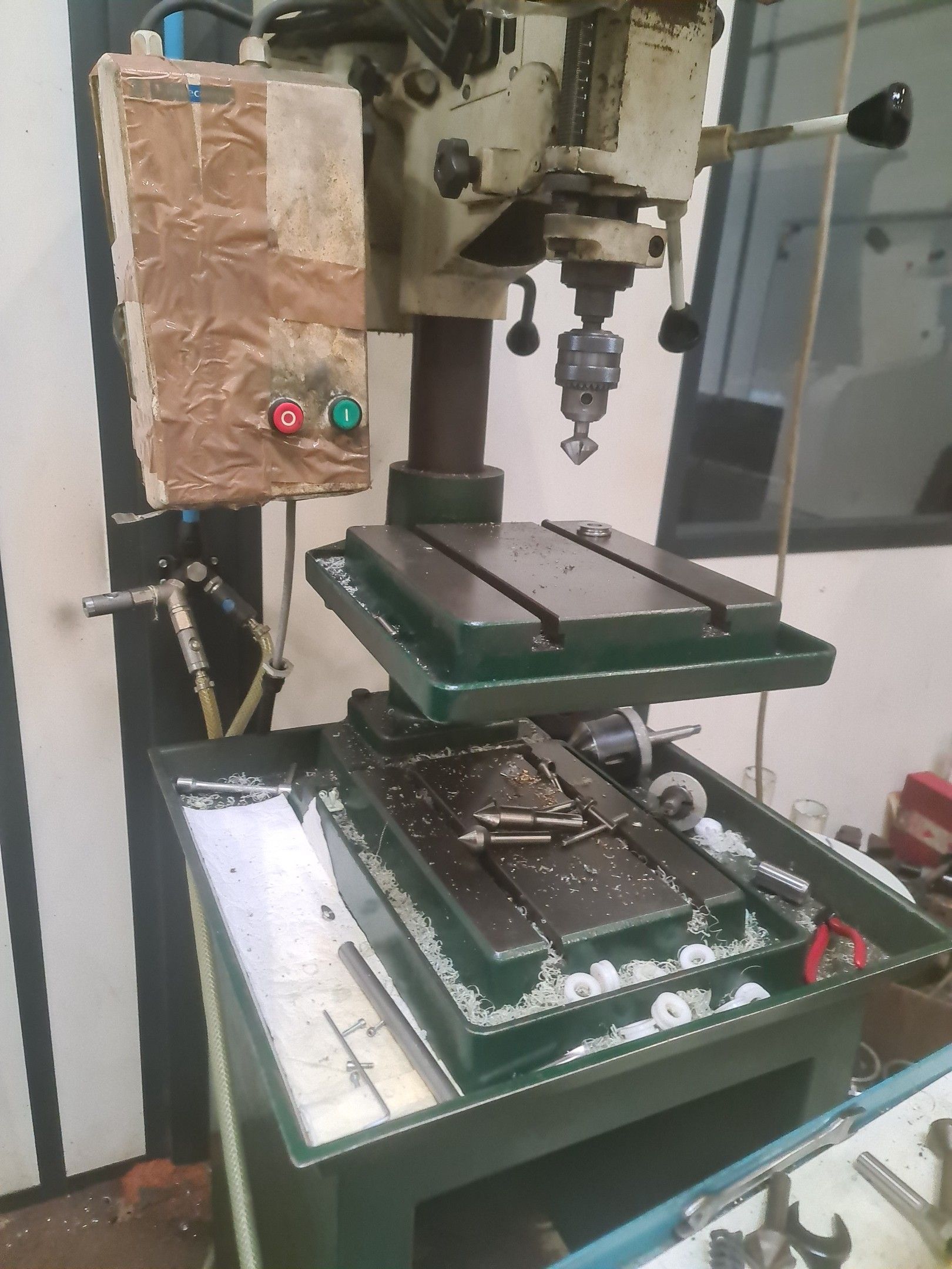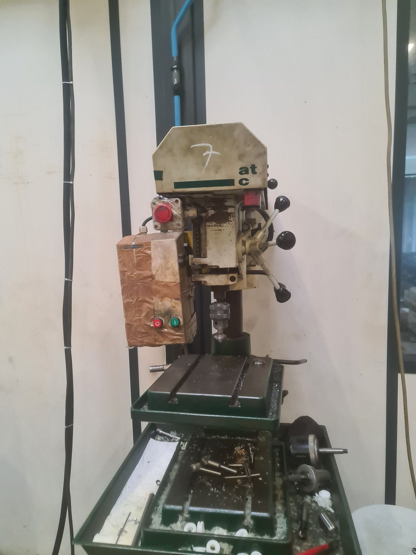 a bench drill, a MAPE lathe, a blue metal mobile desk, 2 vices, a stool and various metal parts