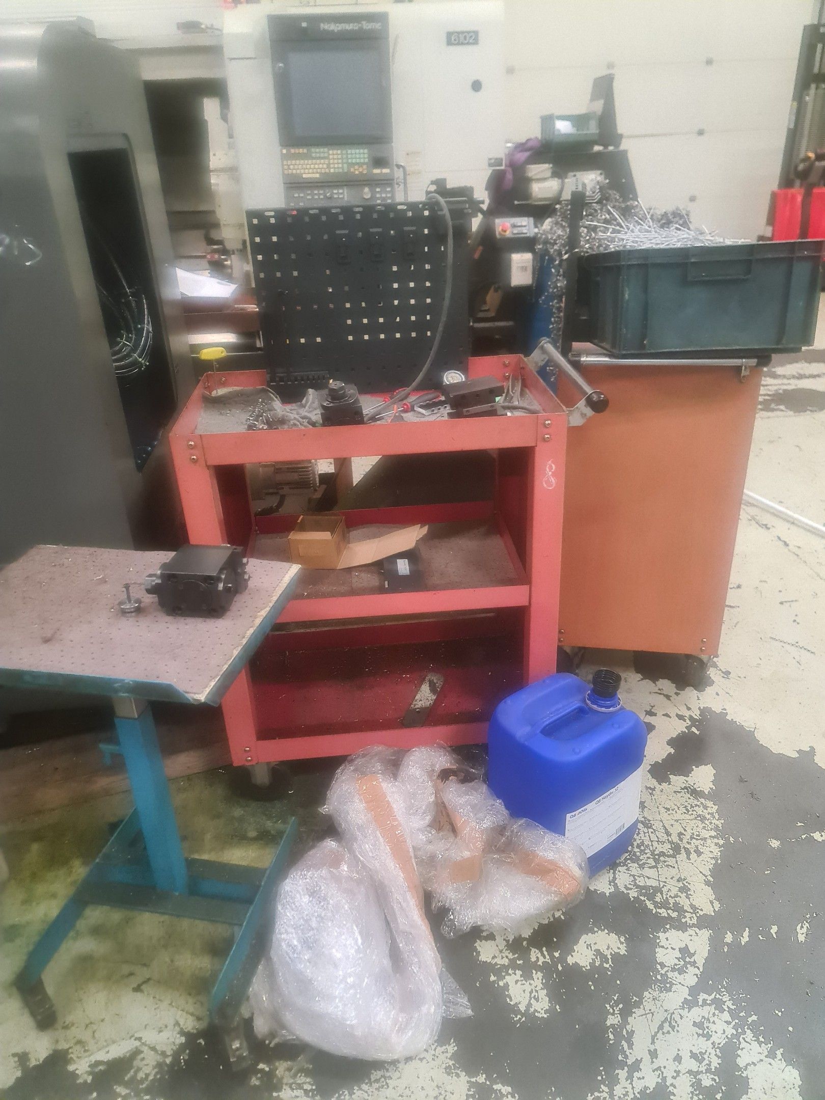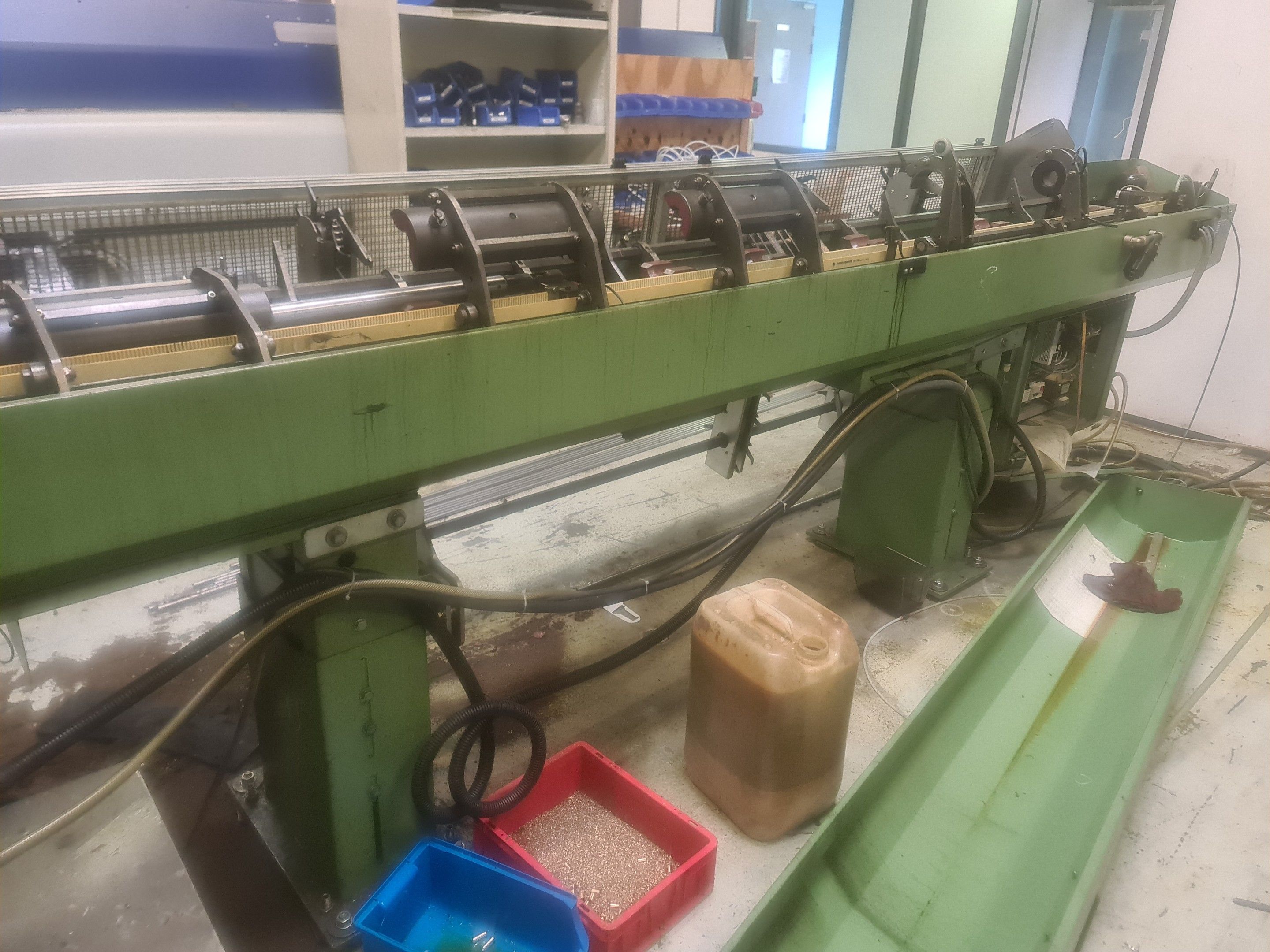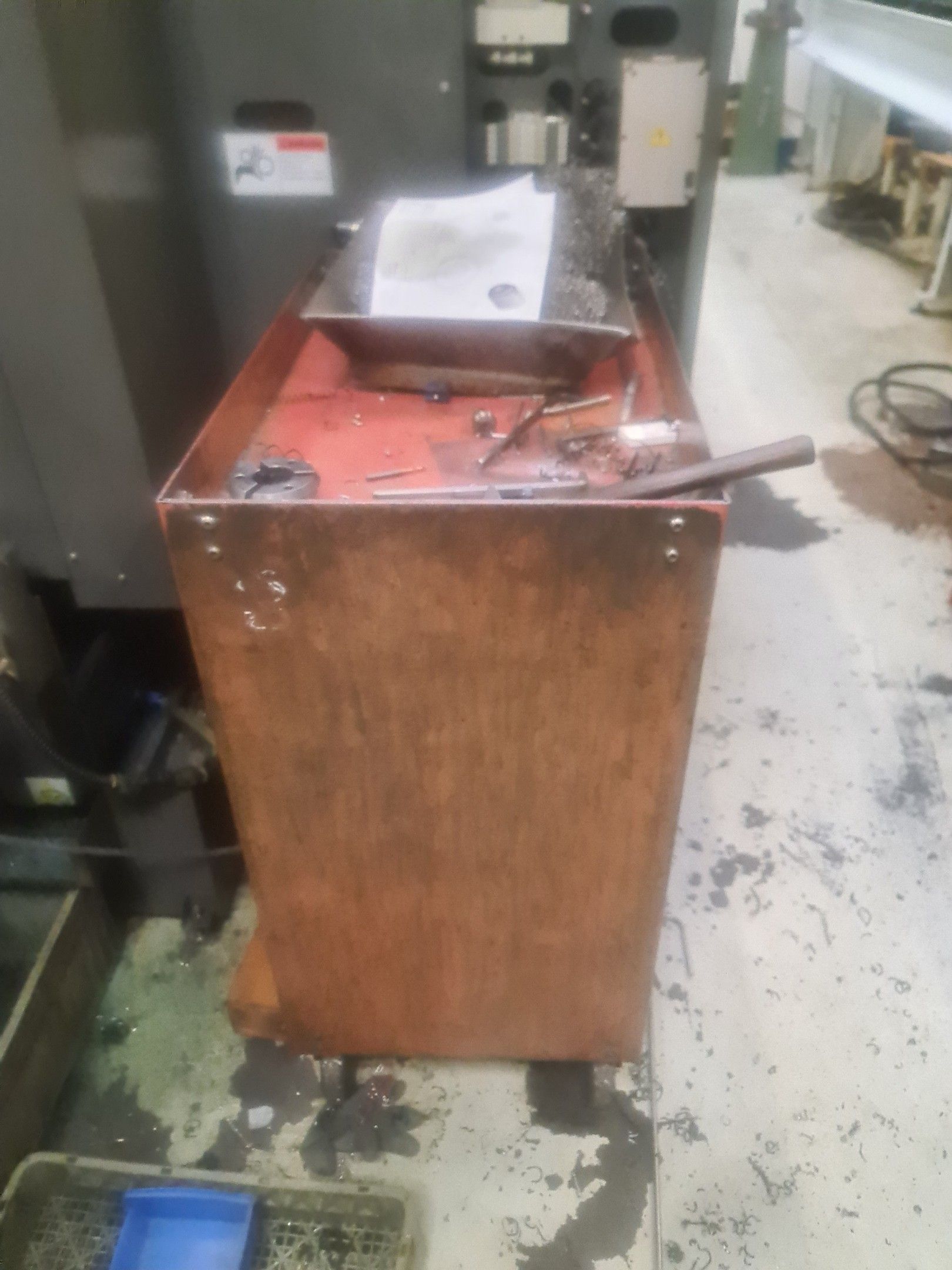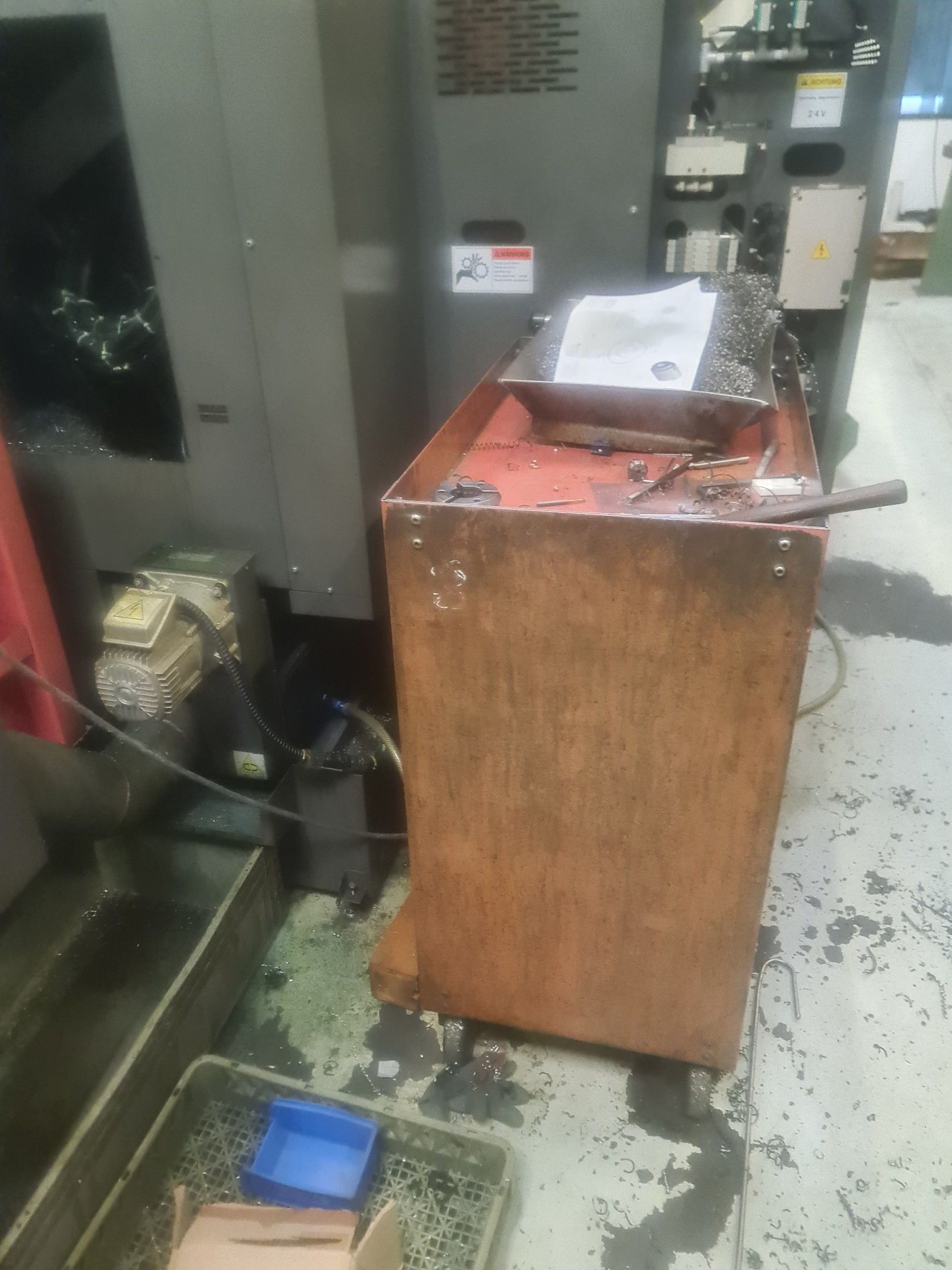 3 red metal sideboards, a blue metal console and an LNS bar feeder model SPRINT 552-265