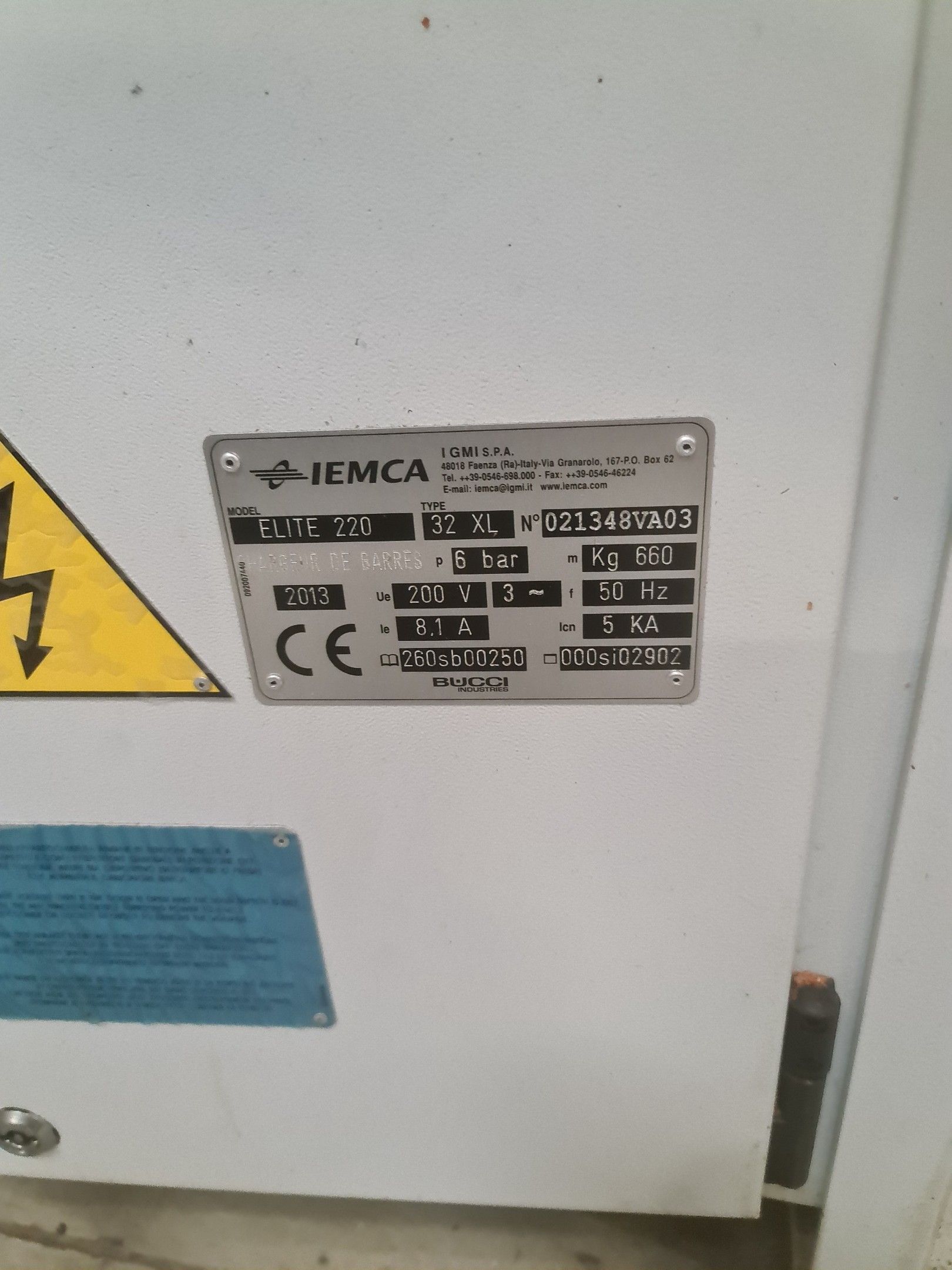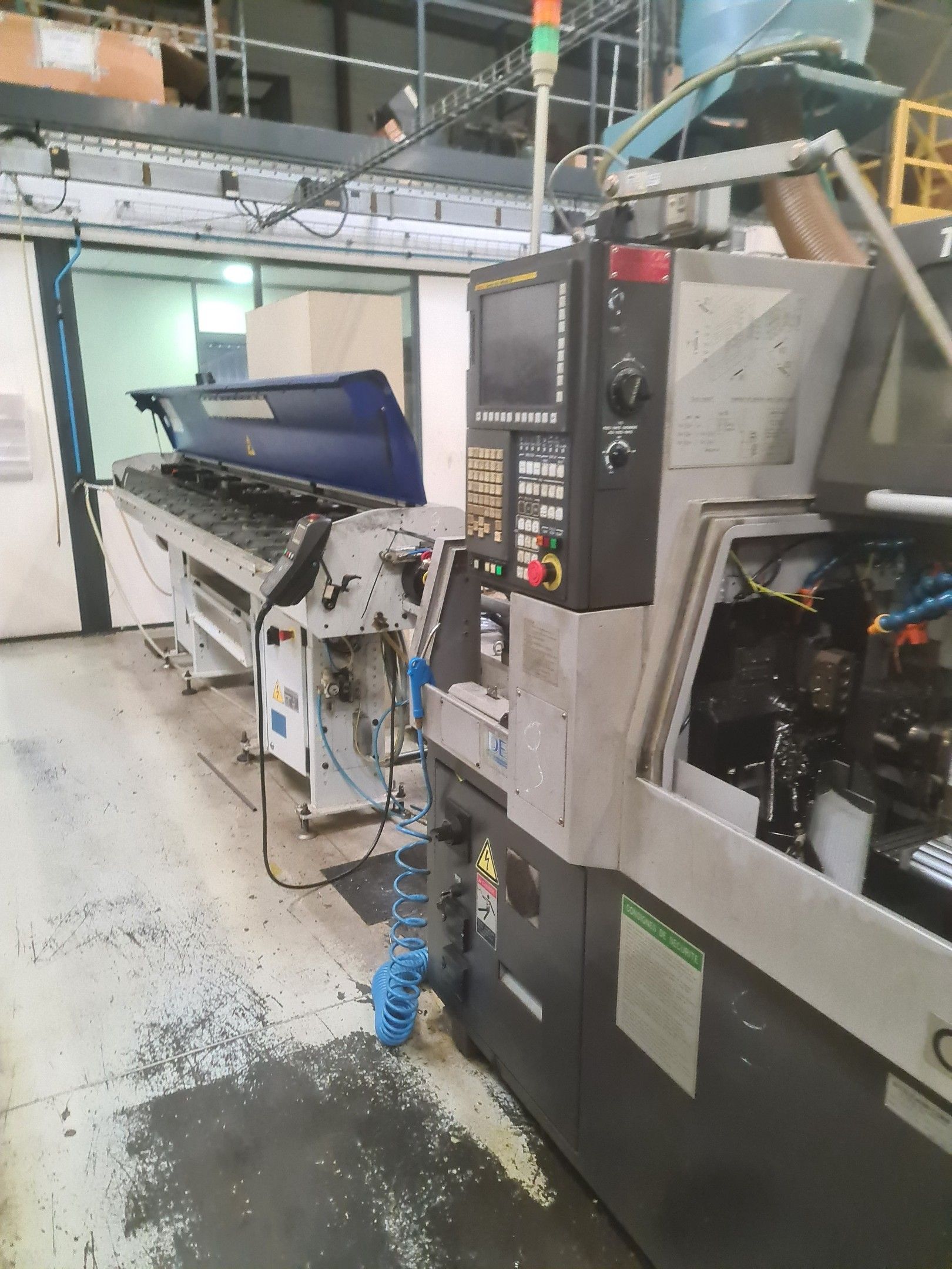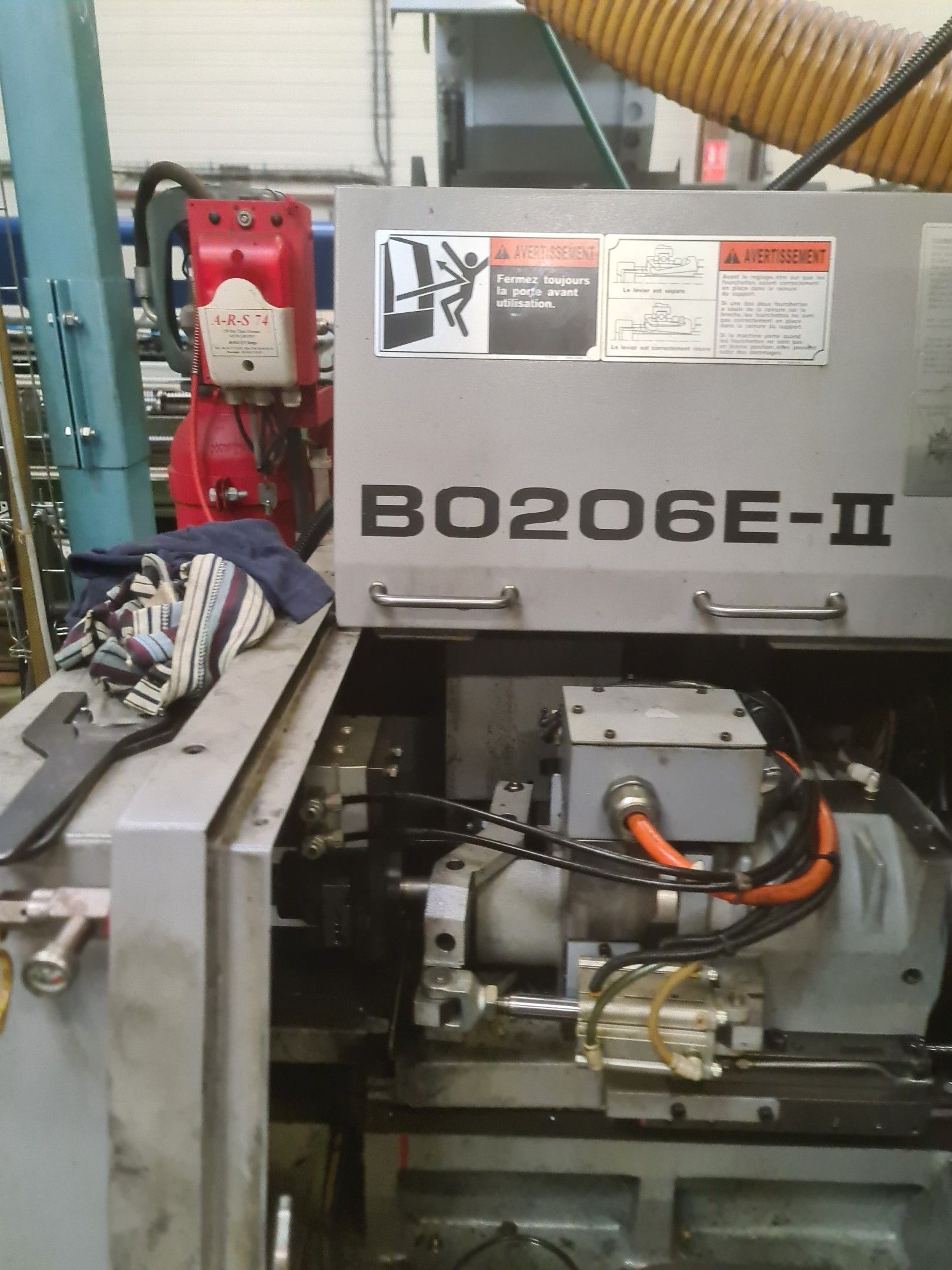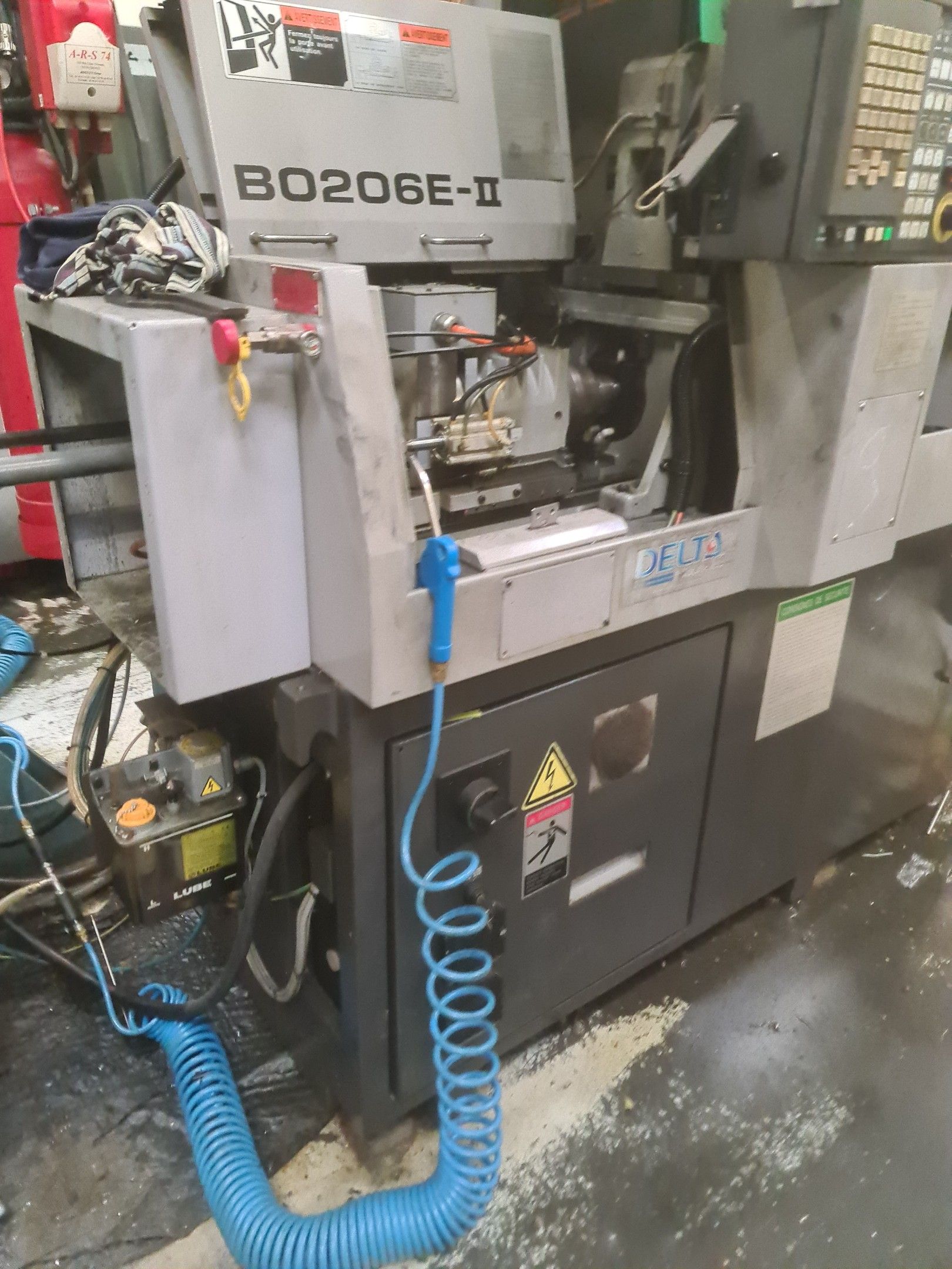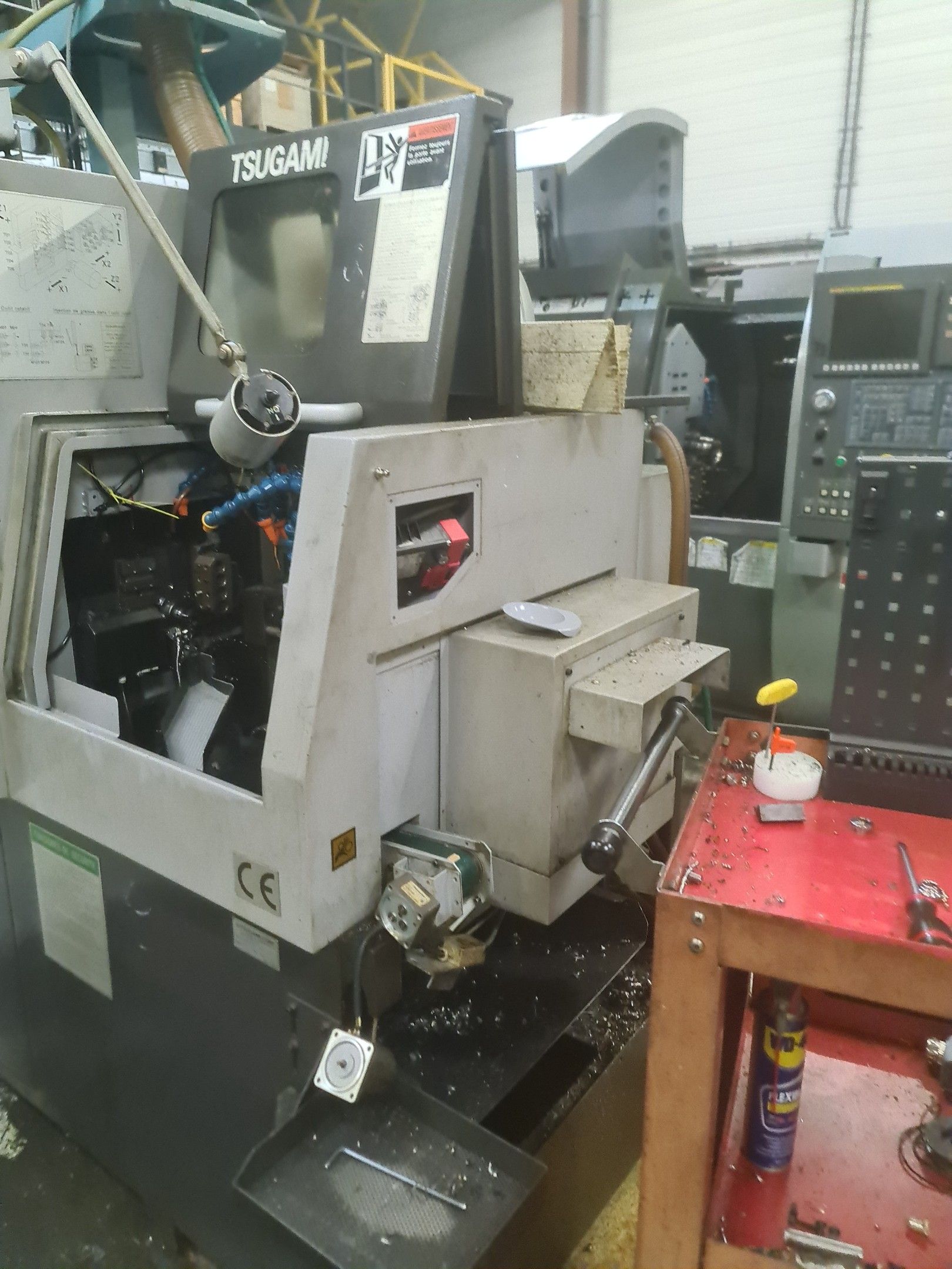 a TSUGAMI machining centre model BO206E-II, year 2014 with Fanuc Series 32i numerical control, model B, a suction system, a 2013 IEMCA Elite 220 bar feeder, a red metal sideboard, a metal cupboard, spout trays, tubes and metal parts.
