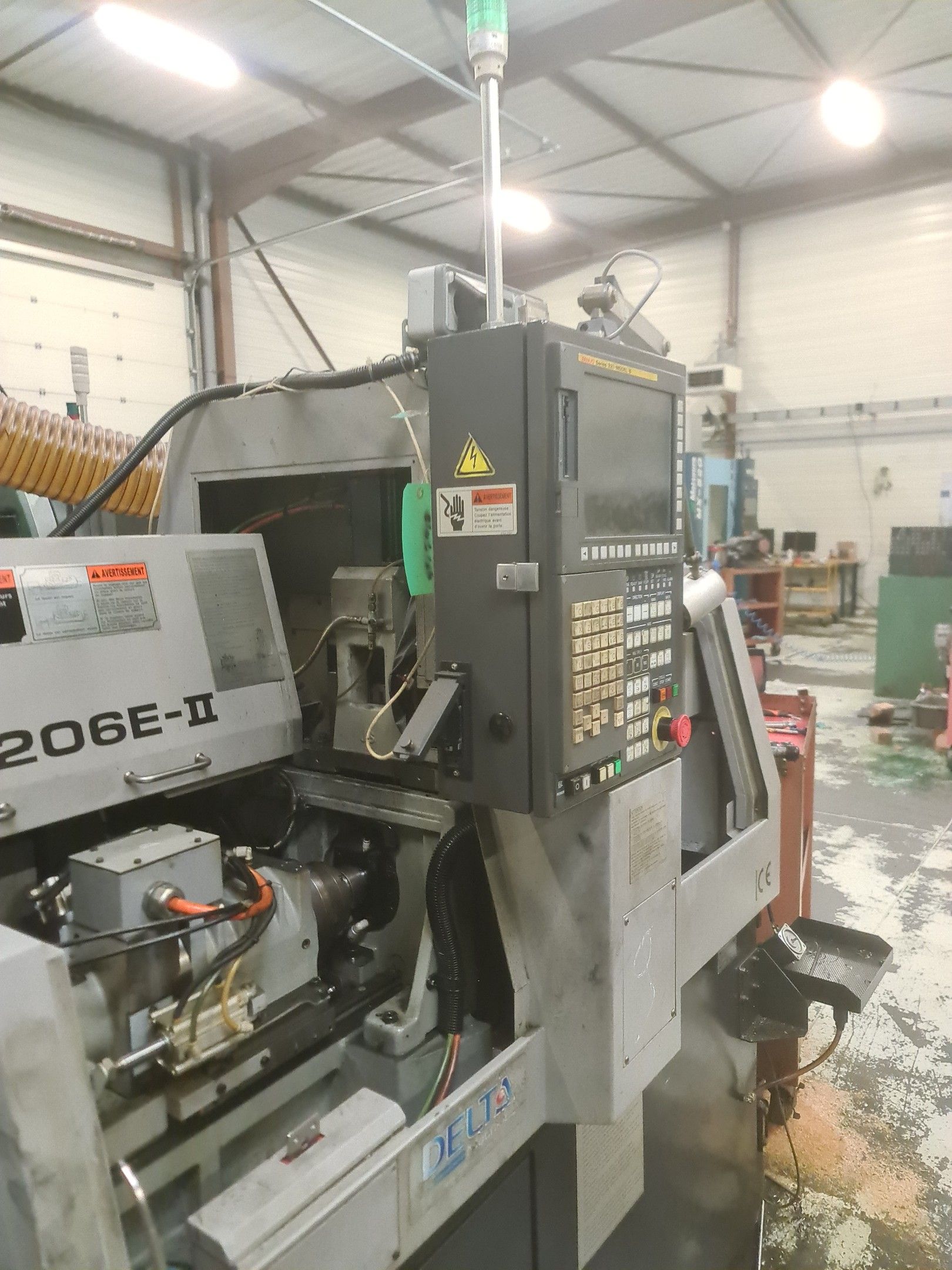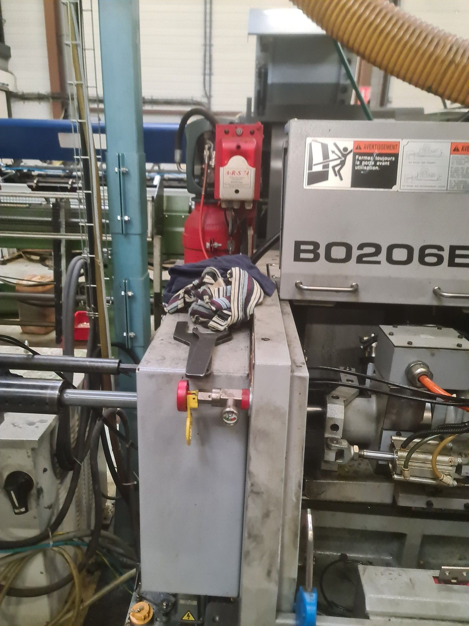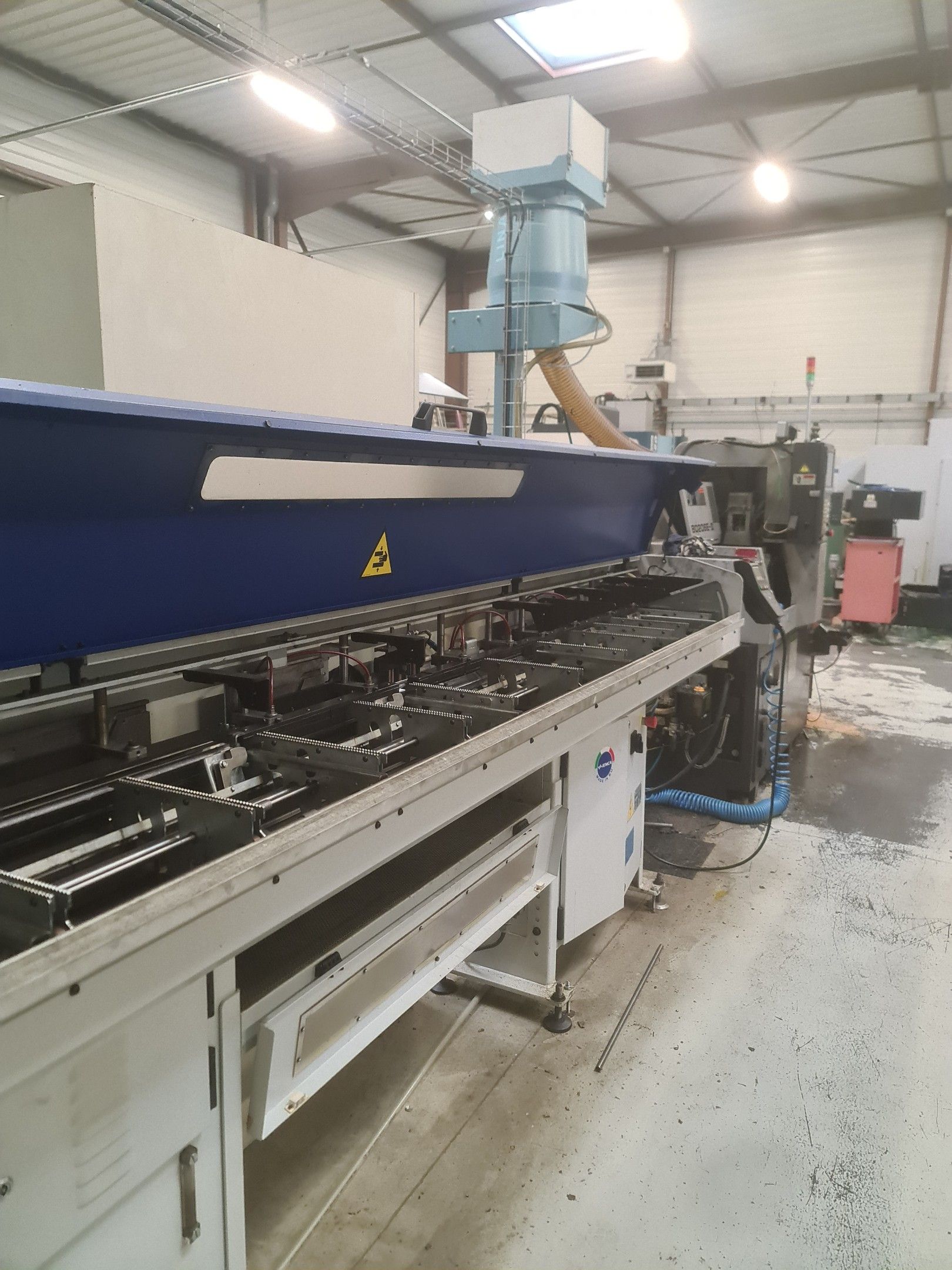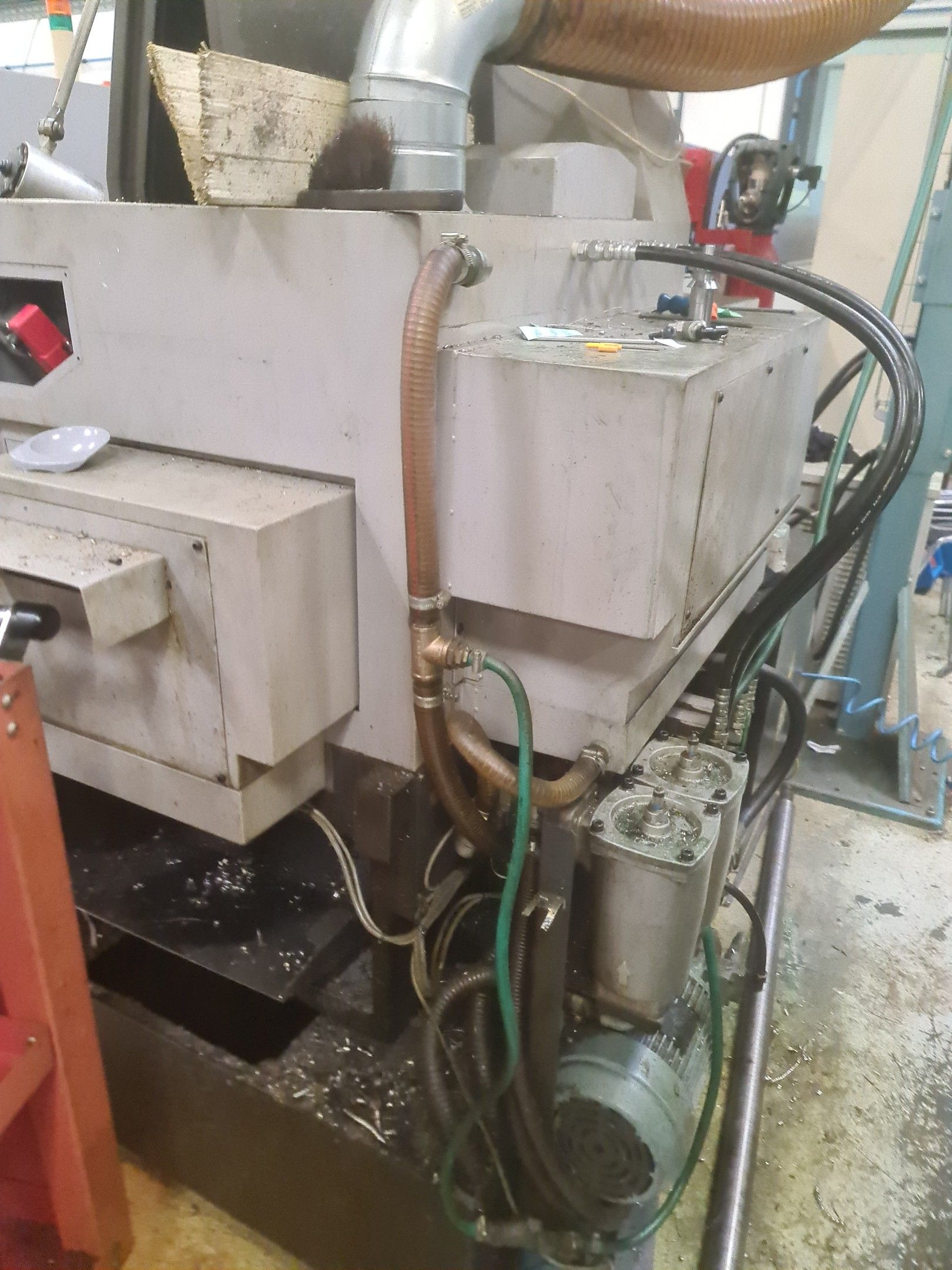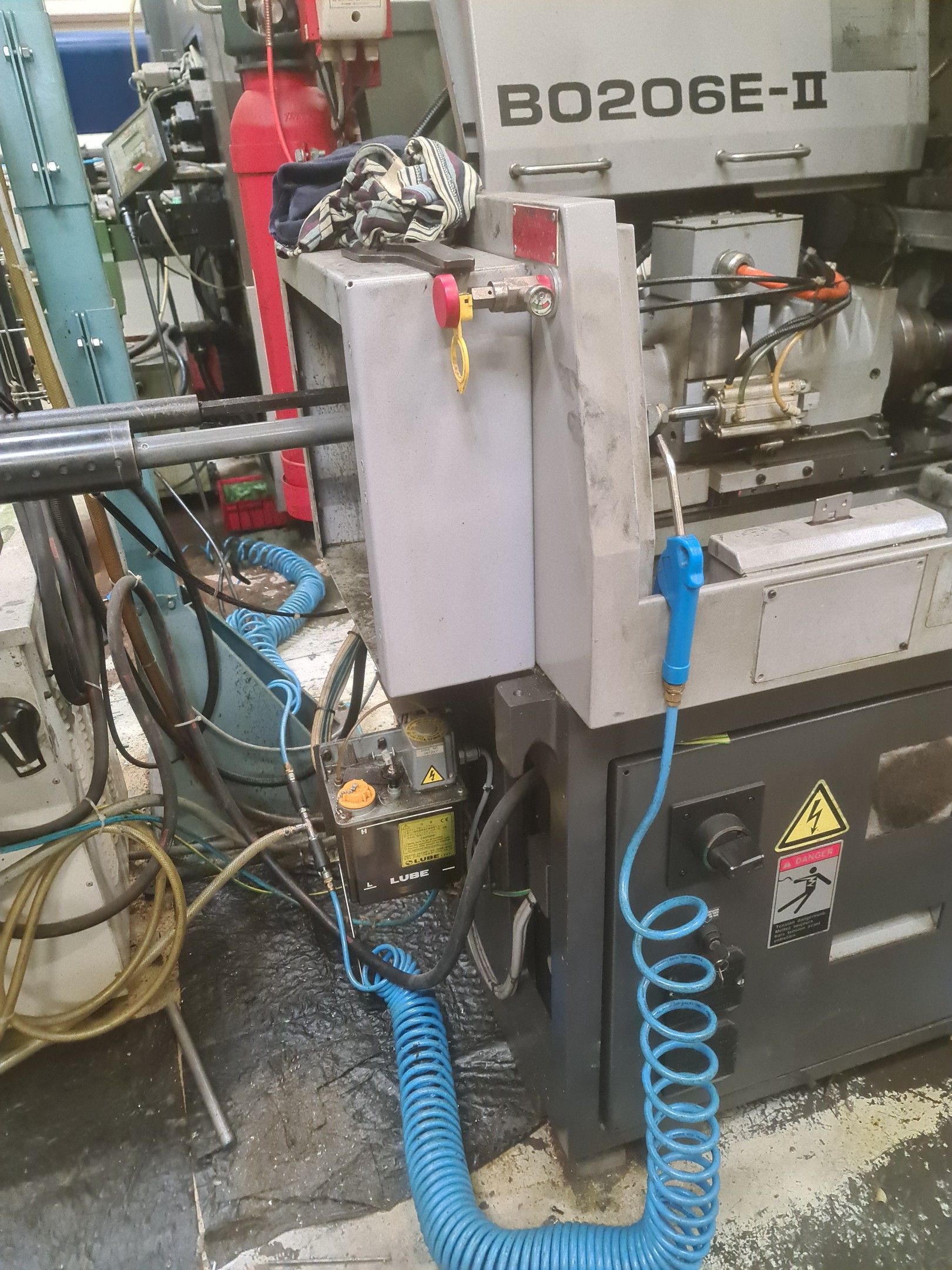 a TSUGAMI machining centre model BO206E-II, year 2014 with Fanuc Series 32i numerical control, model B, a suction system, a 2013 IEMCA Elite 220 bar feeder, a red metal sideboard, a metal cupboard, spout trays, tubes and metal parts.