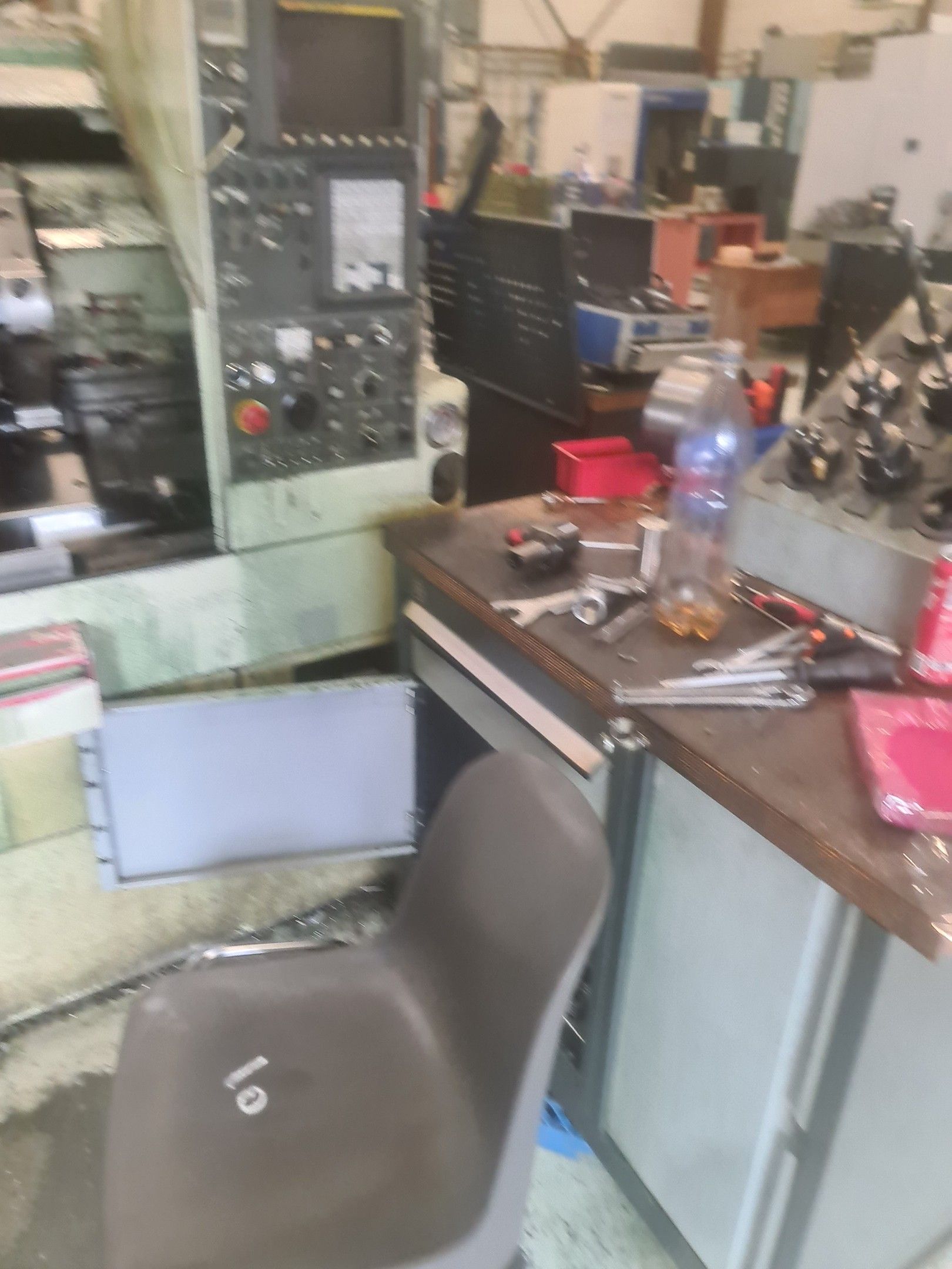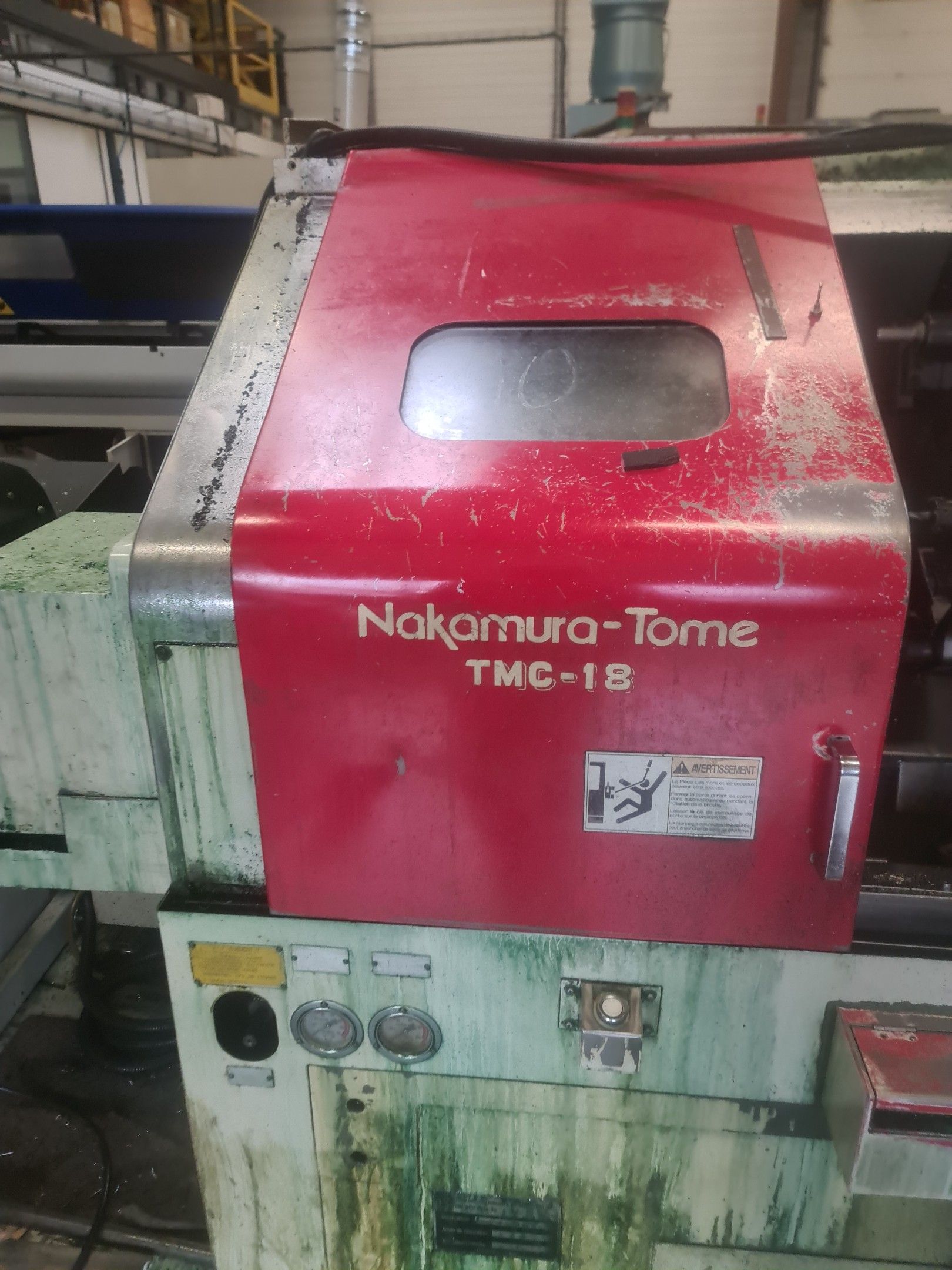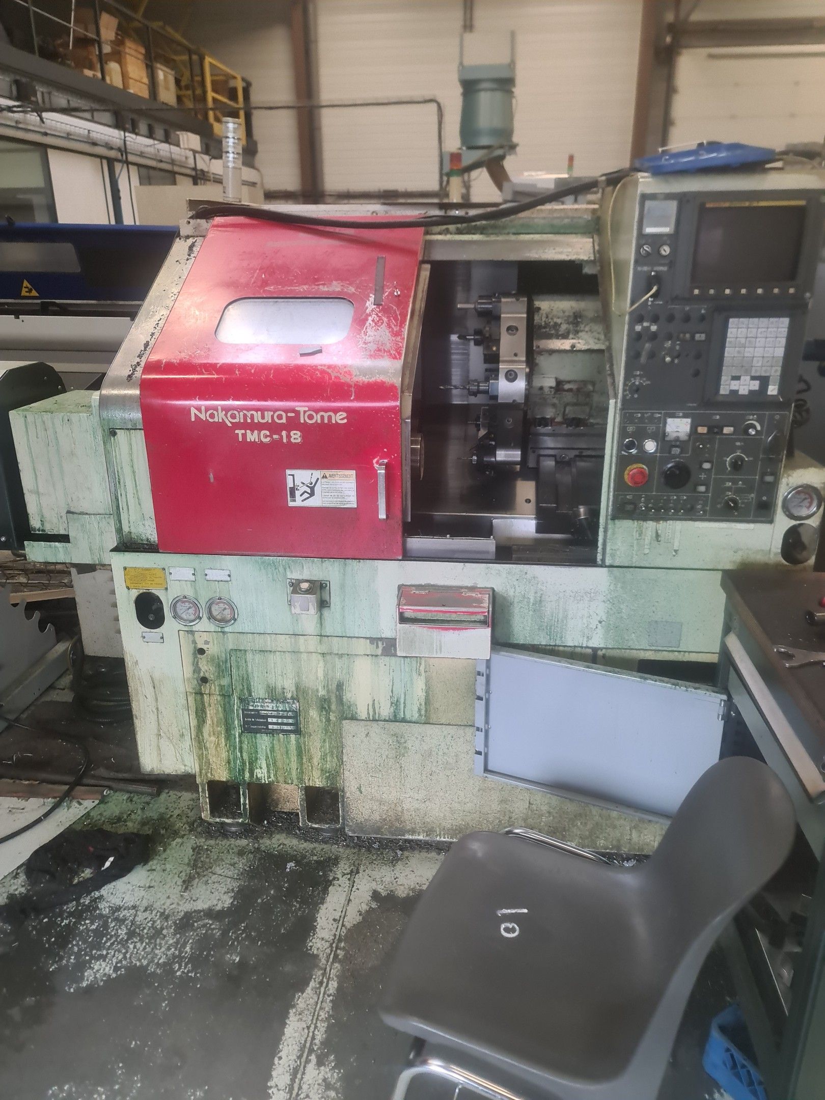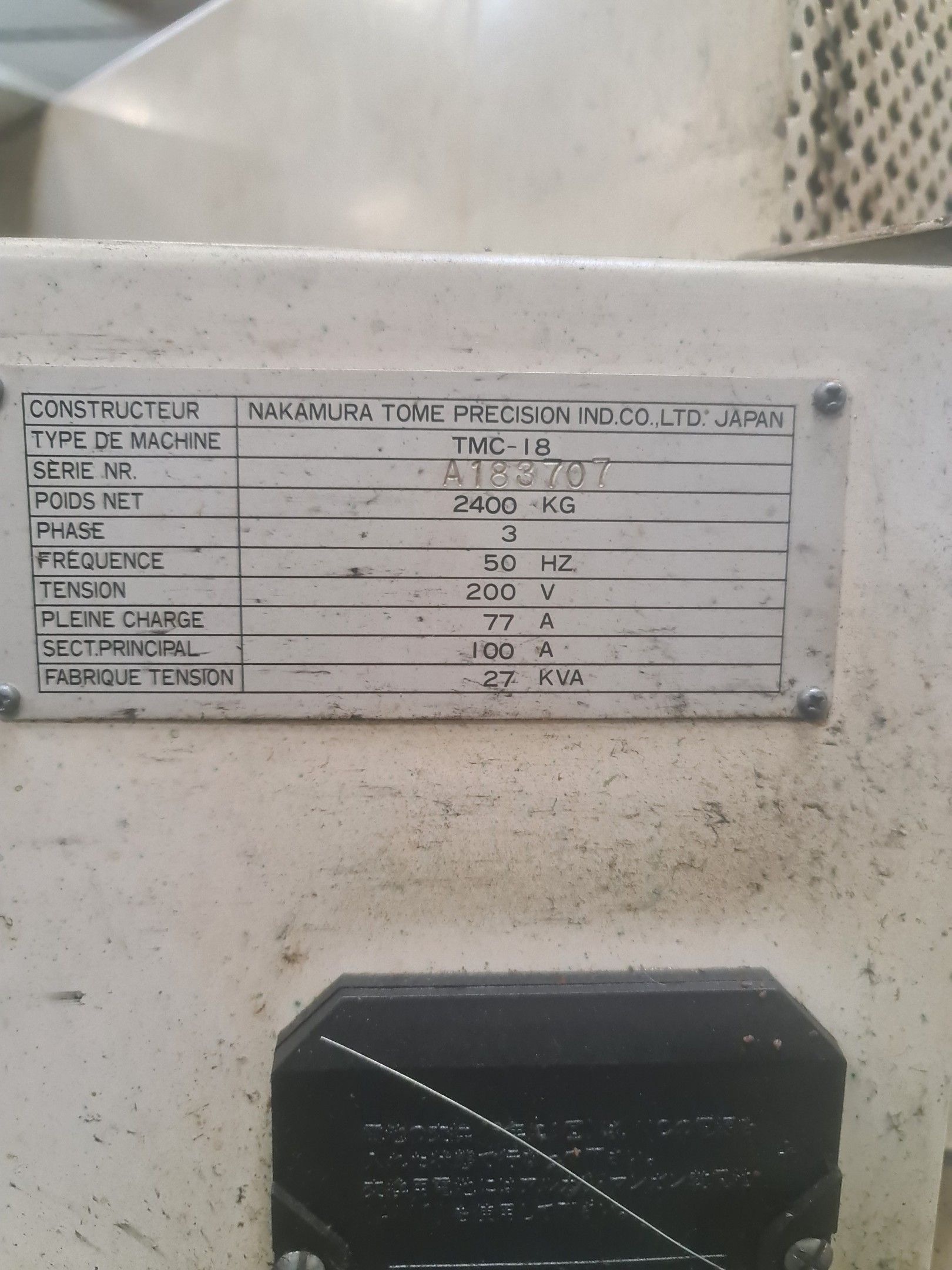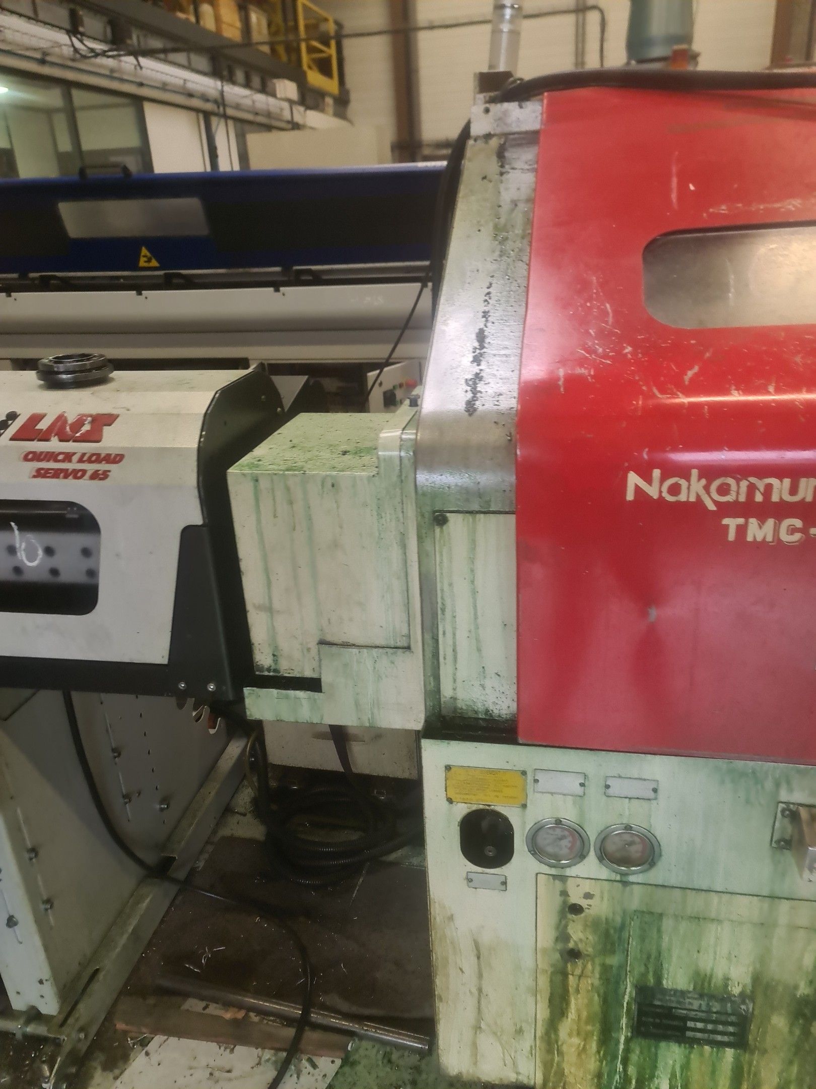 a NAKAMURA-TOME machining centre model TMC-18 year 1998, Meccanic Series 21 T numerical control, 2 grey wooden and metal workbenches with various accessories, LNS quick load servo 65 bar feeder, vice, an empty FACOM workshop trolley