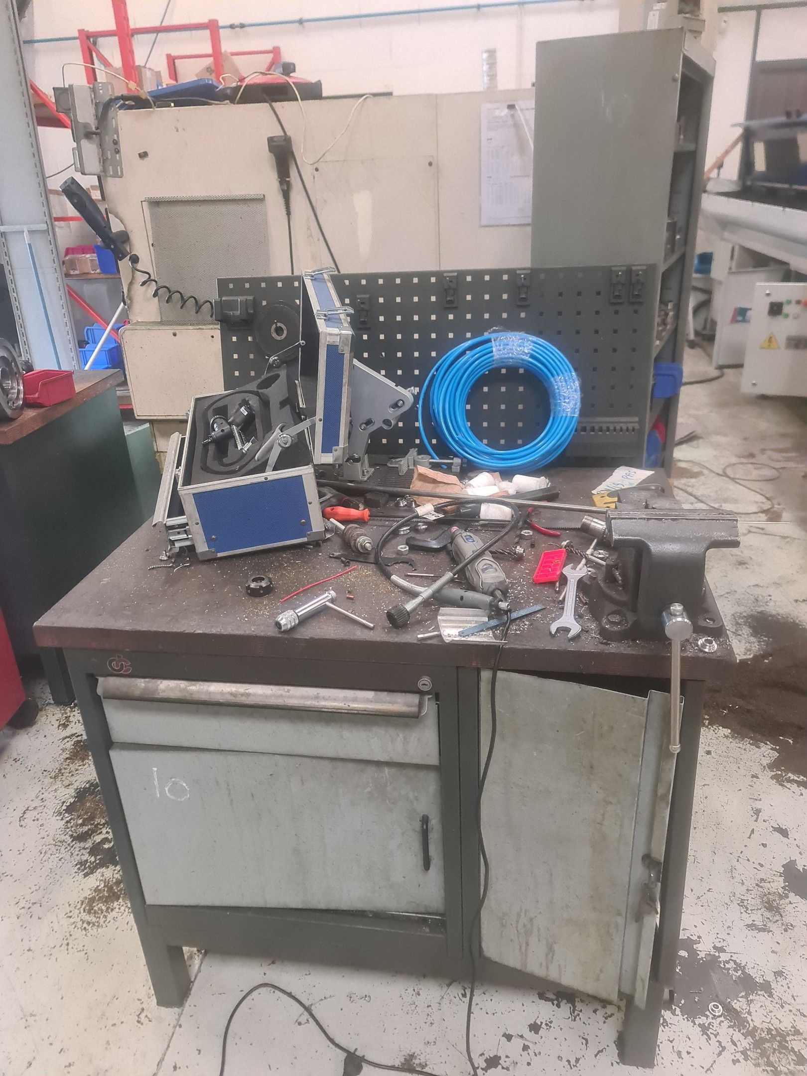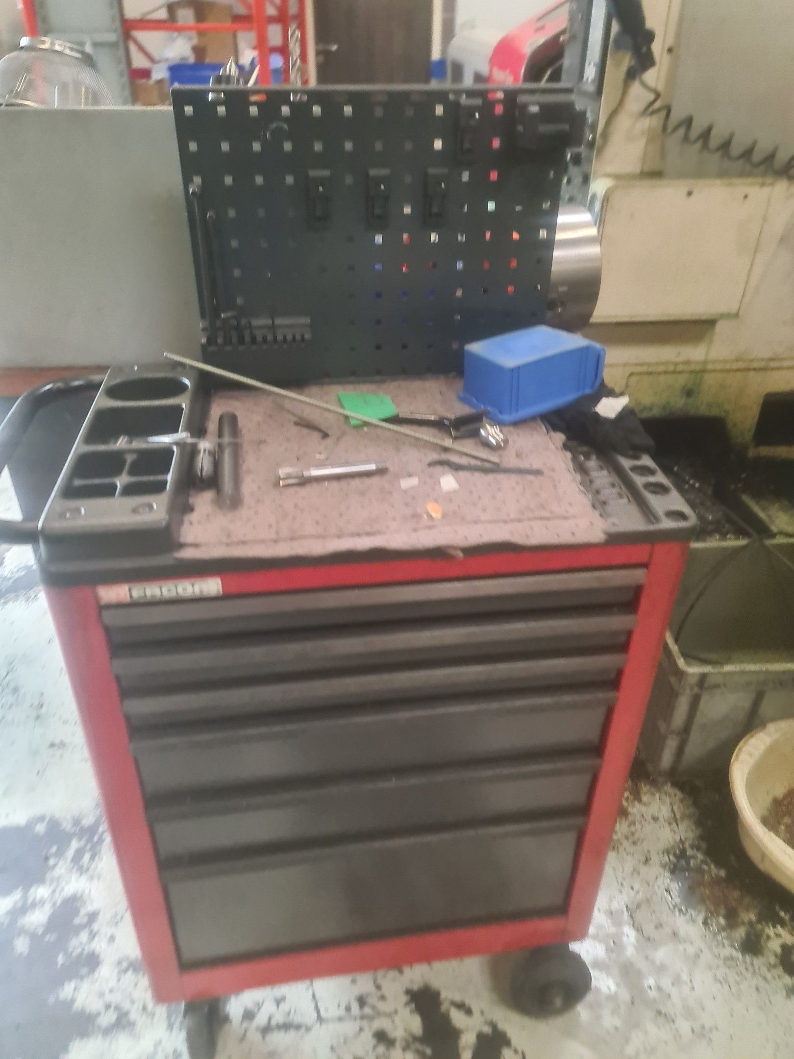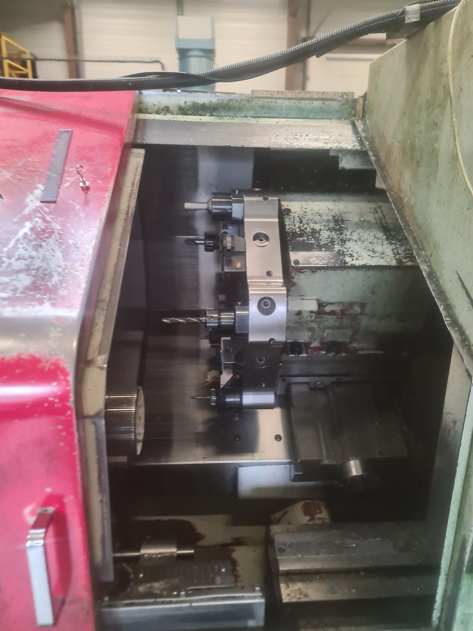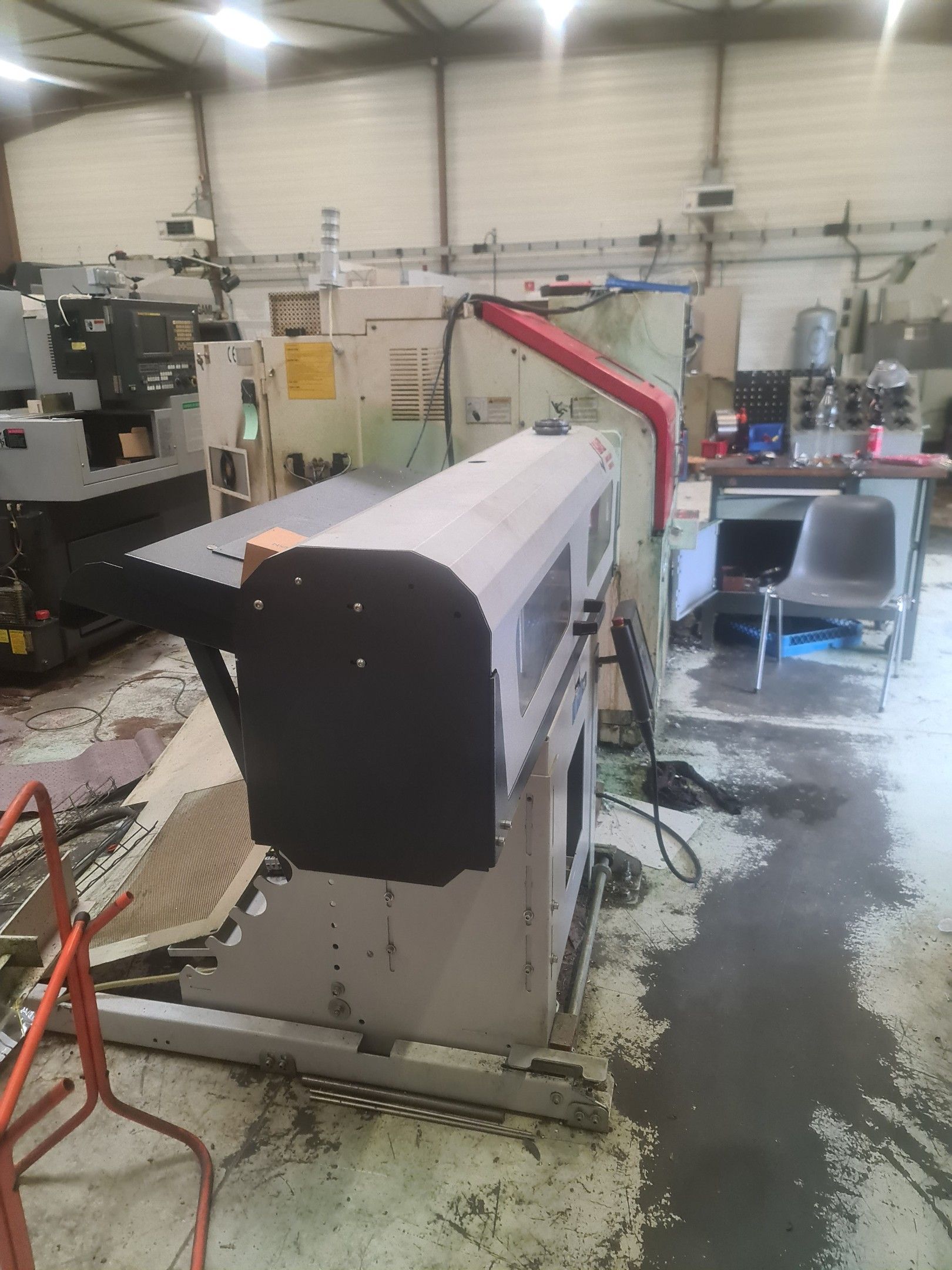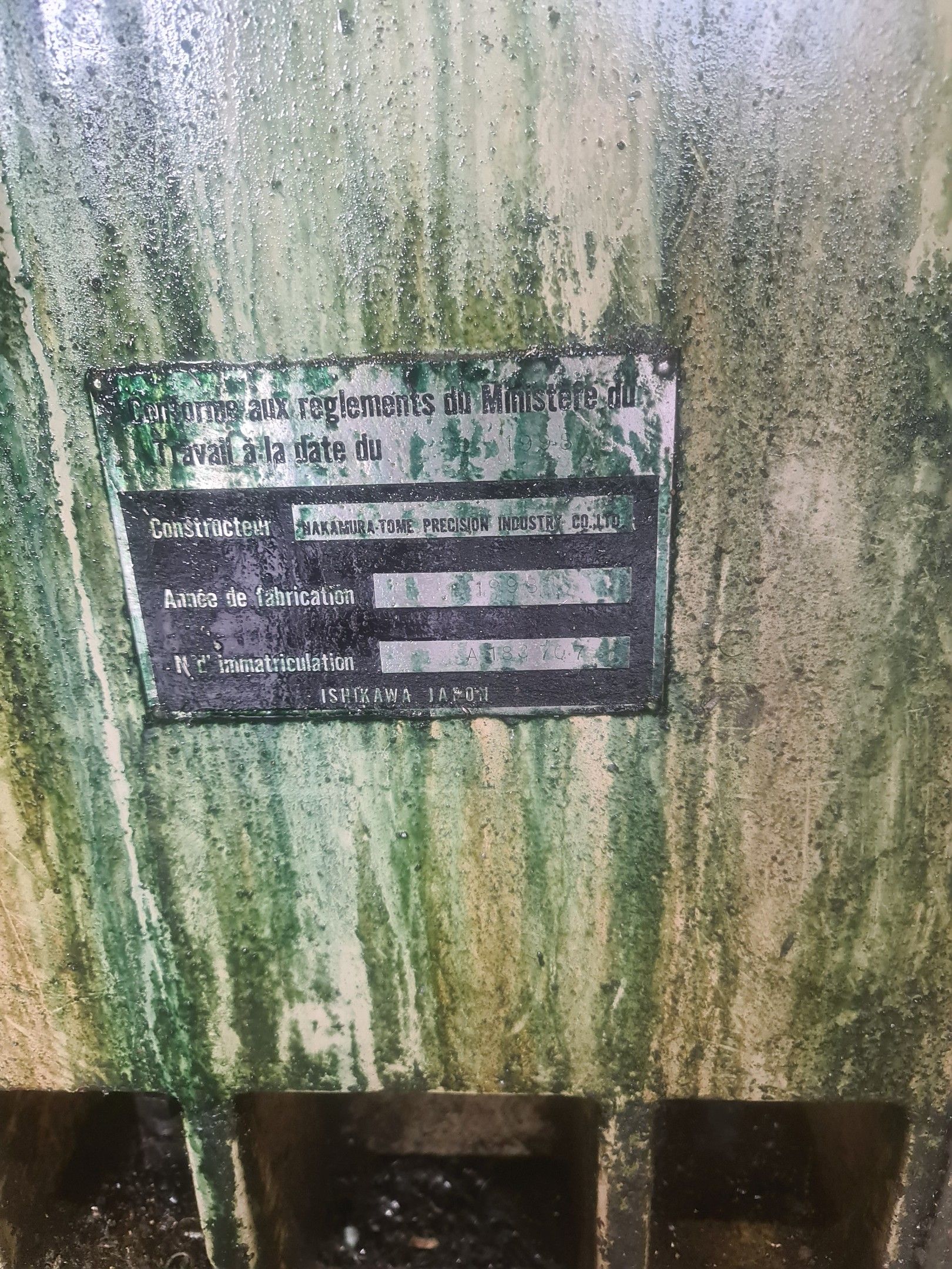 a NAKAMURA-TOME machining centre model TMC-18 year 1998, Meccanic Series 21 T numerical control, 2 grey wooden and metal workbenches with various accessories, LNS quick load servo 65 bar feeder, vice, an empty FACOM workshop trolley