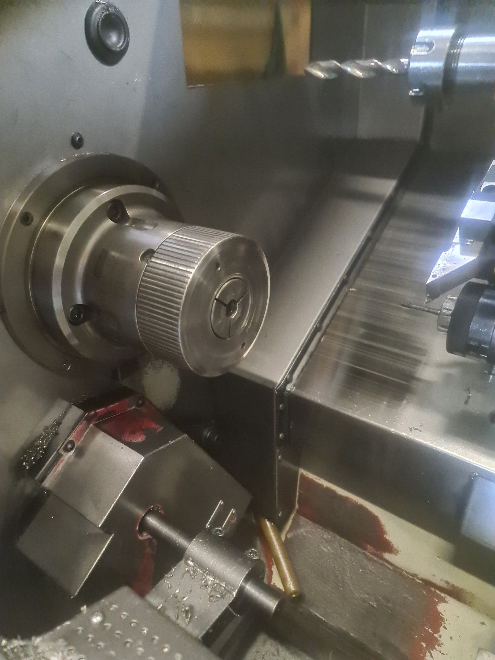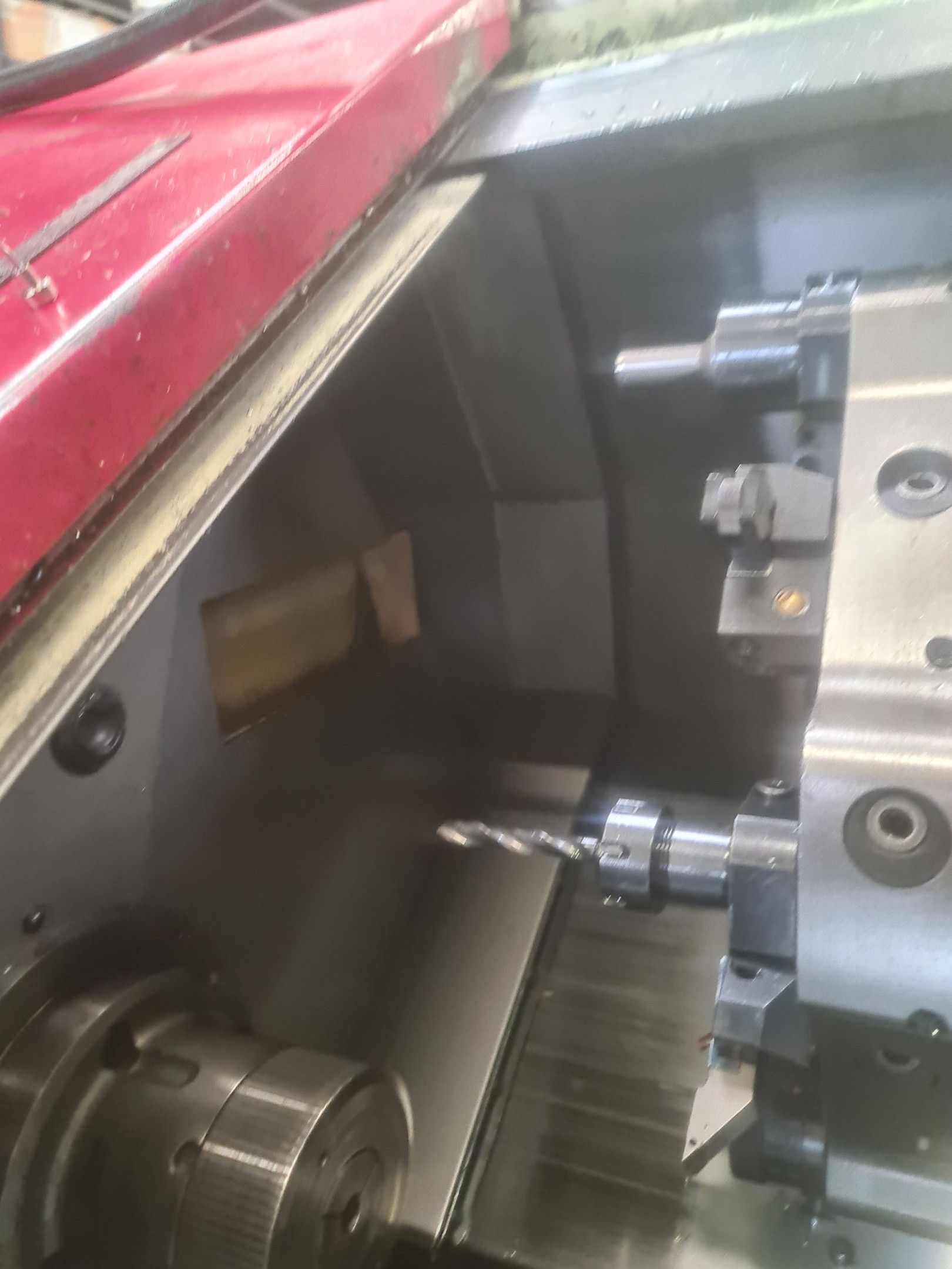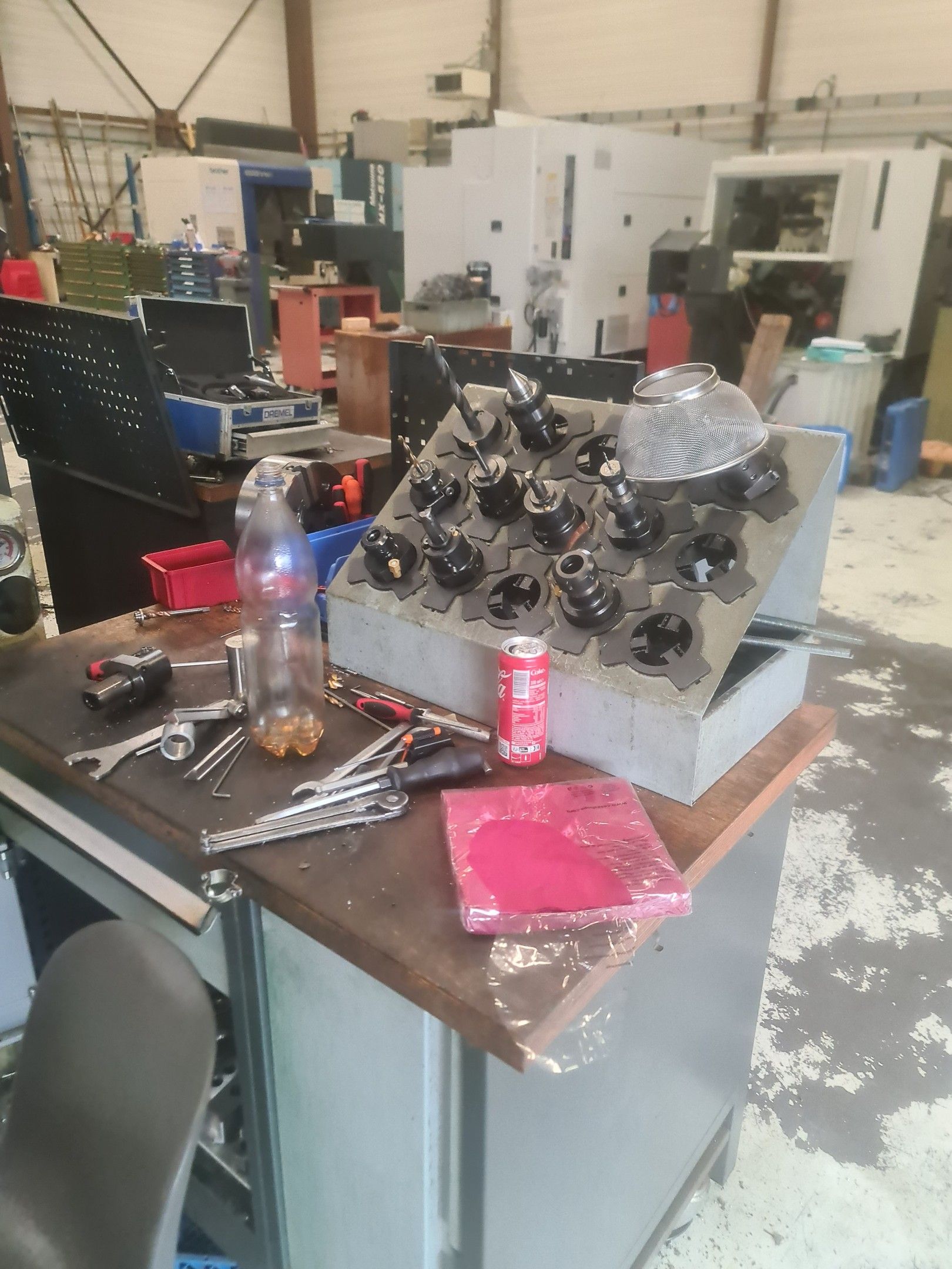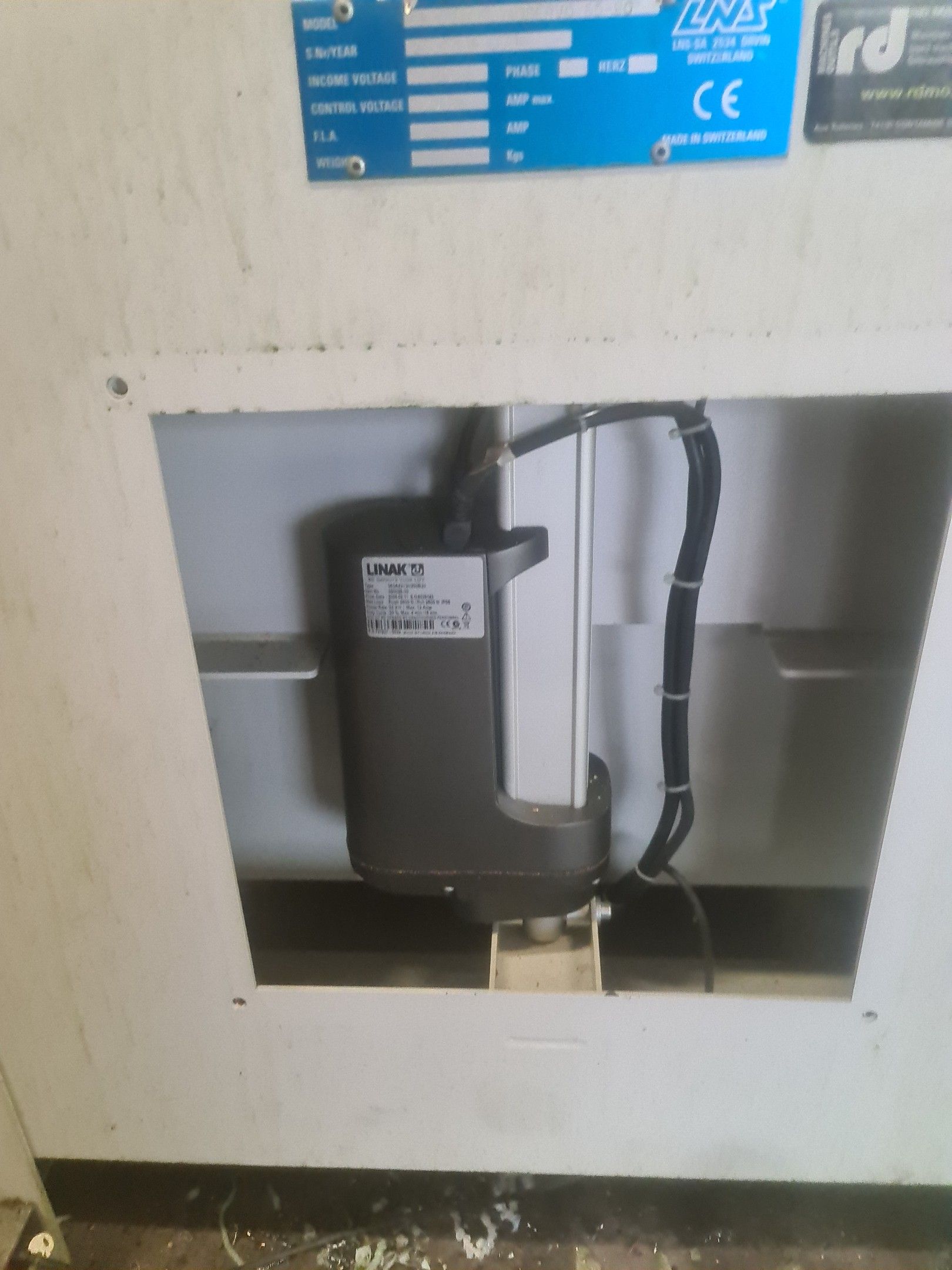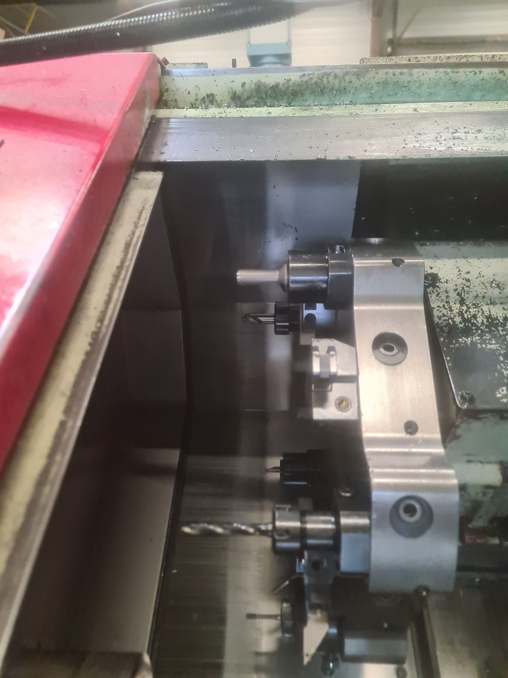 a NAKAMURA-TOME machining centre model TMC-18 year 1998, Meccanic Series 21 T numerical control, 2 grey wooden and metal workbenches with various accessories, LNS quick load servo 65 bar feeder, vice, an empty FACOM workshop trolley