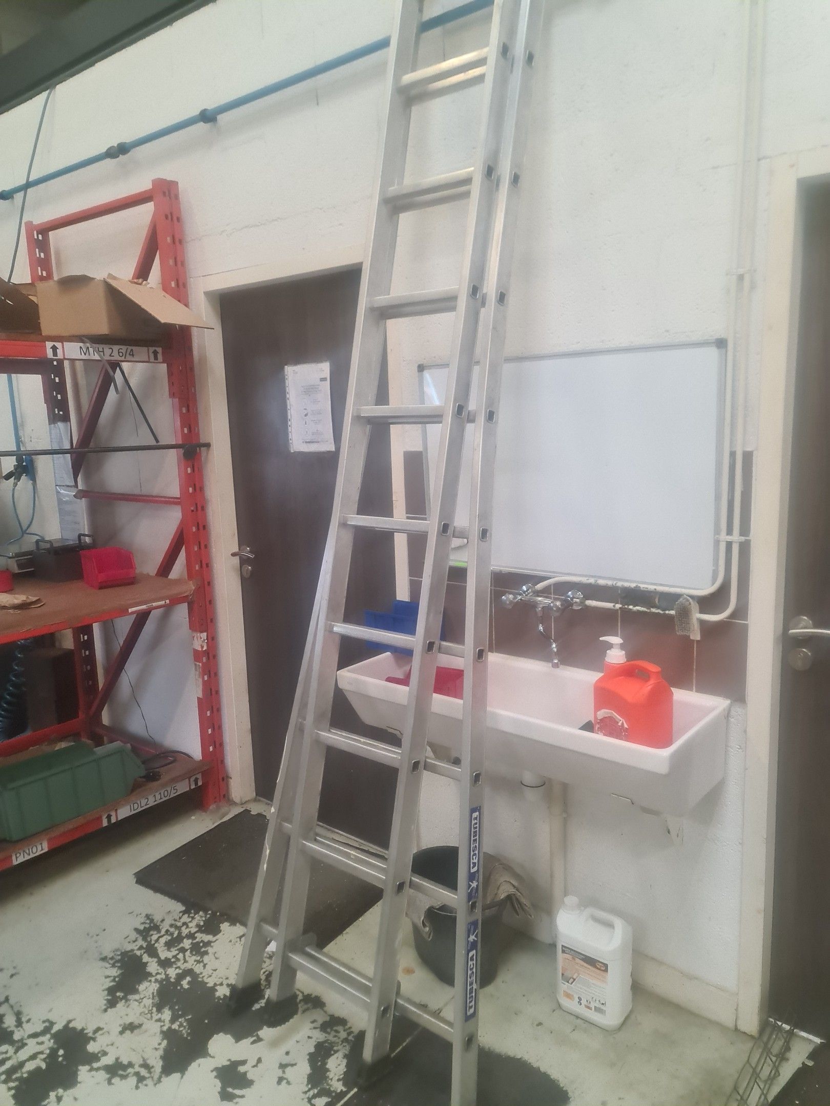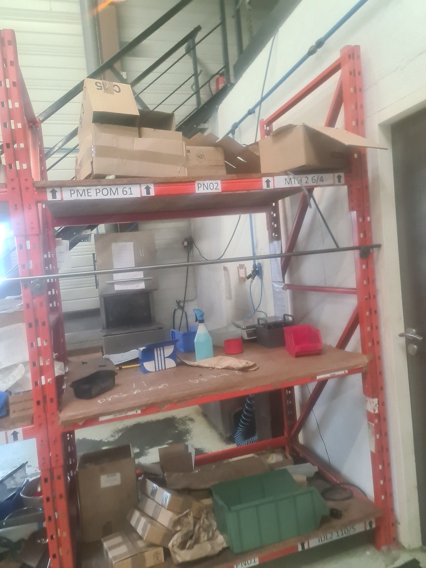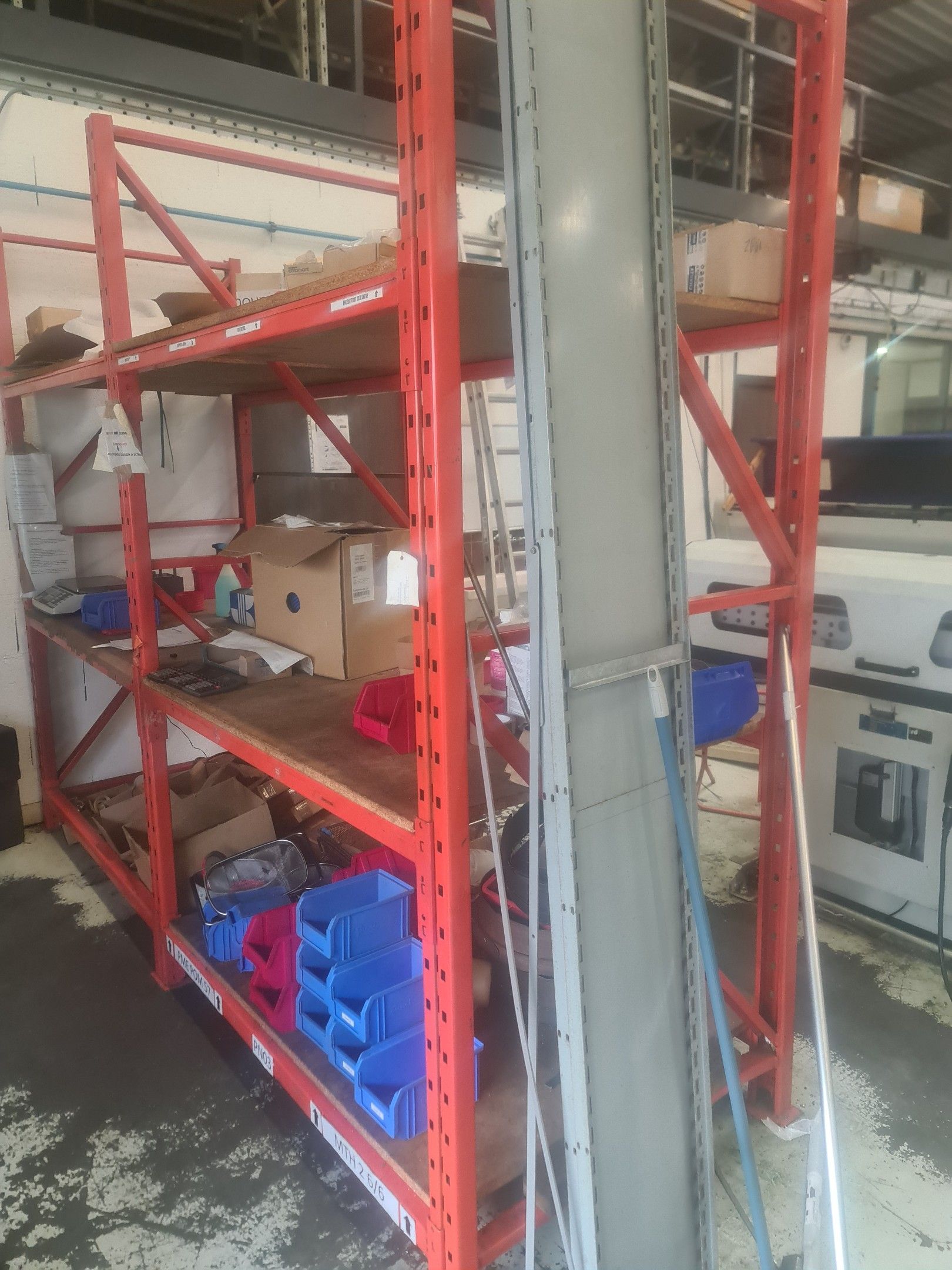 orange metal rack with laminated top, approximately three linear metres by three high metres, ladder, scales